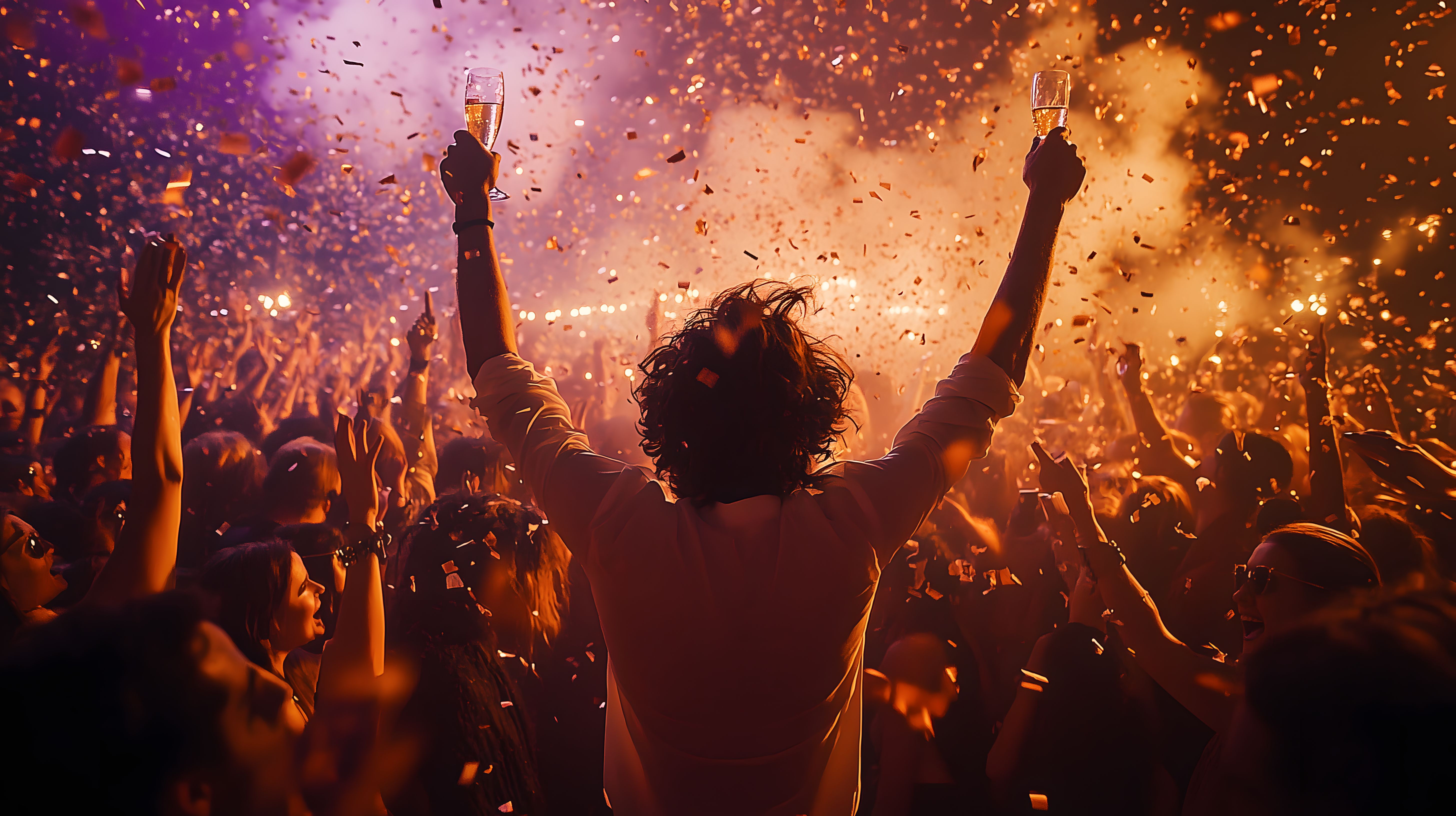 Das Bild zeigt eine Menschenmenge, die offensichtlich eine ausgelassene Silvesterparty feiert. Im Vordergrund sind die Silhouetten von Feiernden zu sehen, die ihre Hände in die Luft recken und Sektgläser hochhalten. Im Hintergrund ist ein Feuerwerk zu erkennen, das bunte Funken in die Luft schießt und der Szene eine festliche Atmosphäre verleiht. Die Stimmung wirkt extrem fröhlich und ausgelassen. Dieses Foto wäre ideal für die Verwendung in Blogs, Newslettern oder Social-Media-Beiträgen rund um das Thema Silvester, Neujahr oder Feierlichkeiten. Das Bild steht unter einer Creative-Commons-Lizenz zur kostenlosen Verwendung in hoher Auflösung zur Verfügung.