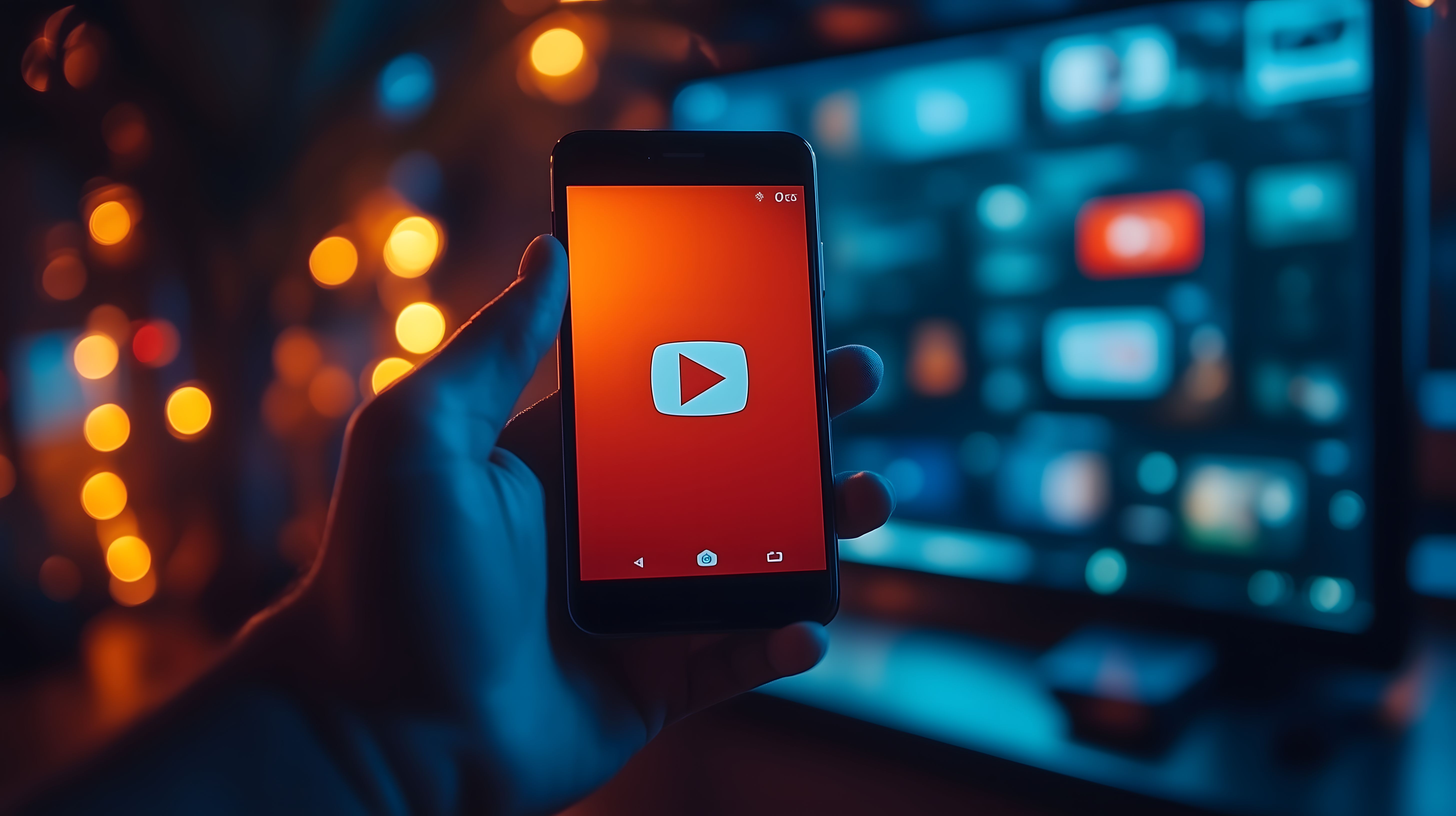 Das Bild zeigt ein Smartphone, das ein orangefarbenes YouTube-Logo auf dem Display anzeigt. Das Smartphone befindet sich in einer düsteren, verschwommenen Umgebung mit farbigen Lichtpunkten im Hintergrund, was einen stimmungsvollen, fast mystischen Eindruck erweckt. Das Foto könnte für verschiedene Zwecke wie Blogbeiträge, Newsletter, Social-Media-Inhalte oder Werbematerialien rund um YouTube, digitale Medien und Technologie verwendet werden. Als kostenloses Stockfoto in hoher Auflösung und unter Creative-Commons-Lizenz ist es vielseitig einsetzbar.