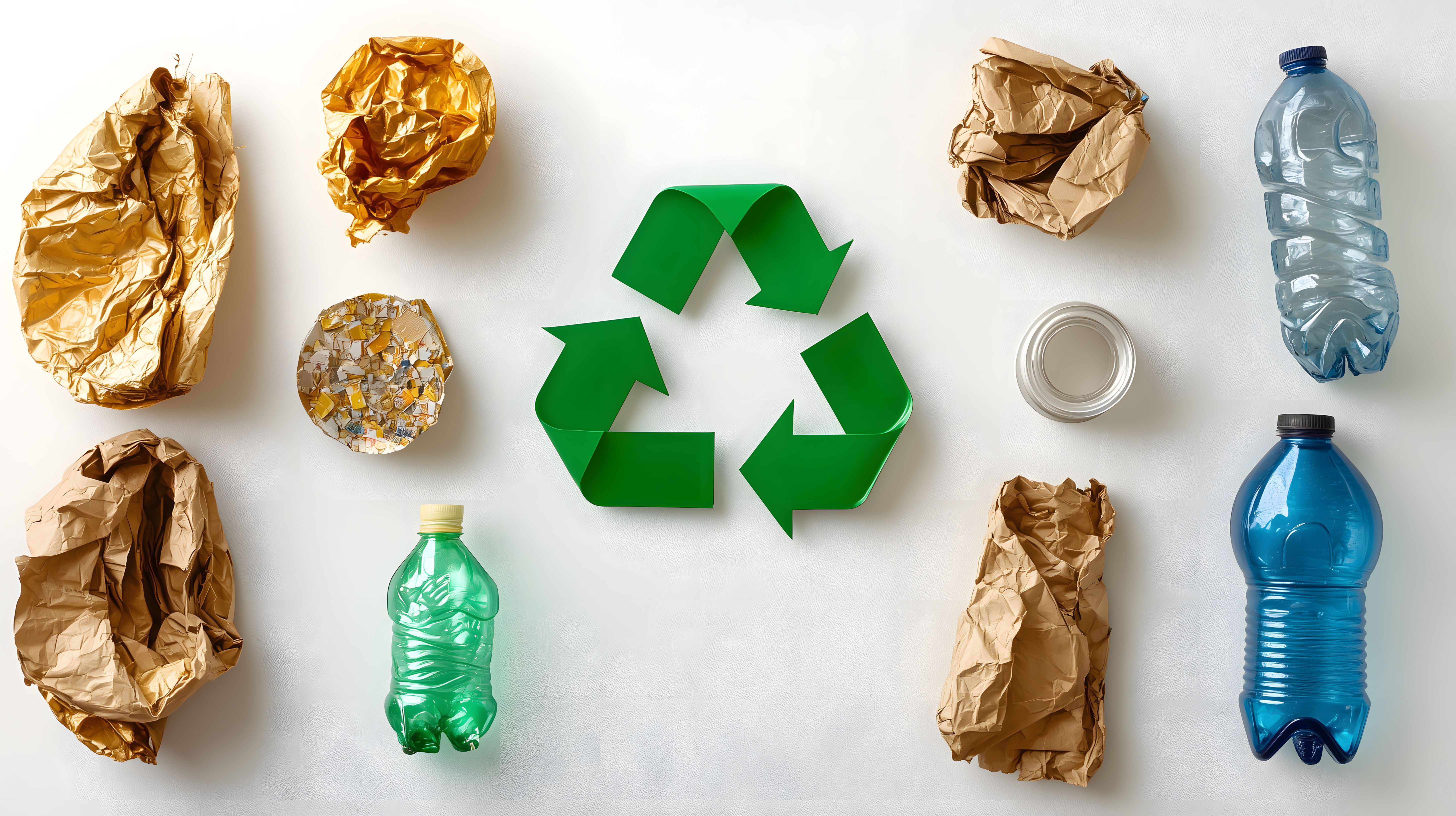 Dieses Foto zeigt ein ökologisches Recycling-Konzept mit verschiedenen wiederverwendbaren Materialien. Im Zentrum des Bildes befindet sich ein grünes Recycling-Symbol, umgeben von zerknülltem Papier, Plastikflaschen und einem Glasgefäß. Die Anordnung vermittelt einen minimalistischen, aufgeräumten Eindruck und hebt das Thema Nachhaltigkeit und Umweltschutz hervor. Das Foto eignet sich hervorragend für den Einsatz in Blogs, Newslettern, Social-Media-Beiträgen oder Werbekampagnen rund um Themen wie Kreislaufwirtschaft, Ressourceneffizienz und umweltfreundliches Verhalten. Als kostenloses Stockfoto in hoher Auflösung und unter Creative-Commons-Lizenz ist es vielseitig einsetzbar.