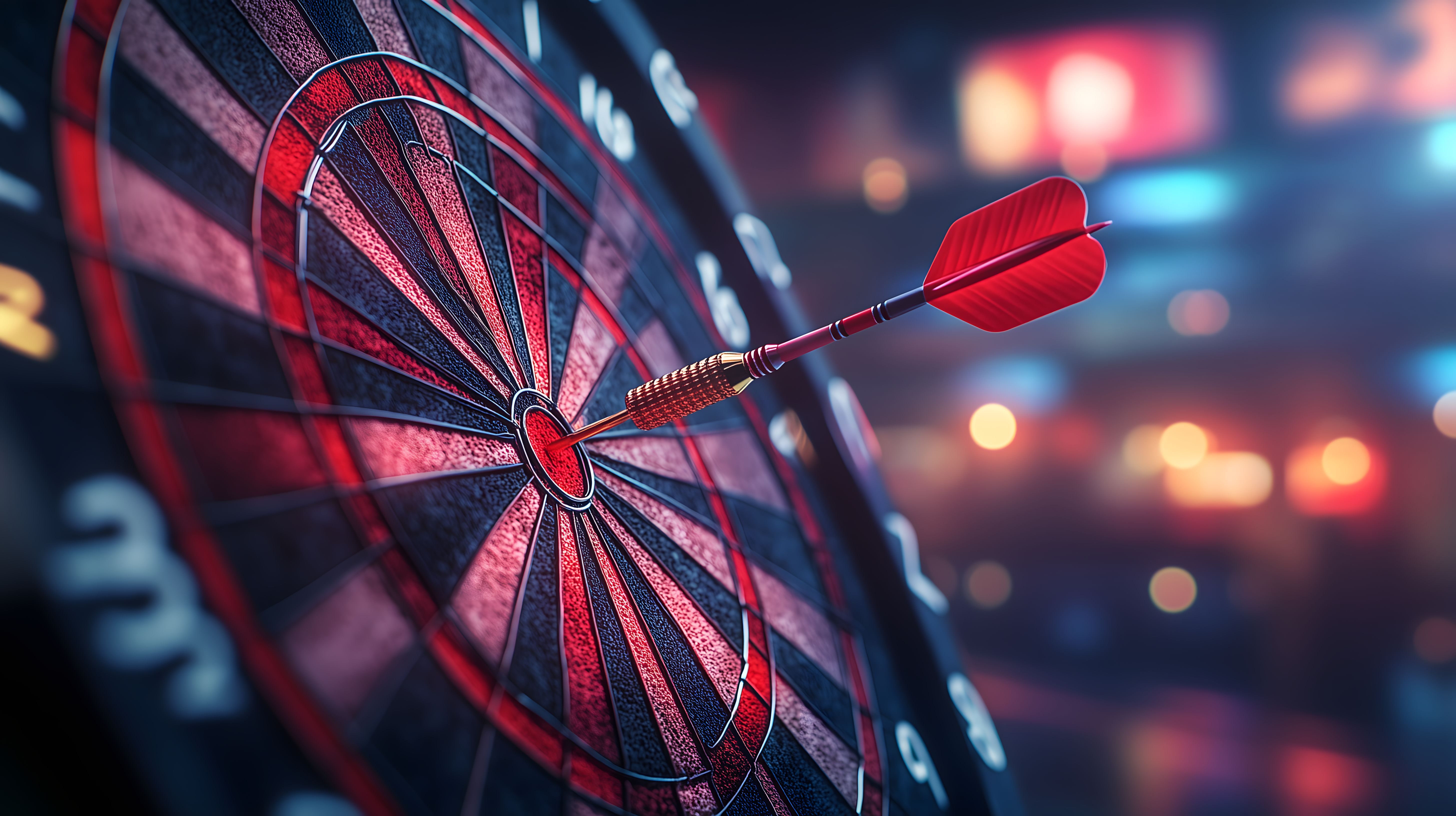 Das Bild zeigt eine Nahaufnahme einer Dartscheibe mit zwei roten Dartpfeilen, die das Bullseye getroffen haben. Die Scheibe ist verschwommen im Hintergrund zu sehen, während die Pfeile scharf und klar hervortreten. Das Bild vermittelt ein Gefühl von Präzision, Konzentration und Erfolg. Es eignet sich hervorragend für Verwendung in Blogbeiträgen, Newslettern, Social-Media-Kanälen oder Werbekampagnen, die Themen wie Sport, Wettbewerb, Zielstrebigkeit oder Freizeitaktivitäten aufgreifen. Das hochauflösende Bild ist unter einer Creative-Commons-Lizenz frei verfügbar.