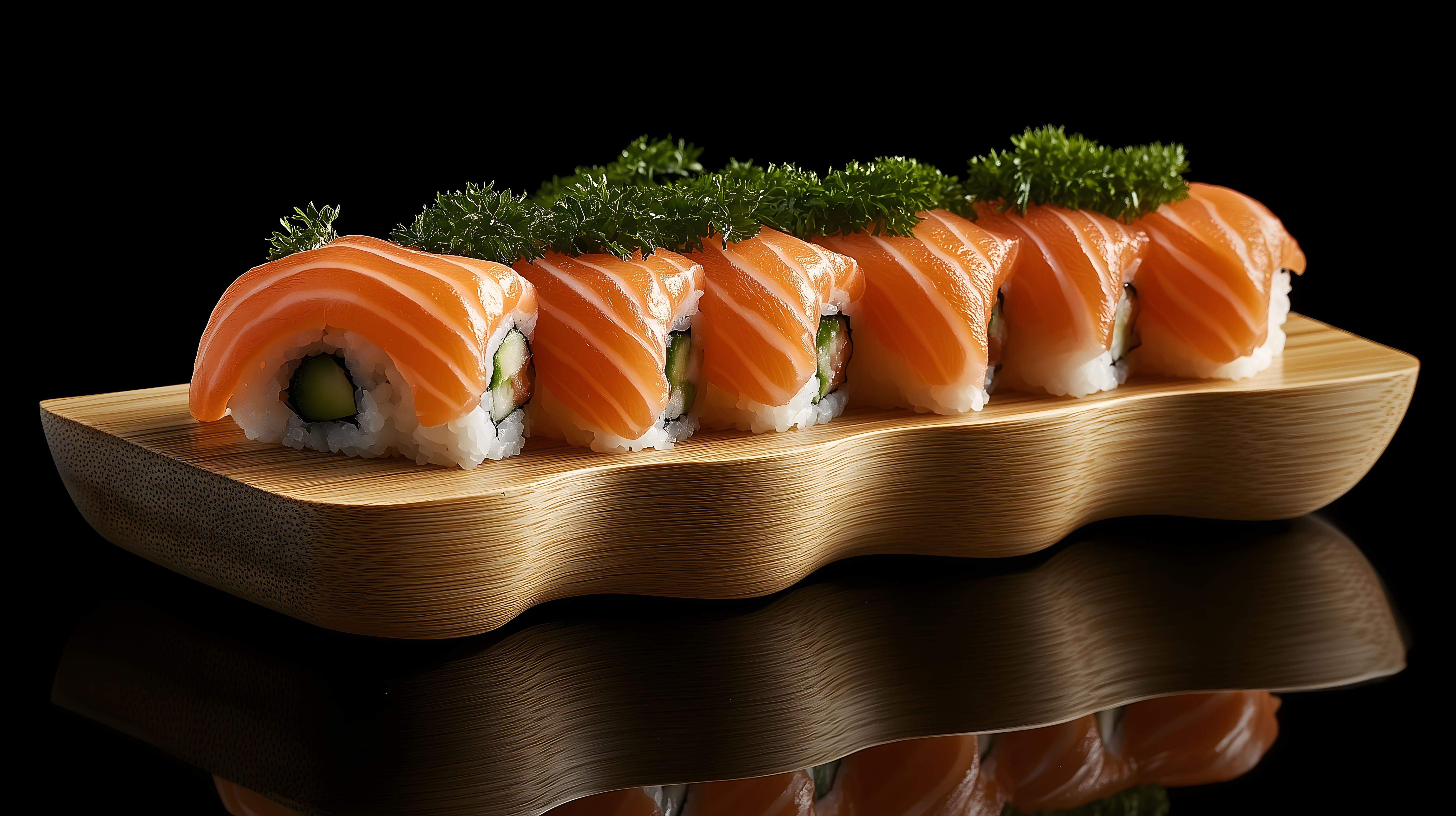 Dieses eindrucksvolle Stockfoto zeigt eine Reihe kreativ arrangierter Sushi-Rollen auf einer eleganten Bambusplatte. Die knallorange Farbe des frischen Lachses bildet einen starken Kontrast zum dunklen Hintergrund und den grünen Dekorelementen, was eine appetitliche und hochwertige Optik erzeugt. Das Bild eignet sich perfekt für den Einsatz in Blogbeiträgen, Social-Media-Kanälen oder Werbekampagnen rund um das Thema japanische Küche, Feinschmeckergerichte oder gesunde Ernährung. Dieses kostenlose Stockfoto in hoher Auflösung steht unter der Creative-Commons-Lizenz zur Verfügung.