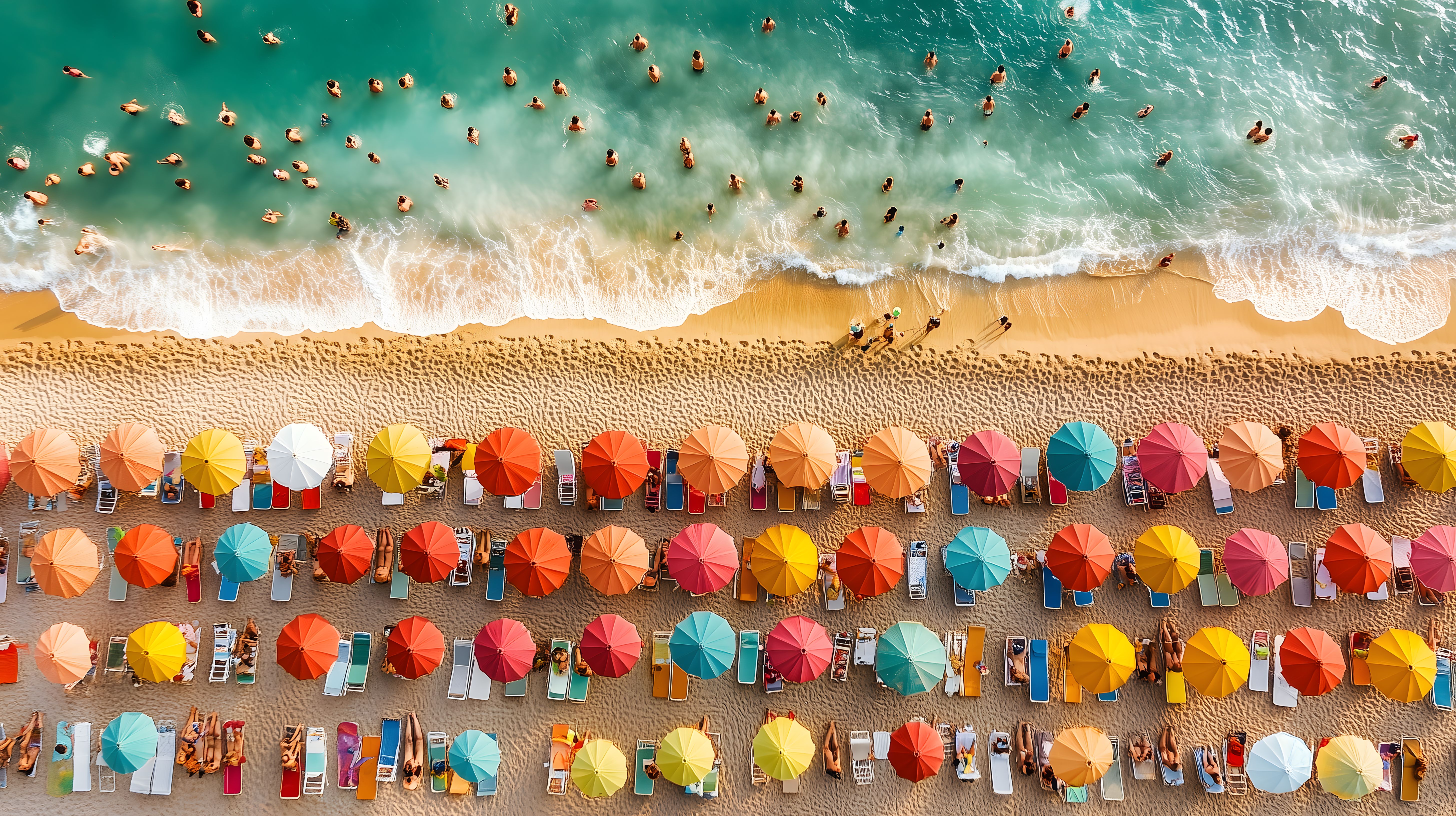 Das Bild zeigt eine luftige Drohnenaufnahme eines Strands, der dicht mit farbenfrohen Sonnenschirmen und Liegestühlen übersät ist. Hunderte von Badegästen genießen auf dem goldfarbenen Sand das kristallklare Meerwasser und den sommerlichen Sonnengenuss. Die Perspektive von oben lässt die perfekt angeordneten Schirme in einem faszinierenden Farbmuster erscheinen - von zarten Pastelltönen bis hin zu kräftigen Rottönen ist alles vertreten. Dieses Foto strahlt pure Urlaubsfreude und Erholung aus und lässt sich perfekt in Blogs, Newslettern, Social-Media-Beiträgen oder Werbekampagnen für Tourismus, Reiseangebote oder sommerliche Produkte einsetzen. Als hochauflösendes, kostenloses Stockfoto unter einer Creative-Commons-Lizenz ist es für vielfältige Einsatzzwecke frei nutzbar.