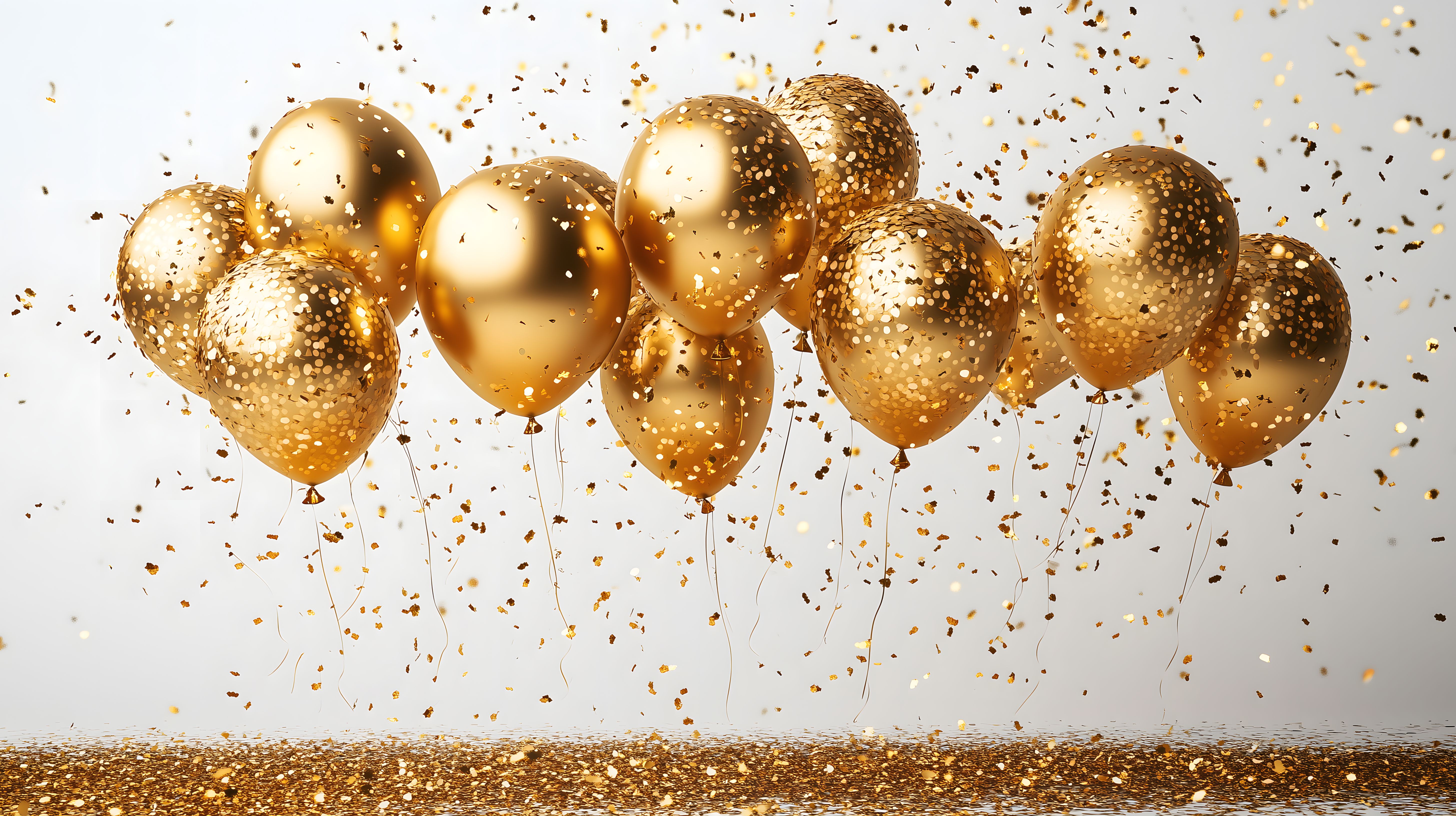 Dieses Bild zeigt eine festliche Anordnung von goldenen Luftballons, die von funkelnden Konfettistückchen umgeben sind. Die Ballons haben eine glänzende, metallische Oberfläche, die den Eindruck von Luxus und Eleganz vermittelt. Die Konfetti verteilen sich über den gesamten Bildbereich und sorgen für eine dynamische, fröhliche Stimmung.