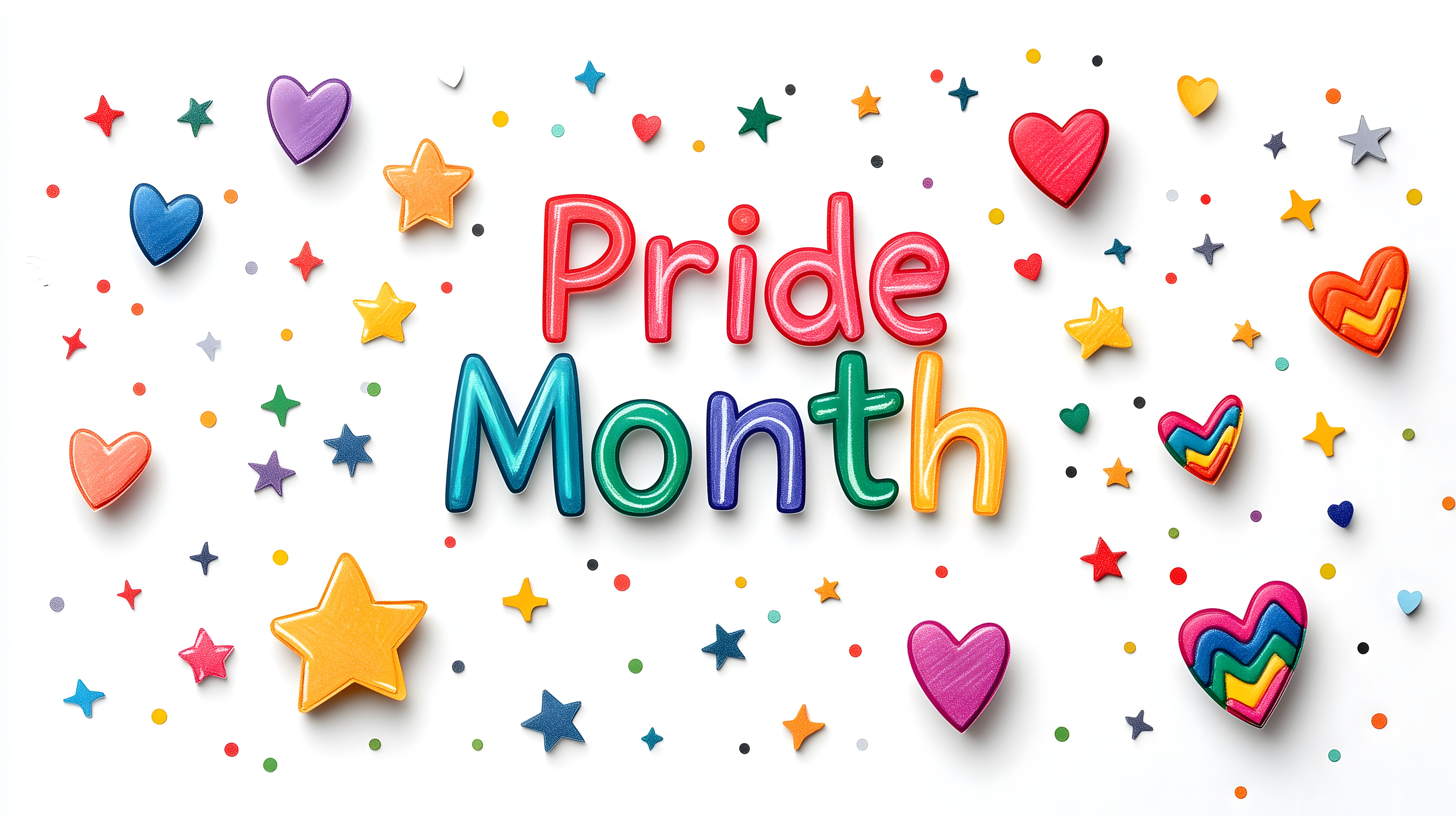 Das Bild zeigt ein buntes und fröhliches Design zum Pride Month. Es präsentiert eine Vielzahl an herzförmigen und sternförmigen Elementen in verschiedenen leuchtenden Regenbogenfarben, die über den weißen Hintergrund verteilt sind. Das Arrangement wirkt dynamisch und einladend, perfekt für die Verwendung in Blogbeiträgen, Newsletter-Gestaltung, Social-Media-Postings oder Werbematerialien rund um Pride-Feierlichkeiten und LGBTQ+-Themen. Als kostenloses, hochauflösendes Stockfoto unter einer Creative-Commons-Lizenz eignet es sich ideal für kreative Projekte, bei denen ein positiv-bunter, feierlicher Charakter gefragt ist.