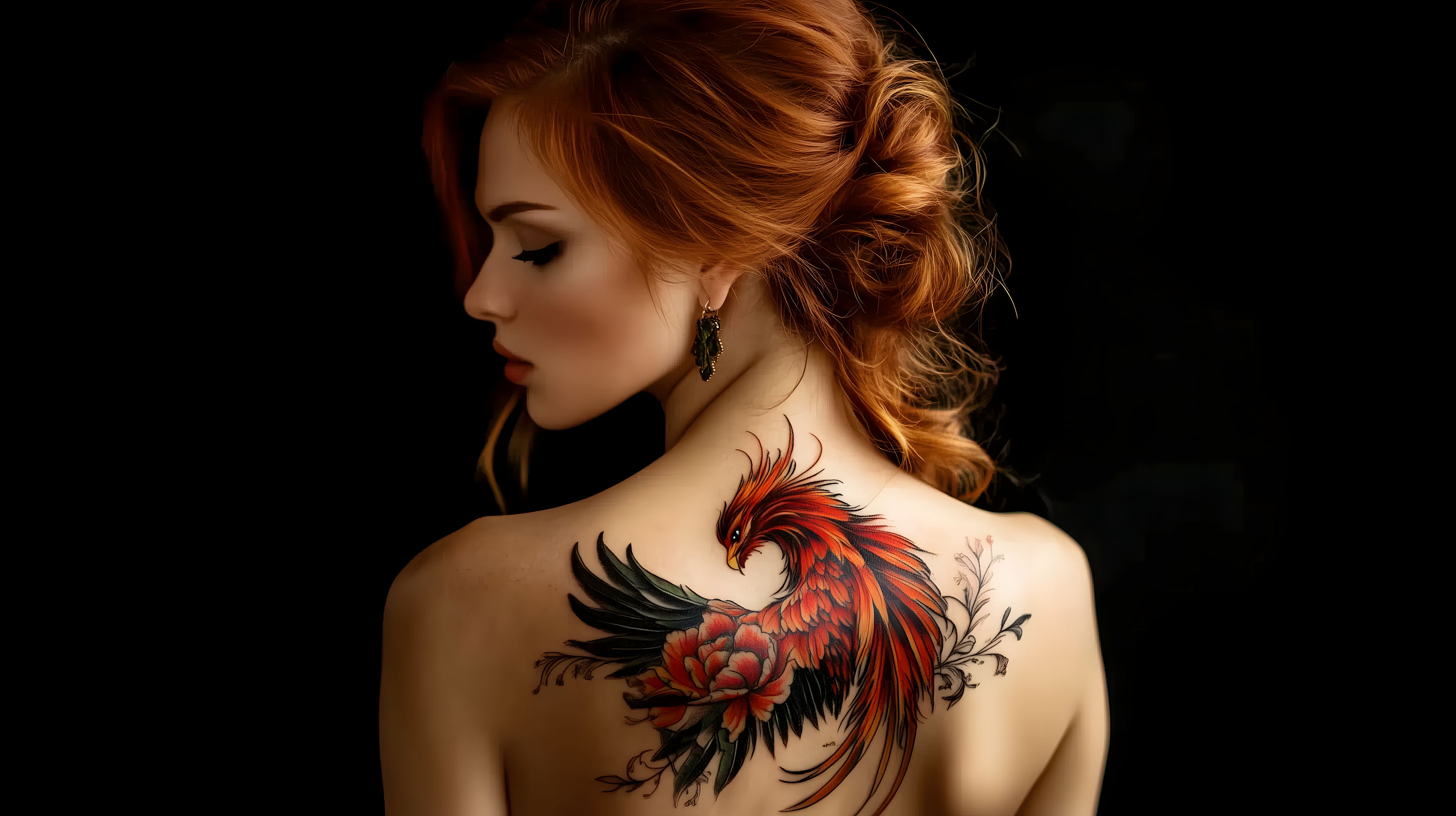 Dieses faszinierende Stockfoto zeigt eine Frau mit langen, rotbraunen Haaren, die ihr markantes Tattoo auf dem Rücken präsentiert. Die detailreiche Tätowierung zeigt einen mystischen Phönix-Vogel mit feurig-roten Federn und einer prächtigen Blume. Die Pose der Frau, halb im Profil und mit leicht geneigtem Kopf, verleiht dem Bild eine elegante und geheimnisvolle Ausstrahlung. Die dunkle Hintergrundfarbe hebt die Farben und Details der Tätowierung besonders hervor. Dieses hochauflösende Bild eignet sich ideal für den Einsatz in Blogs, Websites, Werbekampagnen oder Social-Media-Posts, die eine kreative und kunstvolle Ästhetik vermitteln möchten. Es steht unter der Creative Commons-Lizenz zur kostenlosen Nutzung zur Verfügung.