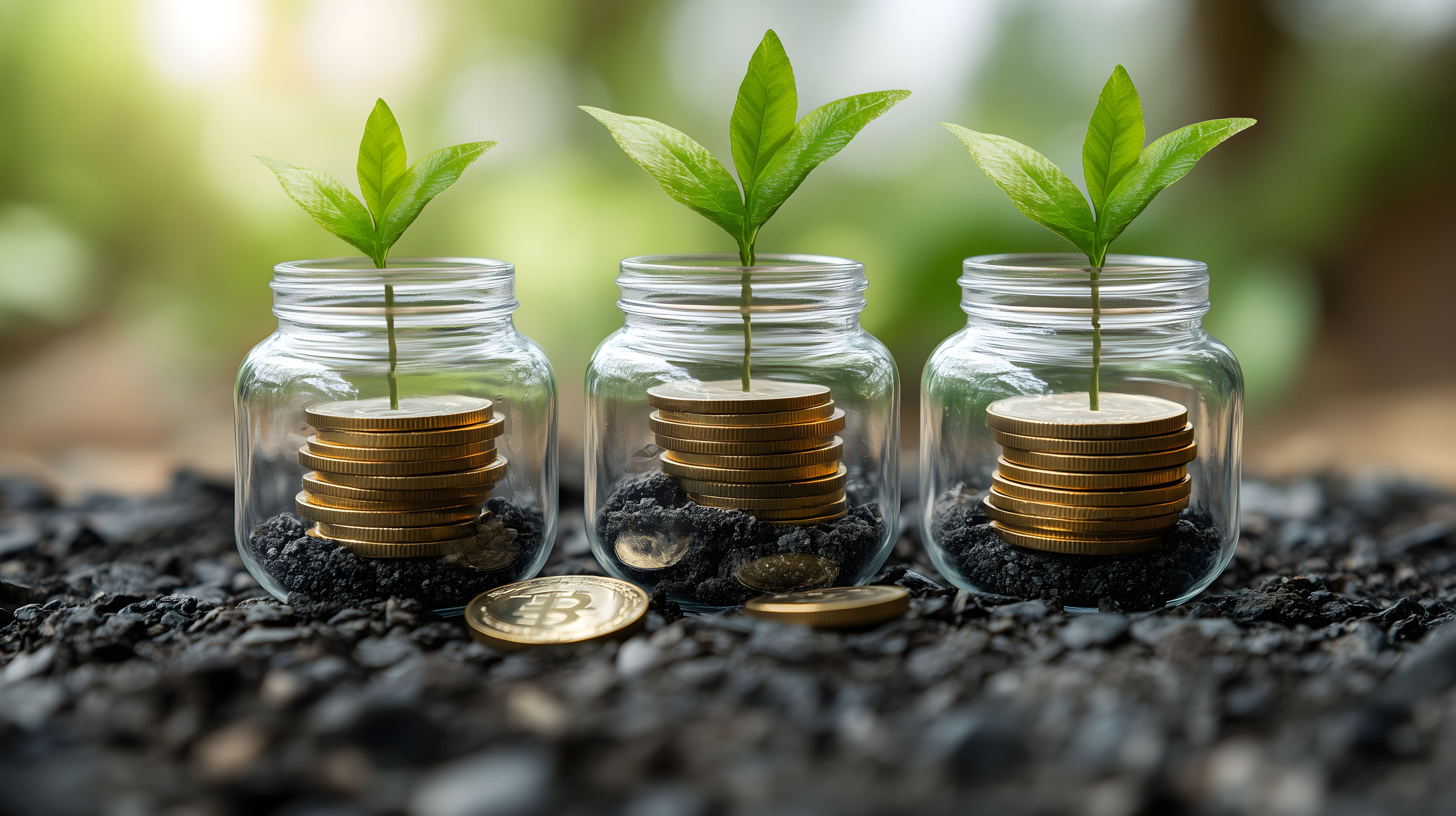 Dieses Foto zeigt ein nachhaltiges Konzept für Geldanlage und Wachstum. Es sind drei Gläser zu sehen, die jeweils mit einer Schicht Erde und gestapelten Goldmünzen gefüllt sind. Aus dem Boden sprießen grüne, frische Pflänzchen, die für Wachstum und Fortschritt stehen. Die Komposition vermittelt die Idee, dass eine ökologisch verantwortungsvolle Geldanlage auch zum persönlichen Wachstum beitragen kann. Das Bild eignet sich hervorragend für den Einsatz in Blogs, Newslettern oder Werbematerialien zum Thema nachhaltige Finanzen, Geldanlage und Investitionen. Dieses hochauflösende Stockfoto ist unter Creative Commons-Lizenz frei verwendbar.