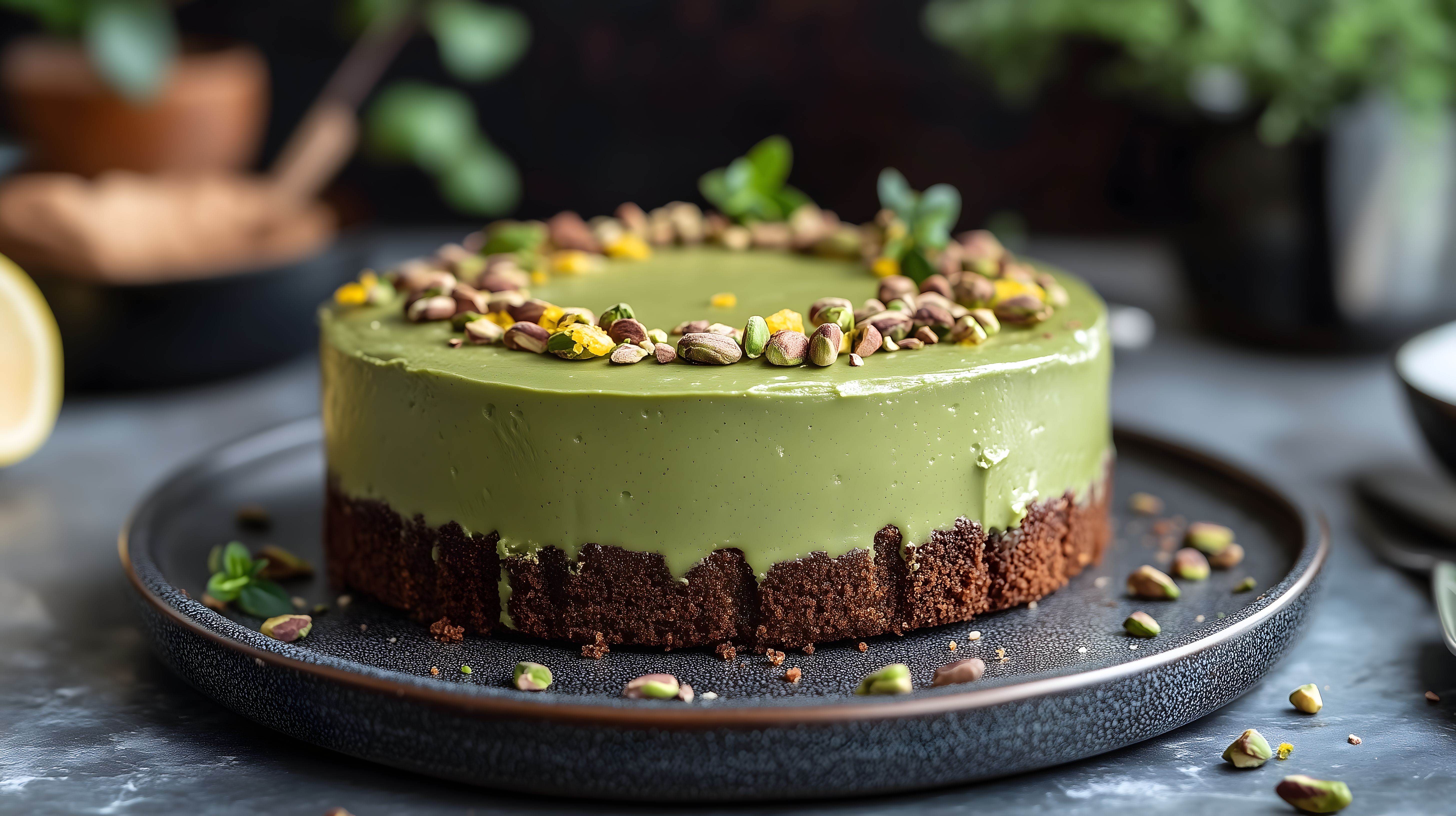 Dieses Foto zeigt einen appetitlich aussehenden, grünen Pistazien-Zitronenkuchen mit einem dunklen Schokoladenboden. Die Oberfläche ist glatt und glänzend und mit gehackten Pistazien und Zitronendekor verziert, was dem Dessert ein elegantes Aussehen verleiht. Der Kuchen wird auf einem schwarzen Teller serviert, was den Kontrast zwischen den Farben Grün und Braun noch verstärkt. Dieses Foto eignet sich hervorragend für die Verwendung in Lebensmittel-Blogs, Rezeptsammlungen, Kochbüchern oder zur Bewerbung von Backwaren und Cafés. Es ist ein hochauflösendes, kostenloses Stockfoto unter einer Creative-Commons-Lizenz.