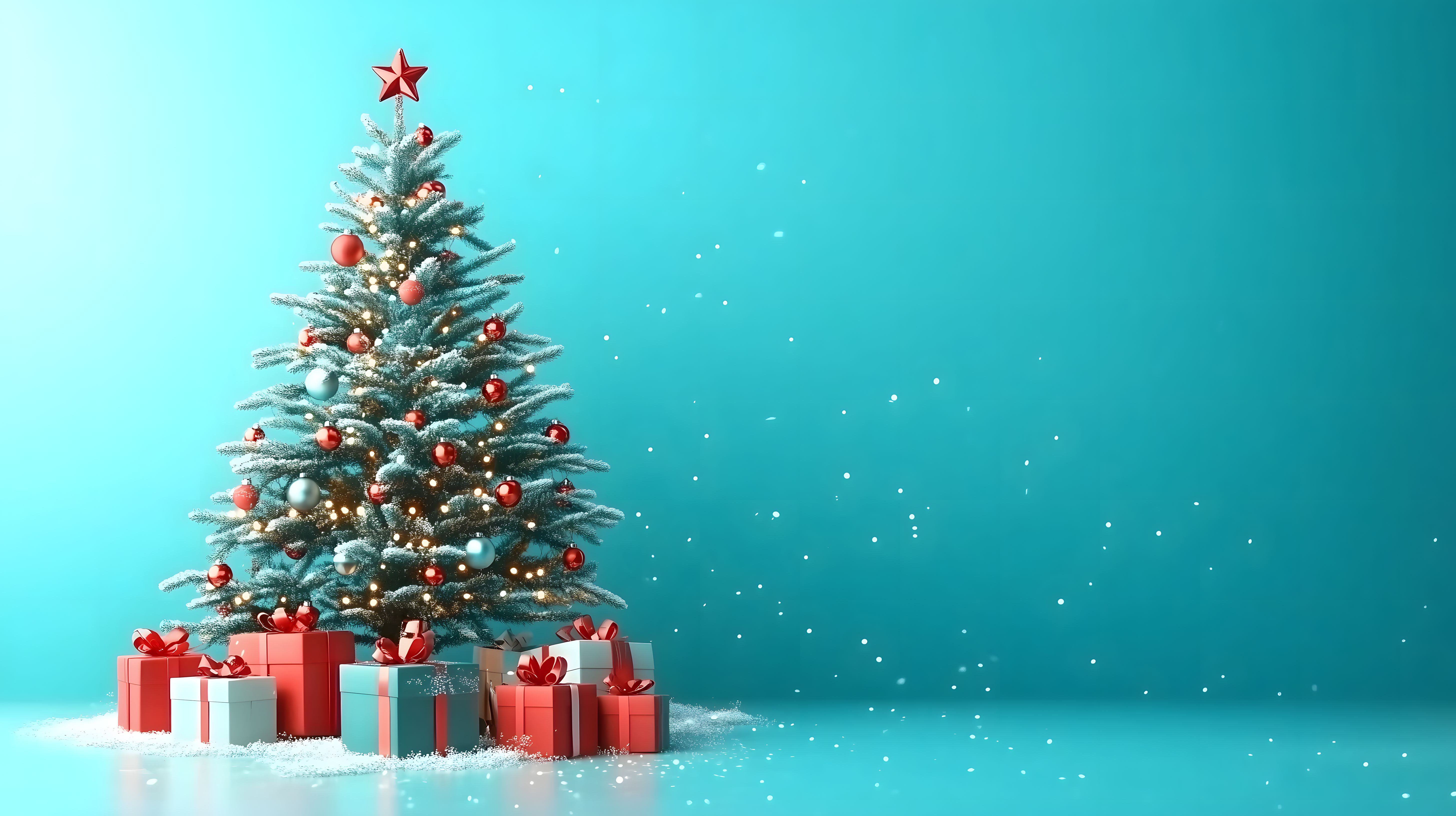 Dieses Foto zeigt einen wunderschönen, mit Schneekristallen bedeckten Weihnachtsbaum, der inmitten zahlreicher Geschenkboxen in Rot und Silber steht. Der türkisfarbene Hintergrund erzeugt einen modernen, festlichen Kontrast. Diese Szene verströmt eine fröhliche, besinnliche Atmosphäre und eignet sich hervorragend als Hintergrund für Weihnachtsgrüße, Blogbeiträge, Werbematerial oder Social-Media-Posts. Das hochaufgelöste Stockfoto ist unter der Creative-Commons-Lizenz kostenlos verwendbar.