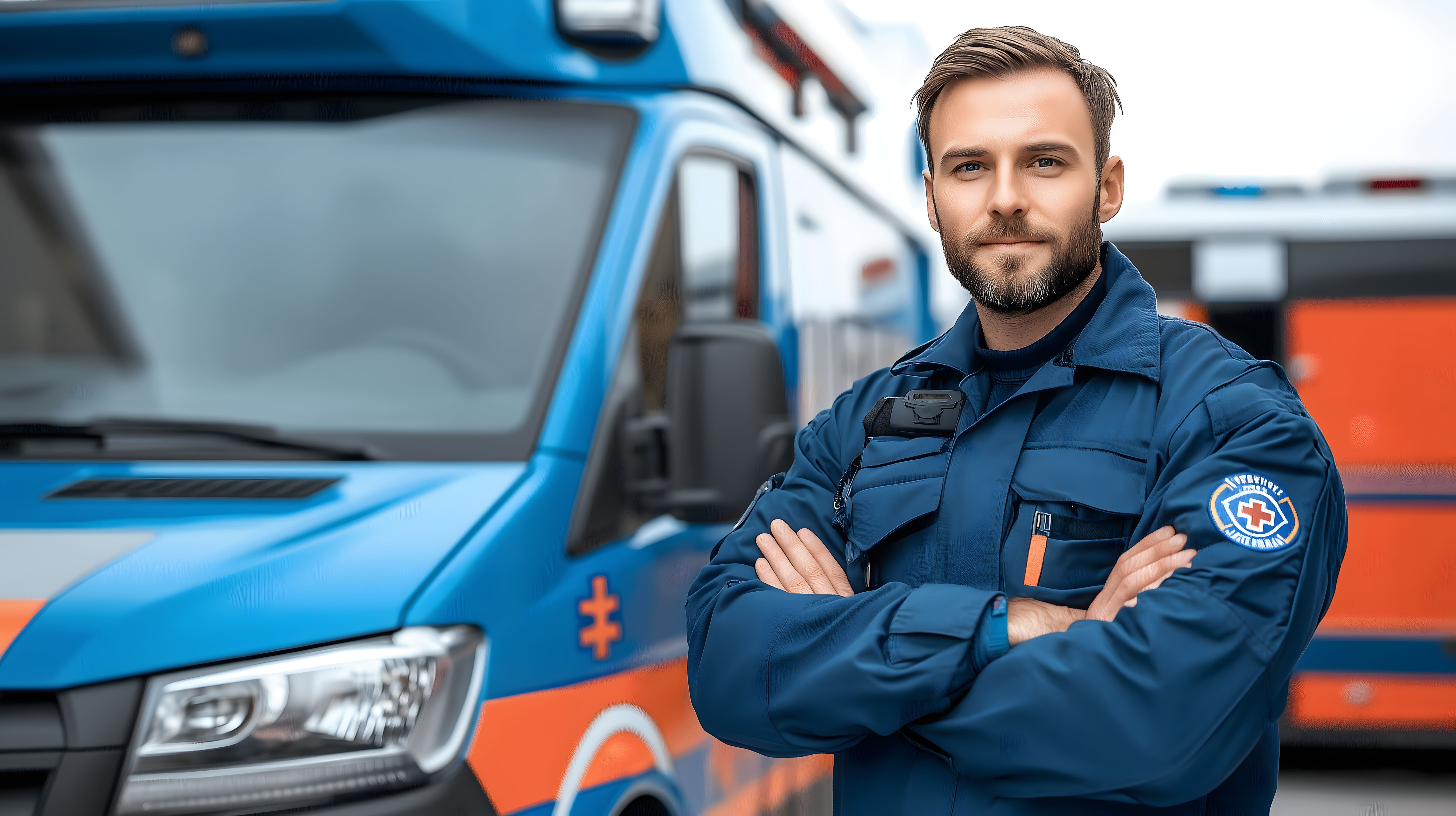 Das Foto zeigt einen Rettungssanitäter in blauer Uniform, der selbstbewusst vor einem Krankenwagen steht. Der Sanitäter hat die Arme verschränkt und blickt direkt in die Kamera, was seine Entschlossenheit und Professionalität unterstreicht. Der Krankenwagen im Hintergrund dient als Kulisse und symbolisiert die Bereitschaft des Sanitäters, im Notfall schnell einzugreifen und Menschen in Notlagen zu versorgen.