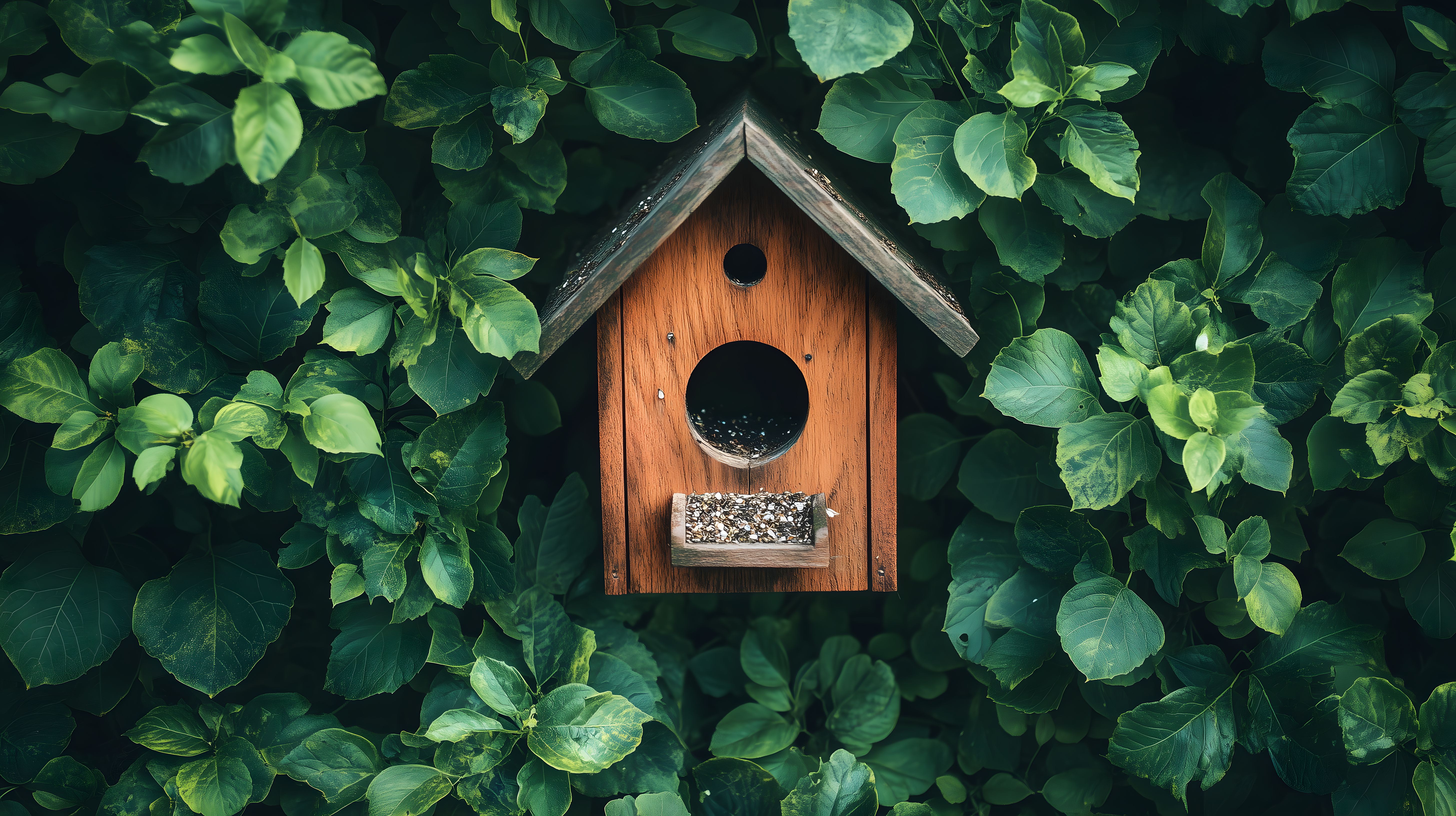 Dieses stimmungsvolle Bild zeigt ein rustikales Vogelfutterhaus, das in einer Umgebung aus üppig grünen Blättern platziert ist. Das Holzhaus mit schlichter Gestaltung bietet Vögeln einen Ort zum Futtern und Rasten. Das Bild vermittelt eine friedliche, naturnahe Atmosphäre und könnte sich ideal für den Einsatz in Blogs, Newslettern oder Werbematerialien rund um Garten, Vogelbeobachtung oder Umweltschutz eignen. Als hochauflösendes, kostenloses Stockfoto unter einer Creative-Commons-Lizenz frei nutzbar, ist dieses Motiv eine hervorragende Wahl für Projekte, bei denen eine natürliche und authentische Bildästhetik gefragt ist.