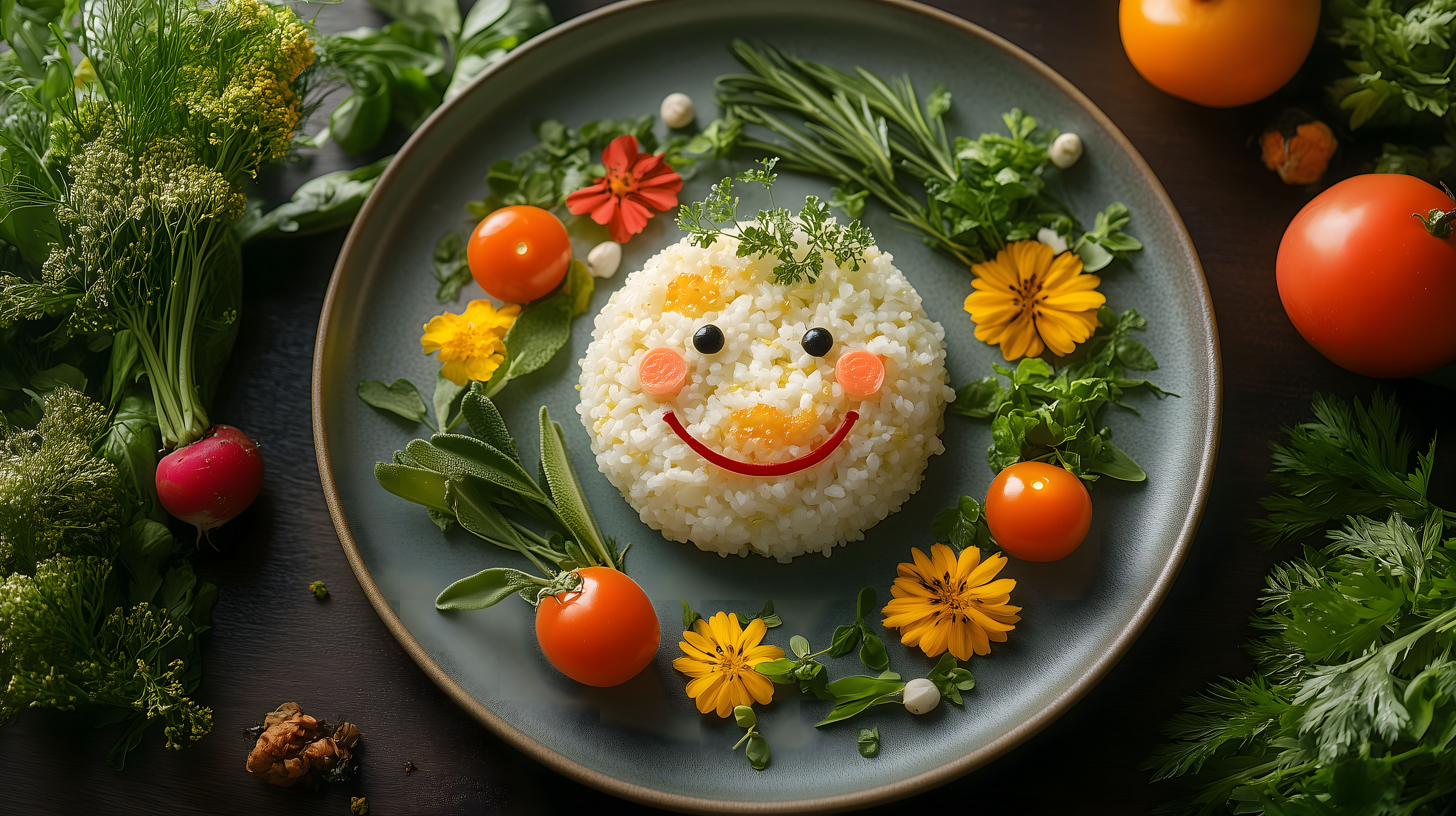 Dieses Foto zeigt ein sehr kreativ und stilvoll angerichtetes Essensarrangement auf einem dunklen Teller. Im Mittelpunkt befindet sich ein Gesicht, das aus einem lächelnden Gesichtsausdruck aus Reis und Gemüse besteht. Umgeben ist das Gesicht von frischen Kräutern, Tomaten, Blüten und anderen natürlichen Elementen, die eine bunte und appetitliche Komposition ergeben. Das Bild strahlt Frische, Natürlichkeit und Lebendigkeit aus und eignet sich hervorragend als kostenloses Stockfoto für Lebensmittel-, Ernährungs- oder Kochthemen, sei es in Blogs, Newslettern oder Social-Media-Beiträgen. Die hochauflösende Datei ist unter einer Creative-Commons-Lizenz verfügbar.