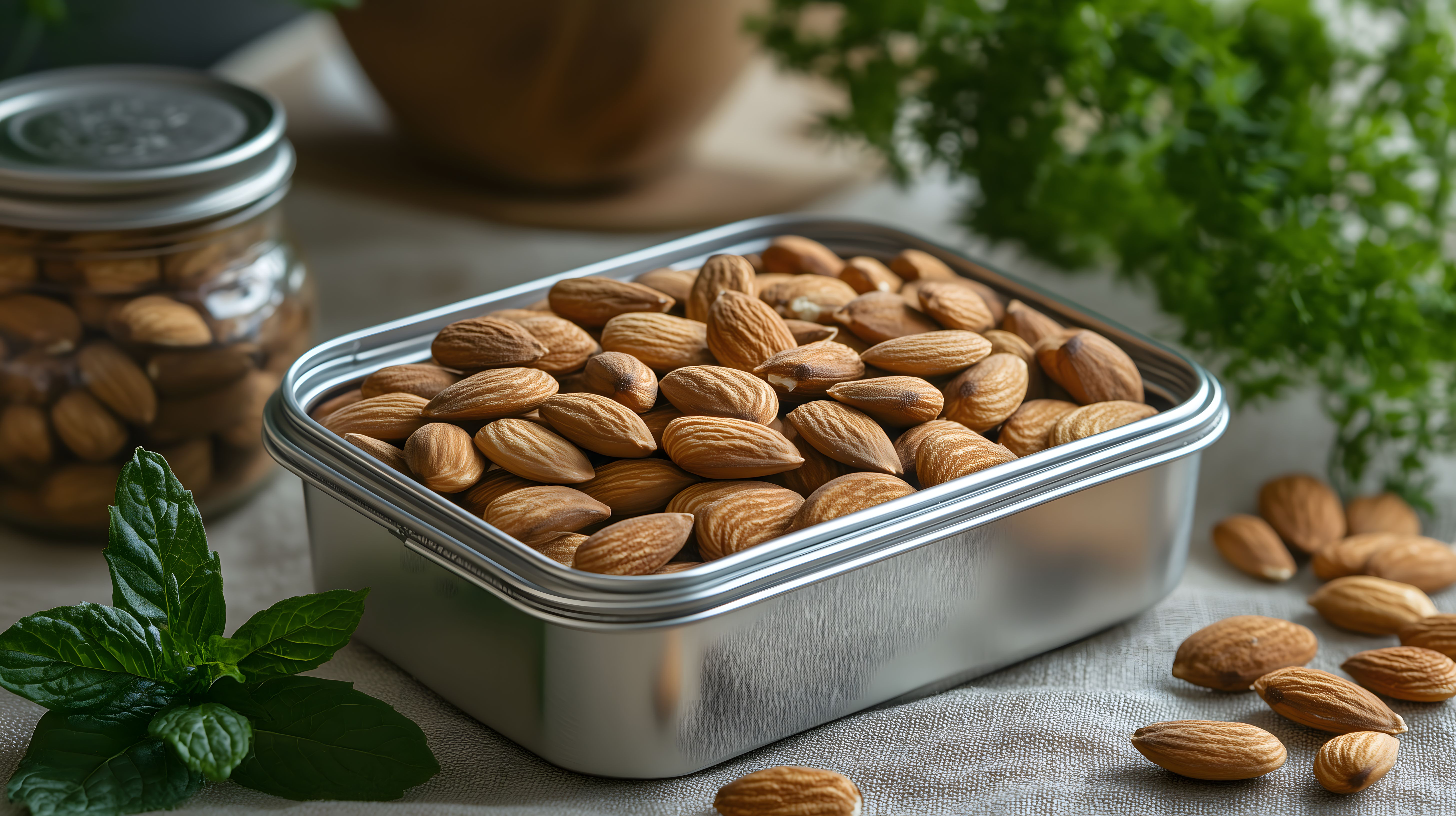 Dieses Bild zeigt eine Nahaufnahme von frischen Mandeln in einer modernen Metalldose. Die goldbraunen Nüsse sind vor einem grünen, blättrigen Hintergrund angeordnet, der eine gesunde, natürliche Atmosphäre verleiht. Die Metalldose verleiht dem Bild einen modernen, minimalistischen Look. Dieses Stockfoto eignet sich hervorragend für Beiträge zu Gesundheit, Ernährung und einem bewussten Lebensstil, etwa in Blogs, Newslettern oder Werbematerialien. Es ist in hoher Auflösung und unter einer Creative-Commons-Lizenz verfügbar, sodass es kostenfrei genutzt werden kann.