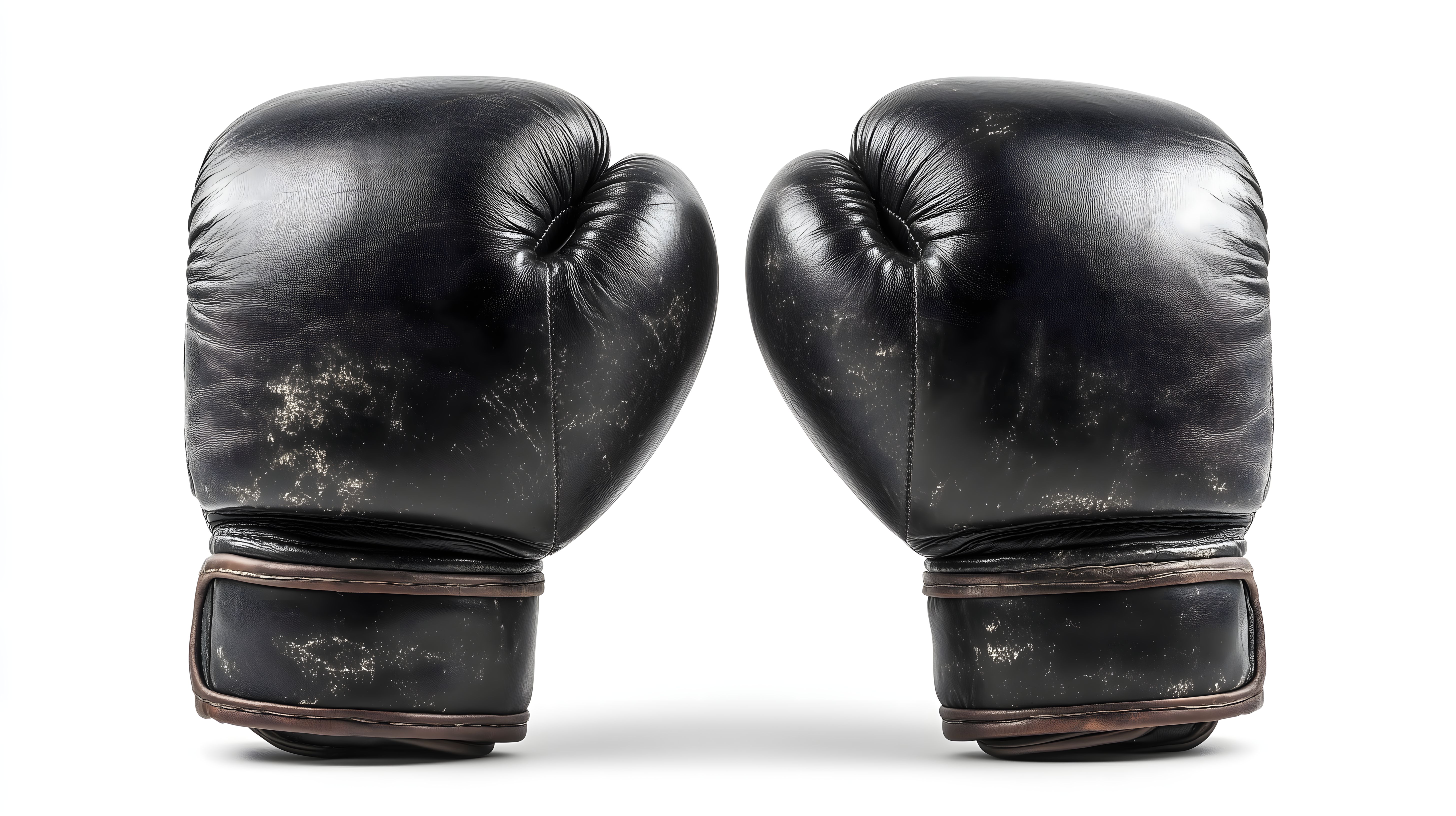 Das Bild zeigt zwei abgenutzte schwarze Boxhandschuhe vor einem weißen Hintergrund. Die Handschuhe sind aus Leder gefertigt und weisen deutliche Gebrauchsspuren auf, was auf intensive Nutzung hindeutet. Die Perspektive ist nah an den Handschuhen, was deren Textur und Beschaffenheit besonders hervorhebt. Das Foto eignet sich hervorragend als Illustration für Themen rund um Kampfsport, Fitness, Training und Sportausrüstung. Als kostenloses Stockfoto in hoher Auflösung und unter Creative-Commons-Lizenz ist es vielfältig einsetzbar, zum Beispiel in Blogbeiträgen, Newslettern oder Social-Media-Postings.