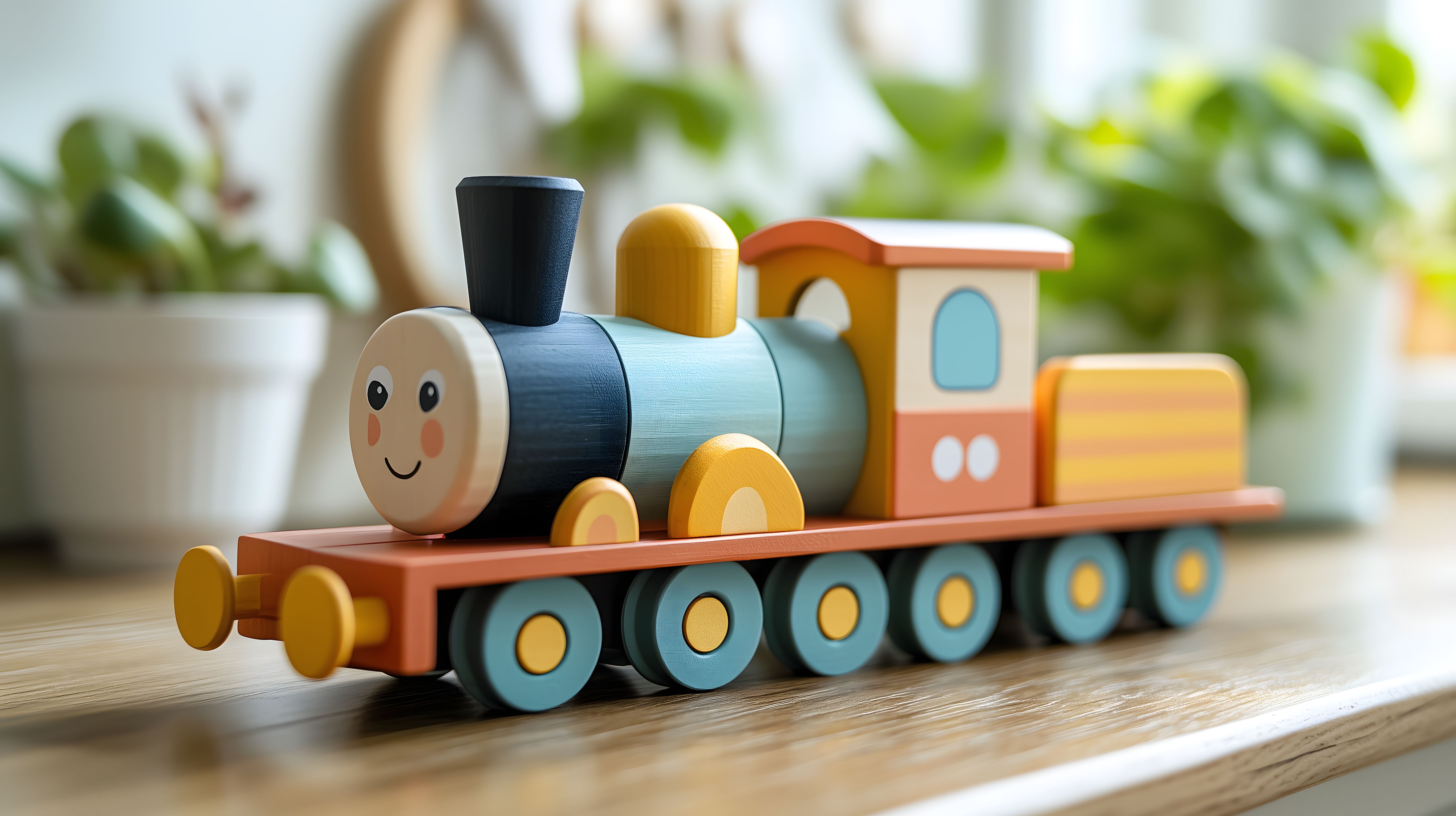 Das Bild zeigt einen bunten Holzspielzeugzug auf einer hellen Küchen- oder Arbeitsplatte. Der Zug besteht aus einer detaillierten Lokomotive und mehreren Wagons in verschiedenen Farben wie Türkis, Orange und Gelb. Die runden Holzräder und das freundliche Gesicht der Lokomotive verleihen dem Spielzeug einen nostalgischen, kindlichen Charme. Die Szene ist vor einem grünen, verschwommenen Hintergrund platziert, was den Fokus auf das Spielzeug lenkt. Dieses kostenlosen Stockfoto in hoher Auflösung eignet sich ideal für die Verwendung in Blogbeiträgen, Newslettern, Werbematerialien oder Social-Media-Posts rund um Themen wie Kindheit, Nostalgie, Dekoration oder Inneneinrichtung. Die Lizenz unter Creative Commons erlaubt eine flexible Nutzung.