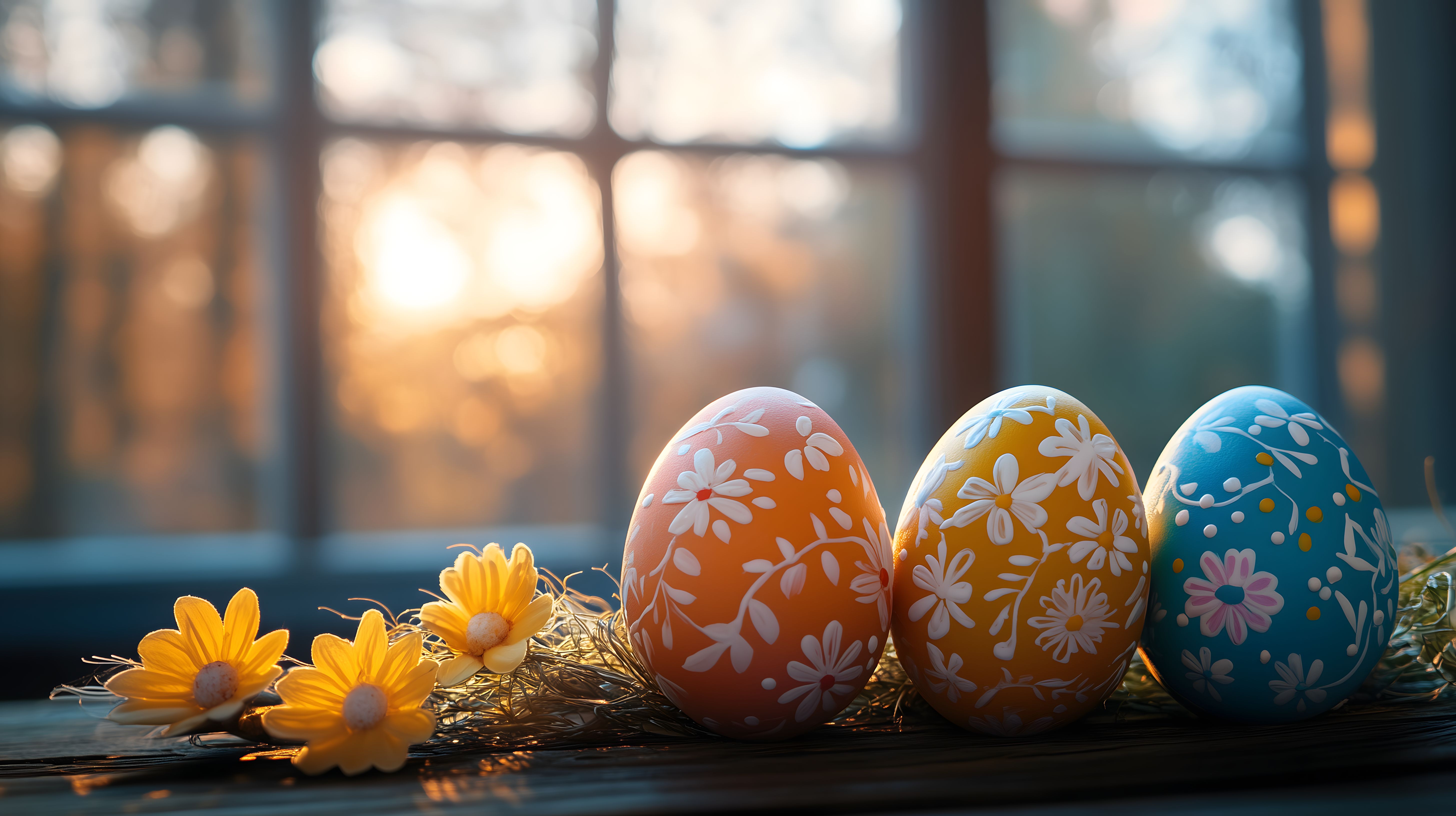 Dieses stimmungsvolle Foto zeigt drei dekorierte Ostereier in einer warmen, natürlichen Umgebung. Die Eier sind kunstvoll mit floralen Mustern in Orangetönen, Gelb und Blau bemalt. Sie liegen auf einem Nest aus Zweigen und Blättern, umrahmt von leuchtend gelben Gänseblümchen. Der Hintergrund ist verschwommen, was den Fokus auf die Osterdekoration lenkt und eine gemütliche, friedliche Atmosphäre schafft. Dieses kostenlose Stockfoto in hoher Auflösung unter Creative-Commons-Lizenz eignet sich hervorragend für Frühlingsdekorationen, Ostergrußkarten, Blogbeiträge und Werbematerial rund um Ostern.