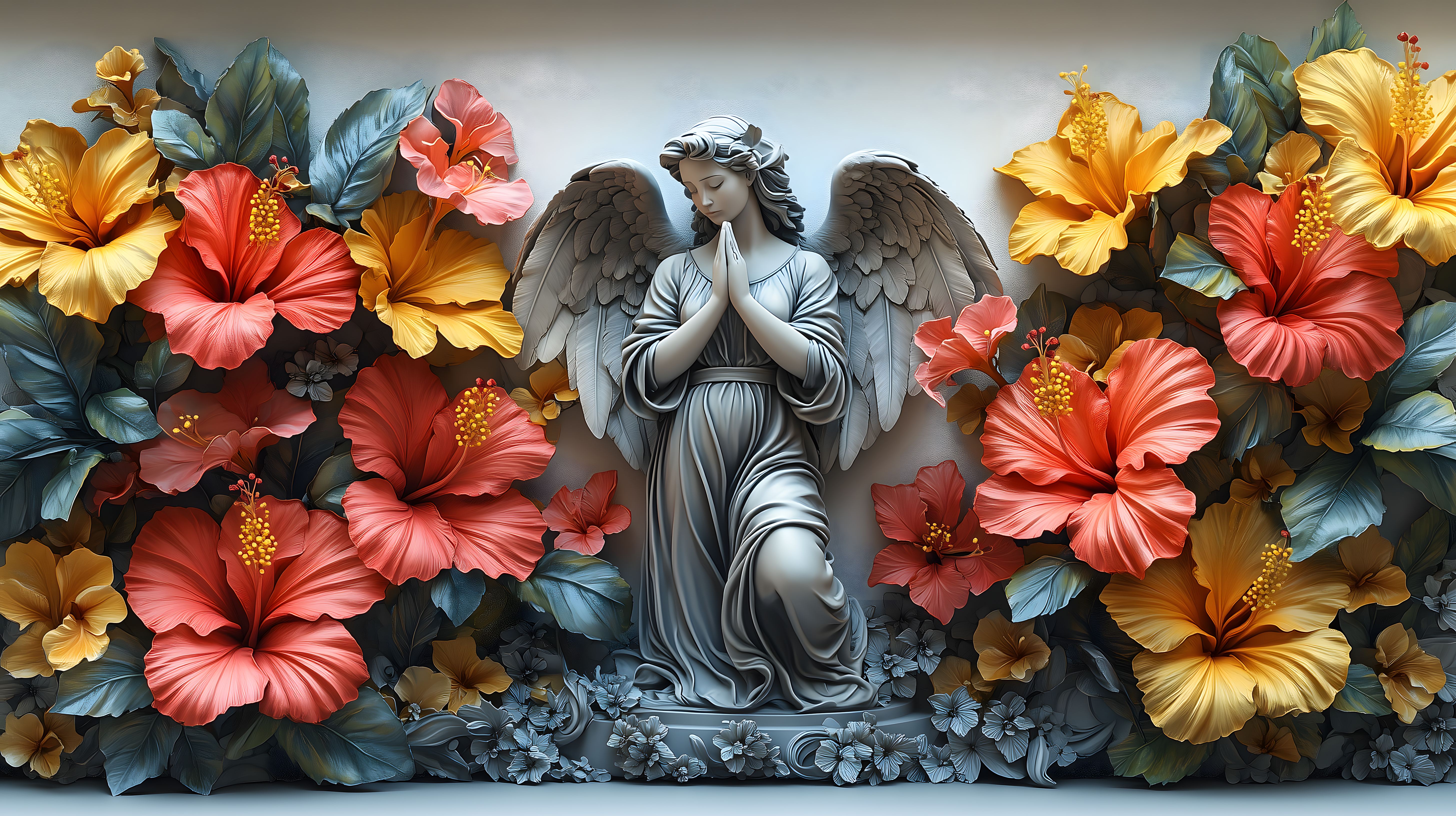 Dieses eindrucksvolle Bild zeigt eine detaillierte 3D-Engelsfigur, die von üppigen, farbenfrohen tropischen Blumen umgeben ist. Die Statue scheint vor einem hellen Hintergrund zu schweben, wodurch der 3D-Effekt besonders betont wird. Die Blumen - darunter leuchtend rote Hibiskusblüten und golden-gelbe Exemplare - verleihen dem Bild eine lebendige, natürliche Anmutung. Diese Darstellung einer himmlischen Präsenz inmitten exotischer Vegetation eignet sich hervorragend als kostenloses Stockfoto für Blog-Beiträge, Newsletter, Social-Media-Postings oder Werbematerialien in hoher Auflösung und unter Creative-Commons-Lizenz.