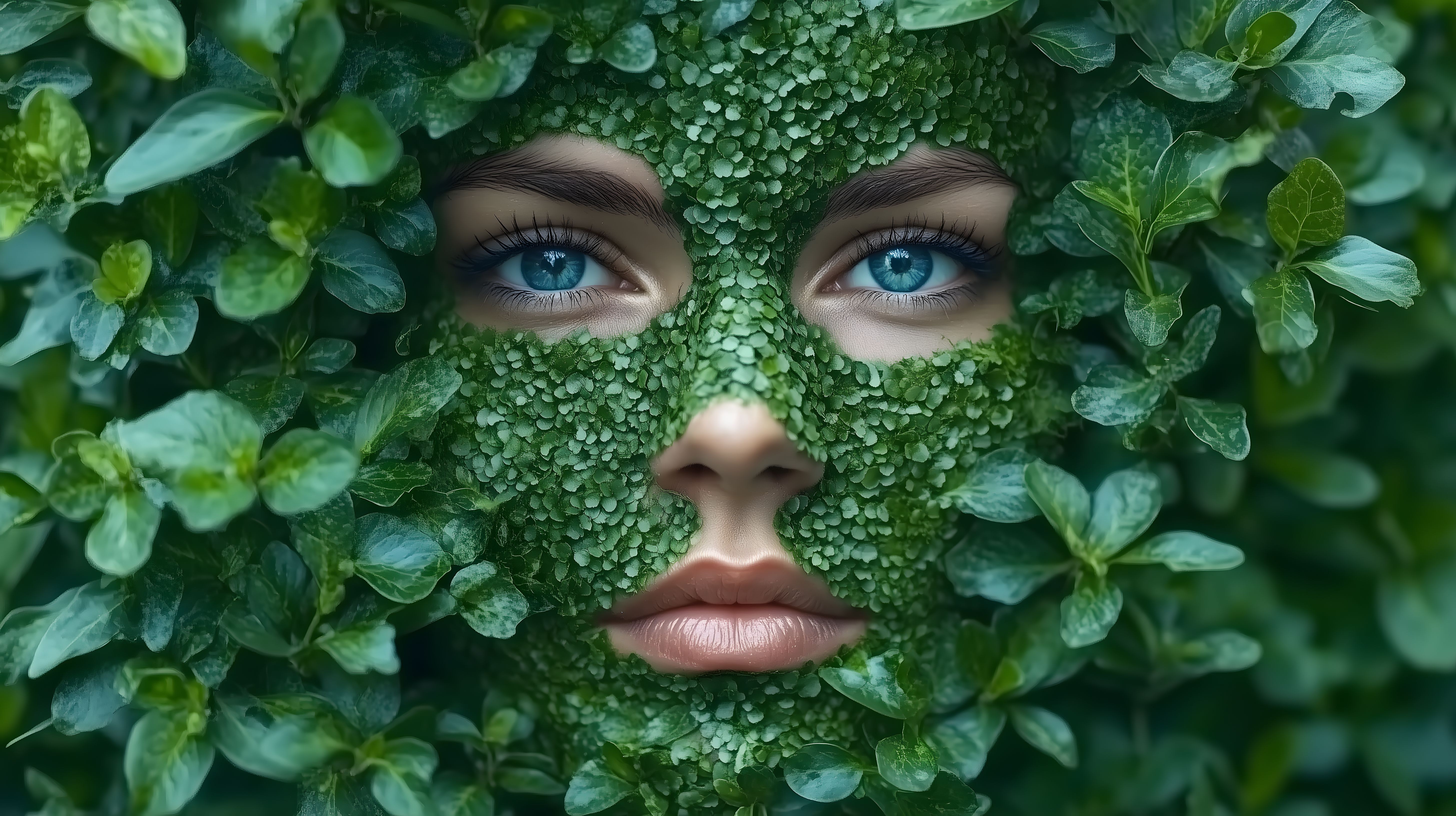 Dieses außergewöhnliche Foto zeigt ein Gesicht, das in einer üppigen, grünen Pflanzenwelt eingebettet ist. Die Augen und Lippen des Gesichts sind deutlich zu erkennen, während der Rest des Gesichts von den feinen, detailreichen Blättern umgeben ist. Das Bild vermittelt ein Gefühl von Natürlichkeit, Frische und Verbundenheit mit der Umwelt. Es eignet sich hervorragend als Hintergrundbild oder Gestaltungselement für Webseiten, Social-Media-Posts, Werbematerialien oder Magazinlayouts mit Fokus auf Ökologie, Nachhaltigkeit und Kreativität. Dieses kostenlose, hochauflösende Stockfoto steht unter einer Creative-Commons-Lizenz zur Verfügung.