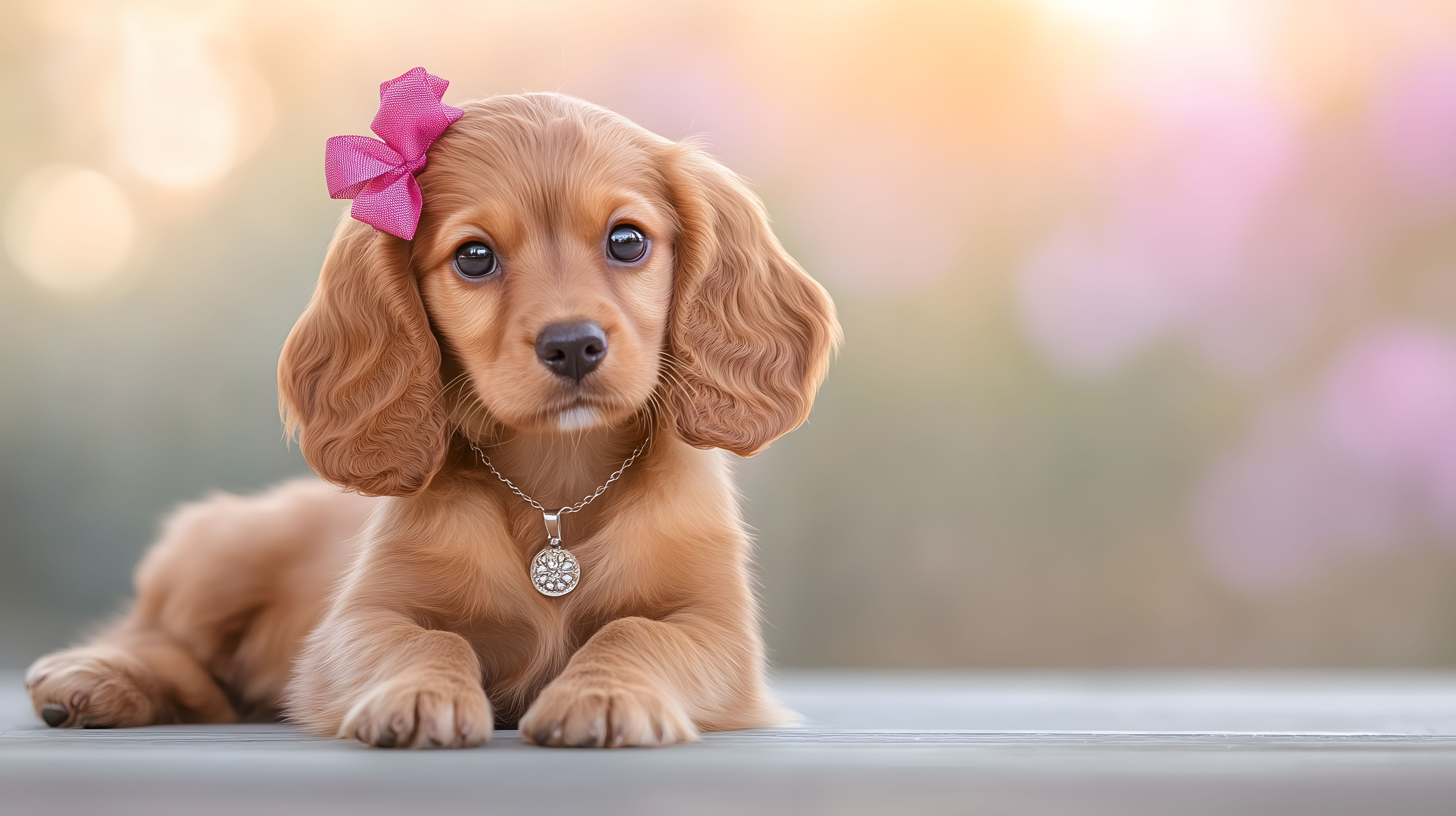 Das Bild zeigt einen entzückenden, jung aussehenden Cocker Spaniel-Welpen, der liebevoll in die Kamera blickt. Das Hündchen trägt eine rosa Haarschleife auf seinem lockigen, hellbraunen Fell und sitzt vor einem unscharfen, pastellfarbenen Hintergrund. Der Fokus liegt klar auf dem Gesichtsausdruck des Tieres, das eine unschuldige, bittende Ausstrahlung vermittelt. Dieses Stockfoto eignet sich hervorragend für den Einsatz in Blogs, Newsletters, sozialen Medien oder Werbekampagnen, bei denen ein süßer, niedlicher Akzent gewünscht ist. Die hochauflösende, kostenlose Aufnahme unter Creative-Commons-Lizenz sorgt für professionelle Ergebnisse.