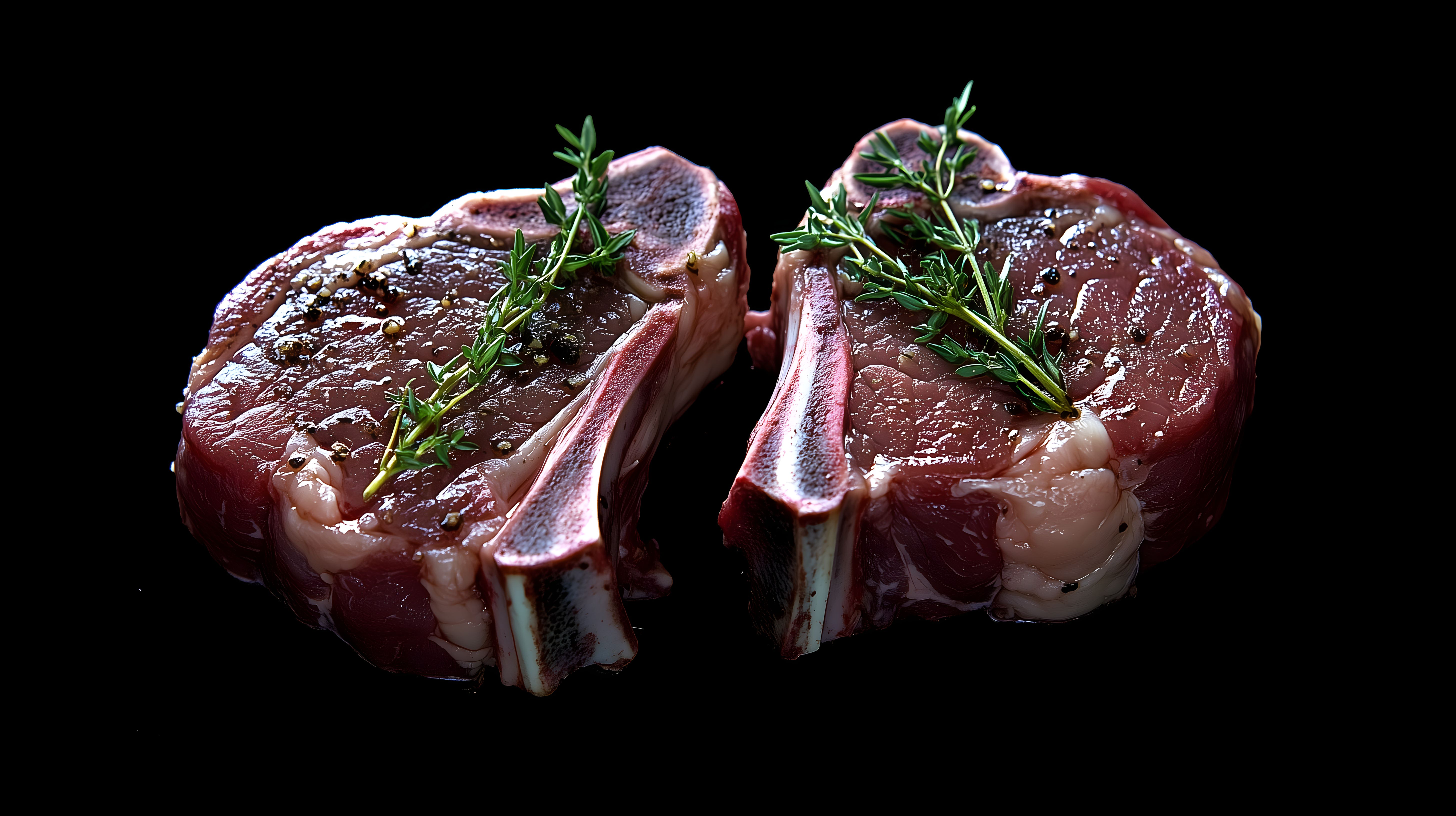 Das Bild zeigt zwei saftige Lammkoteletts, dekoriert mit frischen Rosmarinzweigen vor schwarzem Hintergrund. Die Koteletts sind dunkel angebraten und mit einer leicht glänzenden, klebrigen Oberfläche zu sehen. Die Anordnung und Beleuchtung verleihen dem Foto eine elegante, gehobene Anmutung, die perfekt für die Präsentation von Gourmetküche oder Delikatessen geeignet ist.