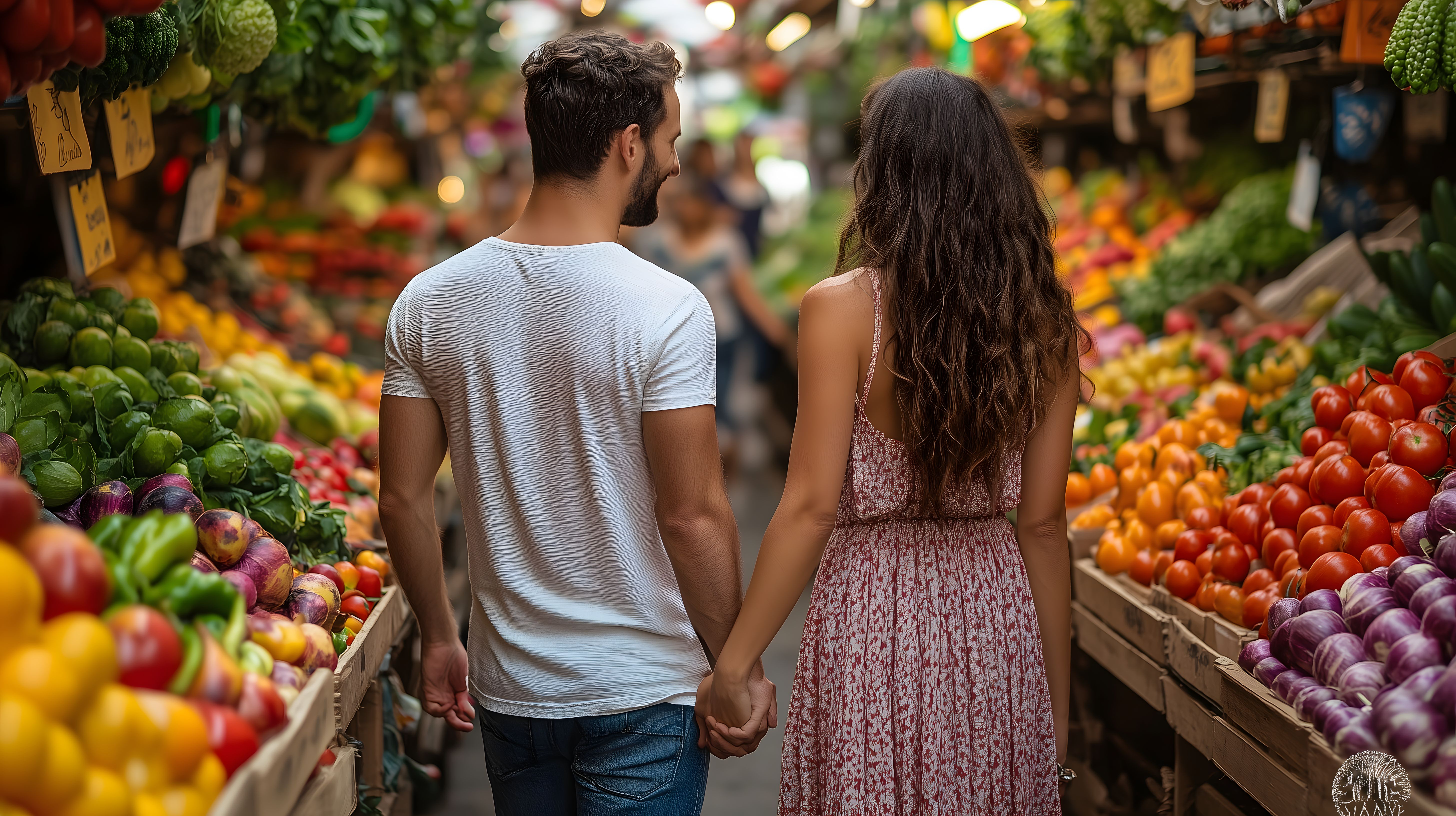 Das Foto zeigt ein junges Paar, das Hand in Hand über einen bunten Bio-Markt schlendert. Sie betrachten interessiert die vielfältige Auslage an frischem Obst und Gemüse. Die warmen Farbtöne, das üppige Angebot an saisonalen Produkten und die entspannte Atmosphäre verleihen der Szene einen natürlichen, romantischen Charakter. Dieses Stockfoto eignet sich perfekt für den Einsatz in Blogs, Social-Media-Posts oder Werbekampagnen rund um Themen wie nachhaltige Ernährung, gesunder Lebensstil oder Paarfotografie in urbaner Umgebung. Die hohe Auflösung und Creative-Commons-Lizenz erlauben eine flexible, kostenfreie Nutzung.
