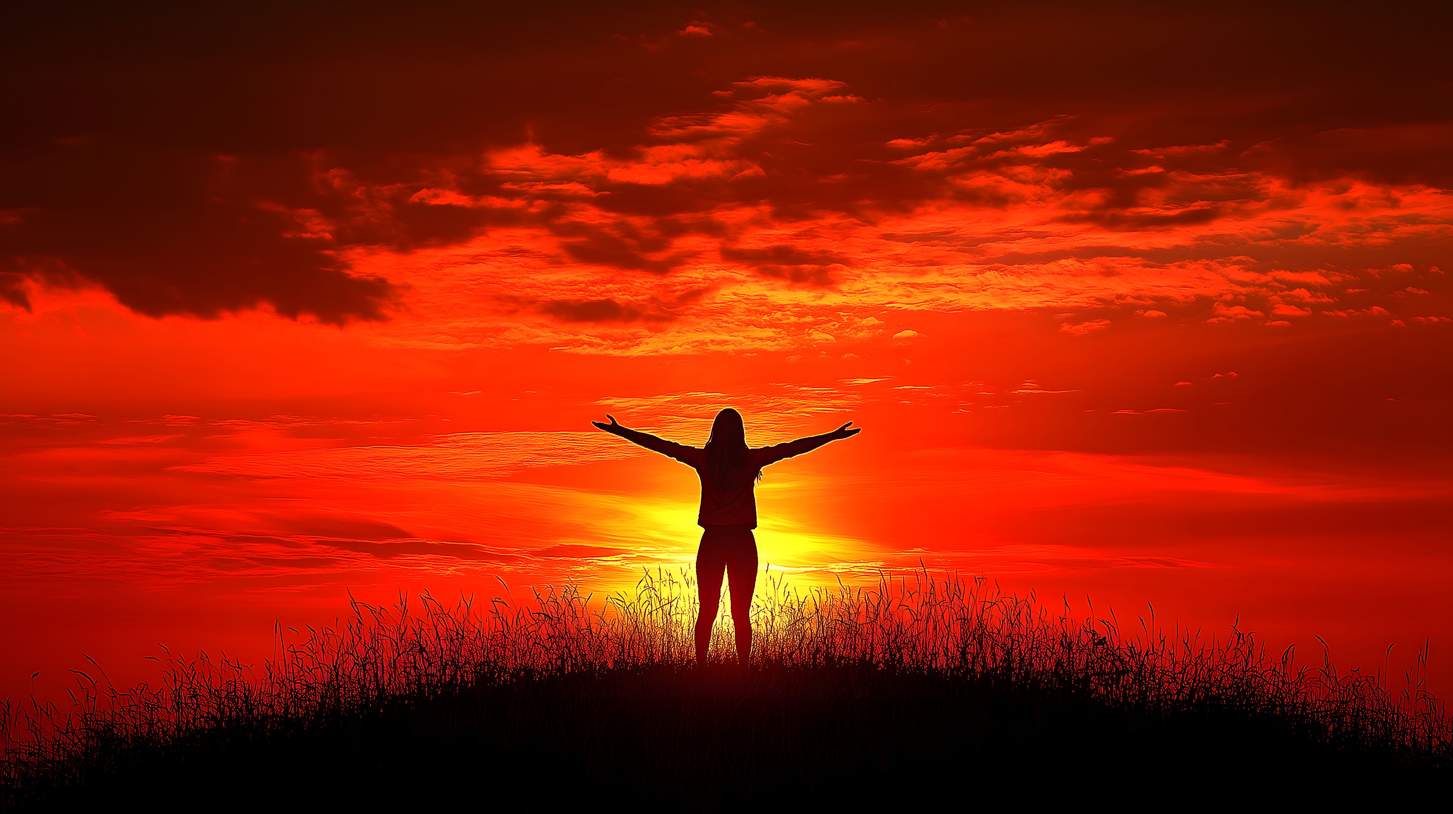 Dieses atemberaubende Bild zeigt die Silhouette einer Frau, die vor einem spektakulären Sonnenuntergang steht. Mit ausgebreiteten Armen erscheint sie wie eine Verkörperung von Freiheit und Hoffnung. Die üppigen roten Wolken am Himmel tauchen die Szene in ein warmes, orangerotes Licht und verleihen ihr eine fast mystische Stimmung. Der Kontrast zwischen der dunklen Silhouette und dem feurigen Himmel ist faszinierend und lädt den Betrachter ein, über die Bedeutung von Freiheit und Spiritualität nachzudenken. Dieses Stockfoto in hoher Auflösung eignet sich perfekt für Blog-Beiträge, Newsletter-Designs, Social-Media-Posts oder Werbematerialien, bei denen eine inspirierende und stimmungsvolle Bildsprache gefragt ist. Es steht unter einer Creative-Commons-Lizenz zur freien Nutzung zur Verfügung.