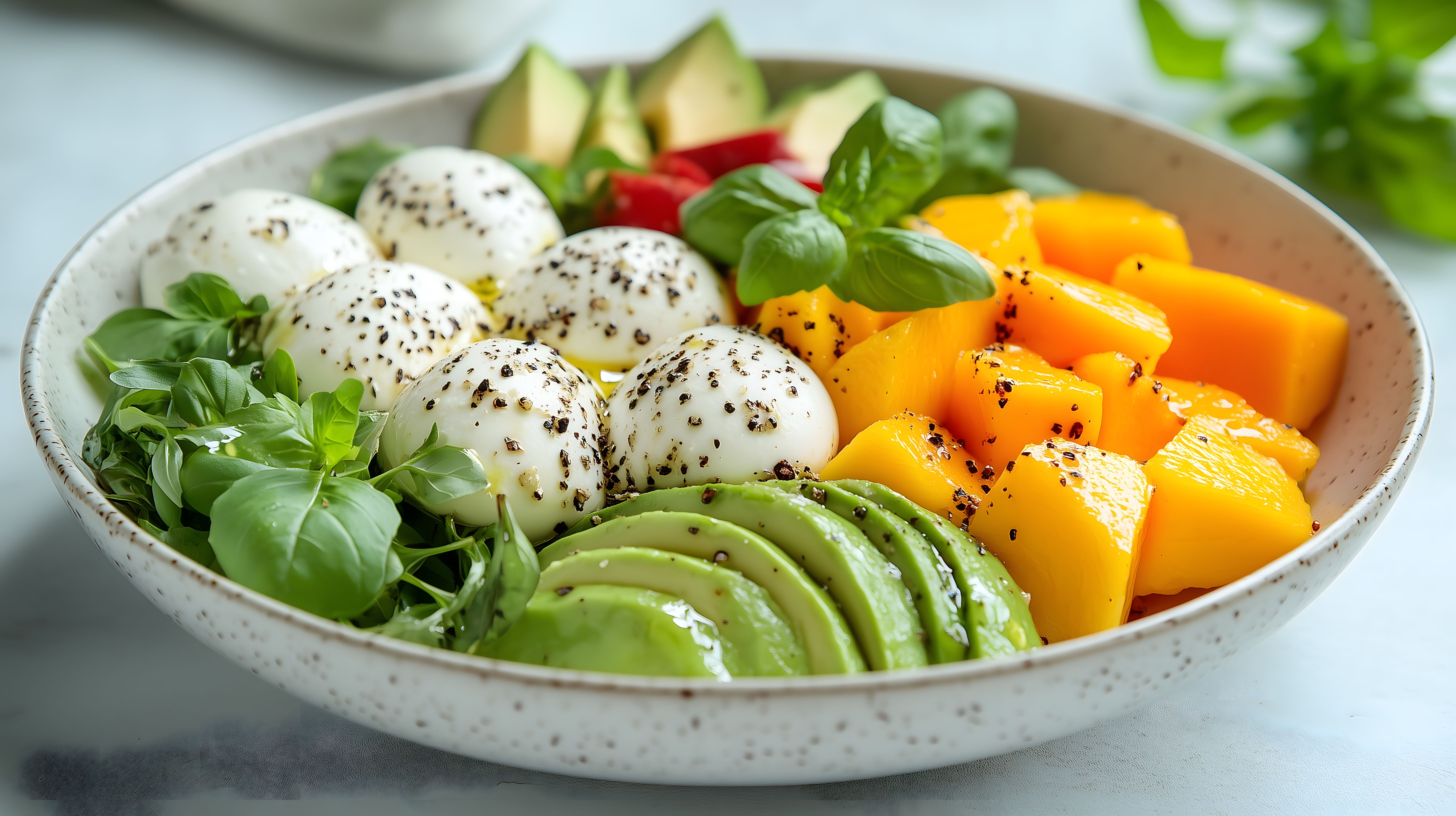 Dieses Foto zeigt eine leckere, gesunde Sommermahlzeit in einer rustikalen Schüssel. Die Mahlzeit besteht aus frischen Zutaten wie Mozzarella, Avocado, Mango, Zucchini und Paprika, umgeben von grünen Basilikumblättern. Die kräftigen Farben und das natürliche Arrangement machen das Bild zu einem attraktiven Stockfoto, das sich hervorragend für Blogs, Newsletter, Social-Media-Beiträge oder Werbung eignet. Dieses hochauflösende, kostenlose Foto steht unter Creative-Commons-Lizenz zur Verfügung.