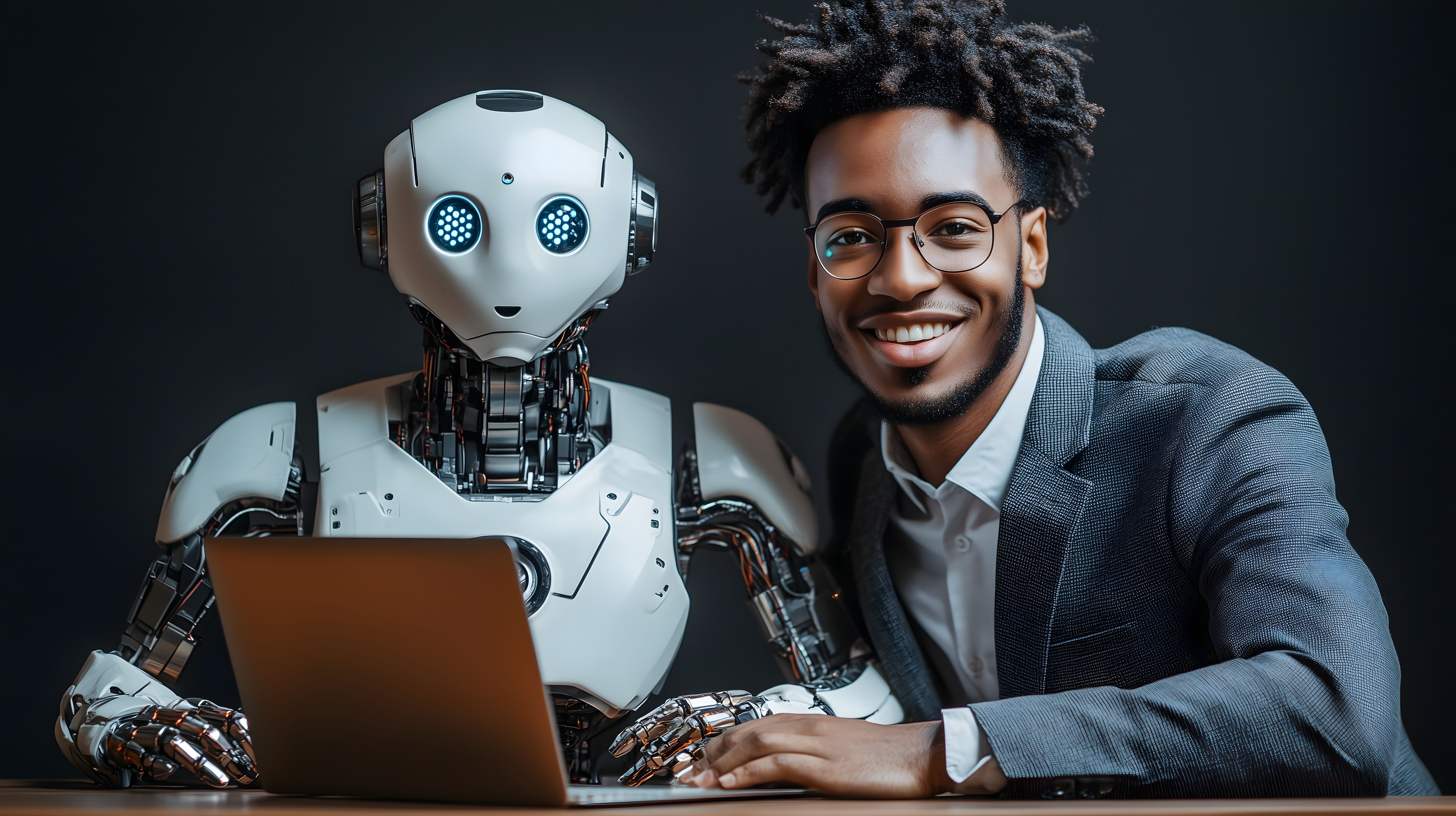Dieses Stockfoto zeigt die Zusammenarbeit zwischen Künstlicher Intelligenz und einem Geschäftsmann in einem modernen Büroumfeld. Der Roboter sitzt am Laptop und der Mensch lächelt zufrieden neben ihm. Das Bild symbolisiert die Symbiose zwischen Technologie und menschlicher Expertise, die eine effiziente und innovative Arbeitsweise ermöglicht. Dieses hochauflösende Foto eignet sich hervorragend für den Einsatz in Blogs, Newslettern, Social-Media-Kanälen oder Werbematerialien, die das Thema Künstliche Intelligenz und Mensch-Maschine-Interaktion behandeln. Es steht unter der Creative-Commons-Lizenz zur kostenlosen Verwendung zur Verfügung.