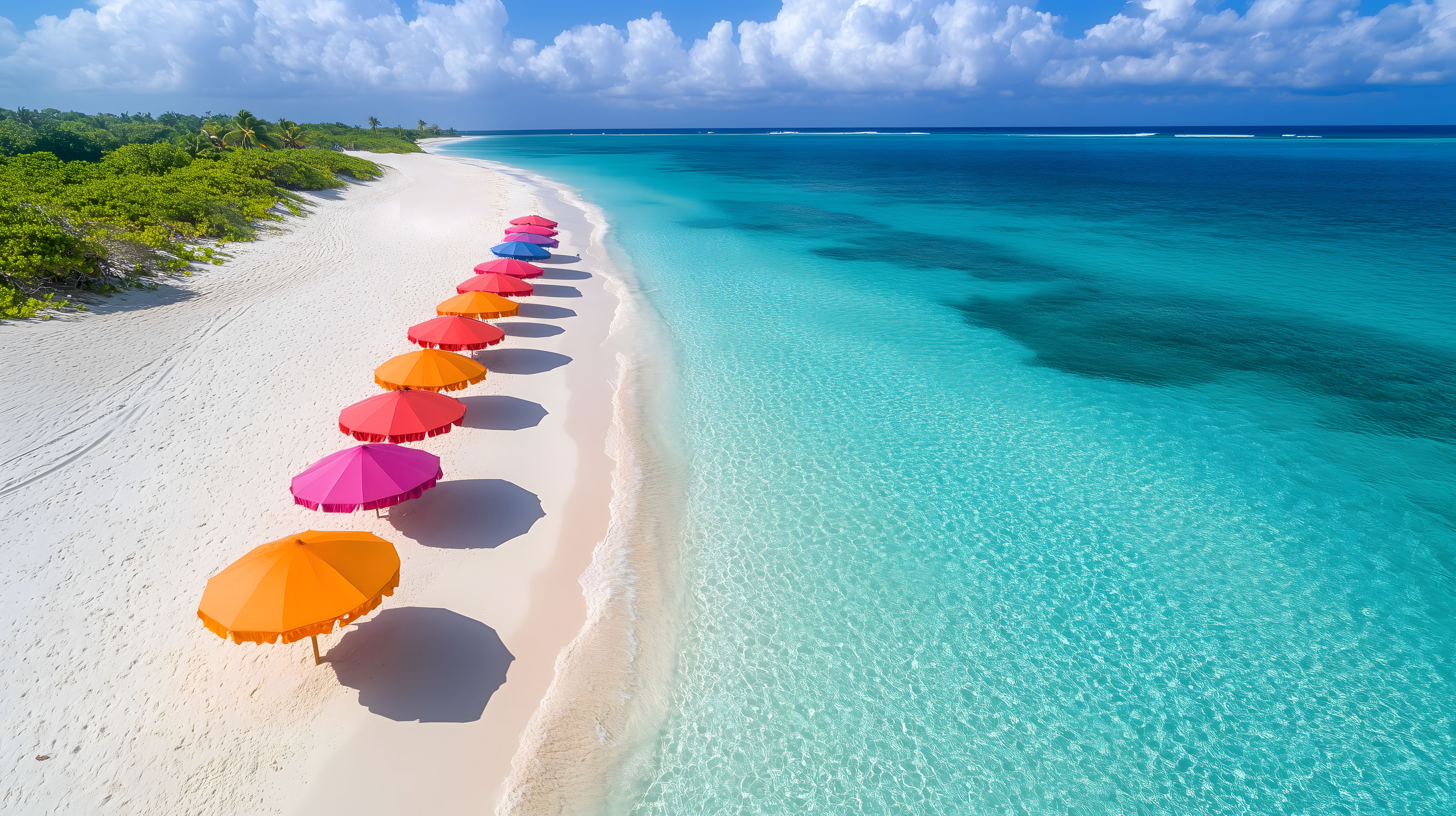Diese luftige Aufnahme zeigt einen traumhaften tropischen Sandstrand mit einer Reihe bunter Sonnenschirme, die sich entlang der Küste erstrecken. Das glasklare türkisfarbene Wasser und der weiße Sand verleihen der Szene eine paradiesische Atmosphäre. Die lebendigen Farben der Regenschirme, die sich vom strahlenden Himmel abheben, tragen zu einem stimmungsvollen Gesamteindruck bei. Dieses Foto eignet sich hervorragend als Hintergrundmotiv für Blogs, Websites, Newsletter oder Werbeanzeigen rund um Urlaub, Reise und Erholung. Aufgrund der hohen Auflösung kann das Bild ohne Einschränkungen kostenfrei unter der Creative Commons-Lizenz genutzt werden.