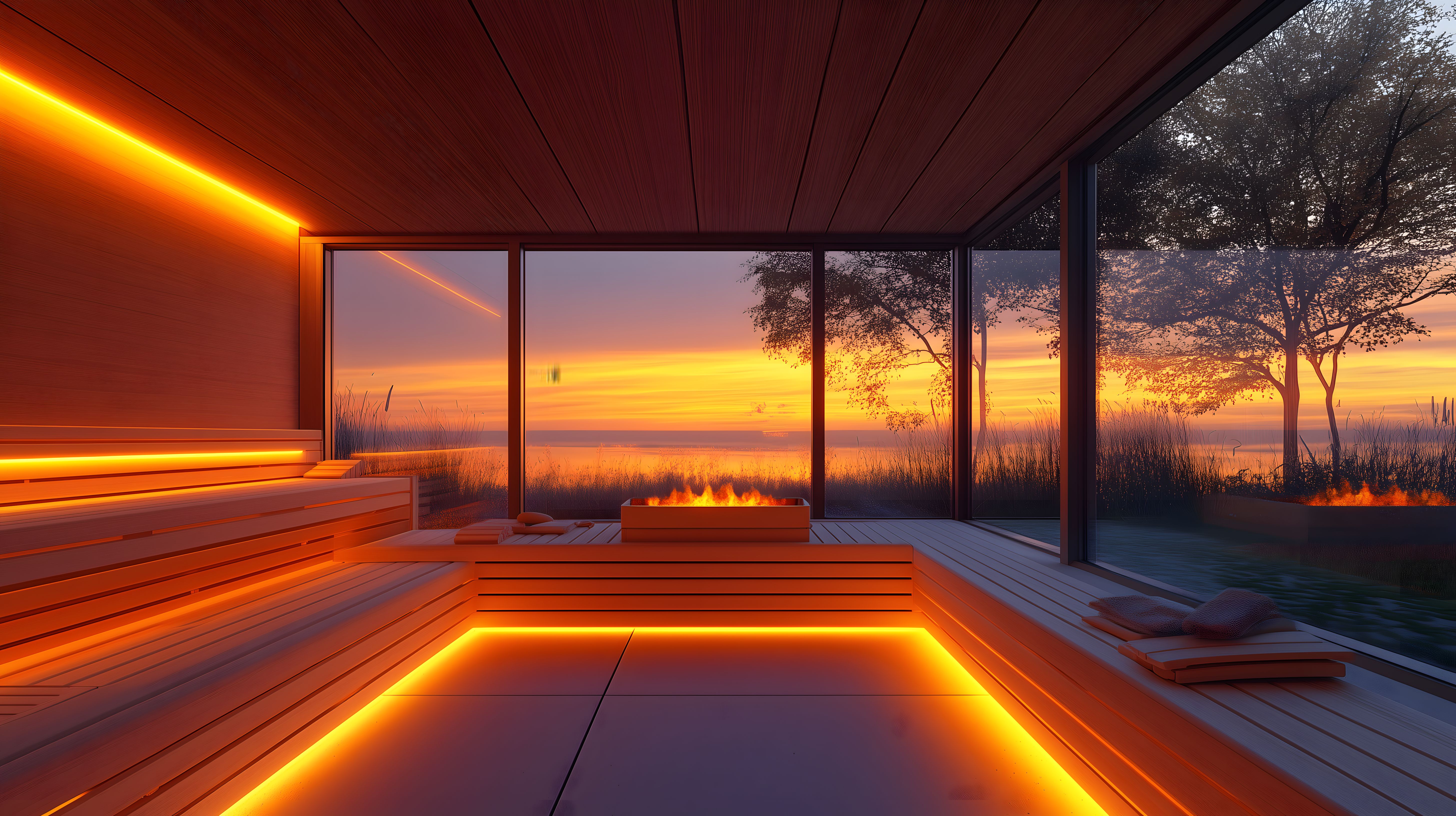Dieses Bild zeigt eine moderne, luxuriöse Sauna mit einer beeindruckenden Panoramaaussicht. Der Raum ist aus Holz gefertigt und mit orangefarbener Beleuchtung ausgestattet, die eine warme und gemütliche Atmosphäre schafft. Durch die großen Fenster fällt Tageslicht herein und bietet einen atemberaubenden Blick auf die umliegende Natur, mit einem dramatischen Sonnenuntergang am Horizont. Die Sauna selbst ist mit Holzbänken ausgestattet, die zum Entspannen einladen. Dieses Stockfoto in hoher Auflösung eignet sich hervorragend für Blogs, Newsletter, Social-Media-Posts oder Werbezwecke, bei denen eine stimmungsvolle und luxuriöse Wellnessatmosphäre dargestellt werden soll. Es ist unter einer Creative-Commons-Lizenz frei verwendbar.