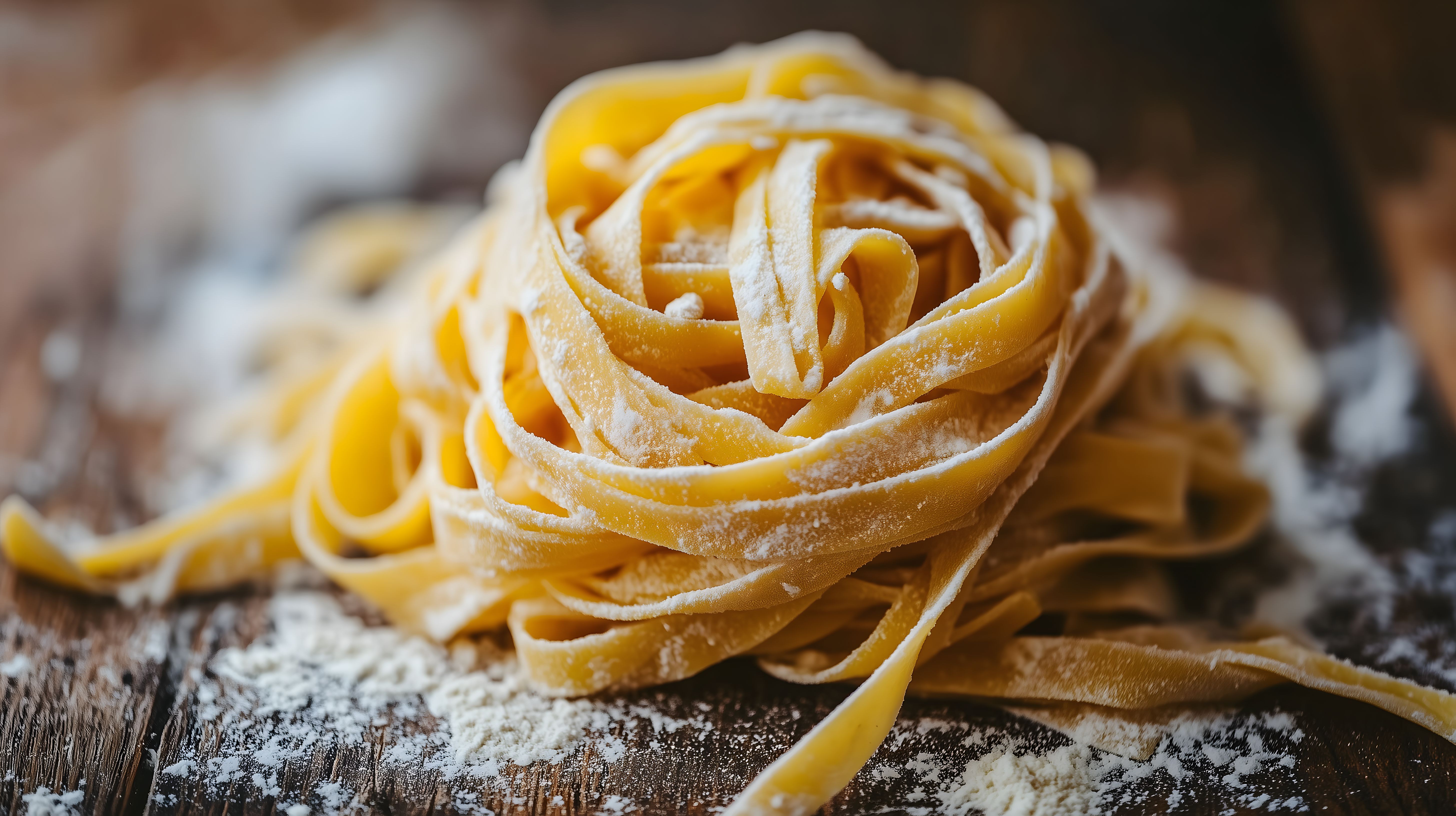 Dieses Foto zeigt frisch zubereitete Fettuccine-Nudeln, die auf einem rustikalen, hölzernen Hintergrund platziert sind. Die Nudeln haben eine goldgelbe Farbe und sind kunstvoll zu Rosen geformt, was ihnen eine dekorative Note verleiht. Um die Nudeln herum ist etwas Mehl verstreut, was den handgefertigten Charakter des Gerichts unterstreicht. Dieses Stockfoto eignet sich hervorragend für die Verwendung in Kochrezepten, Foodblogs, sowie in Werbematerialien für italienische Lebensmittel oder Restaurants. Das Bild ist in hoher Auflösung verfügbar und unter einer Creative-Commons-Lizenz kostenfrei nutzbar.