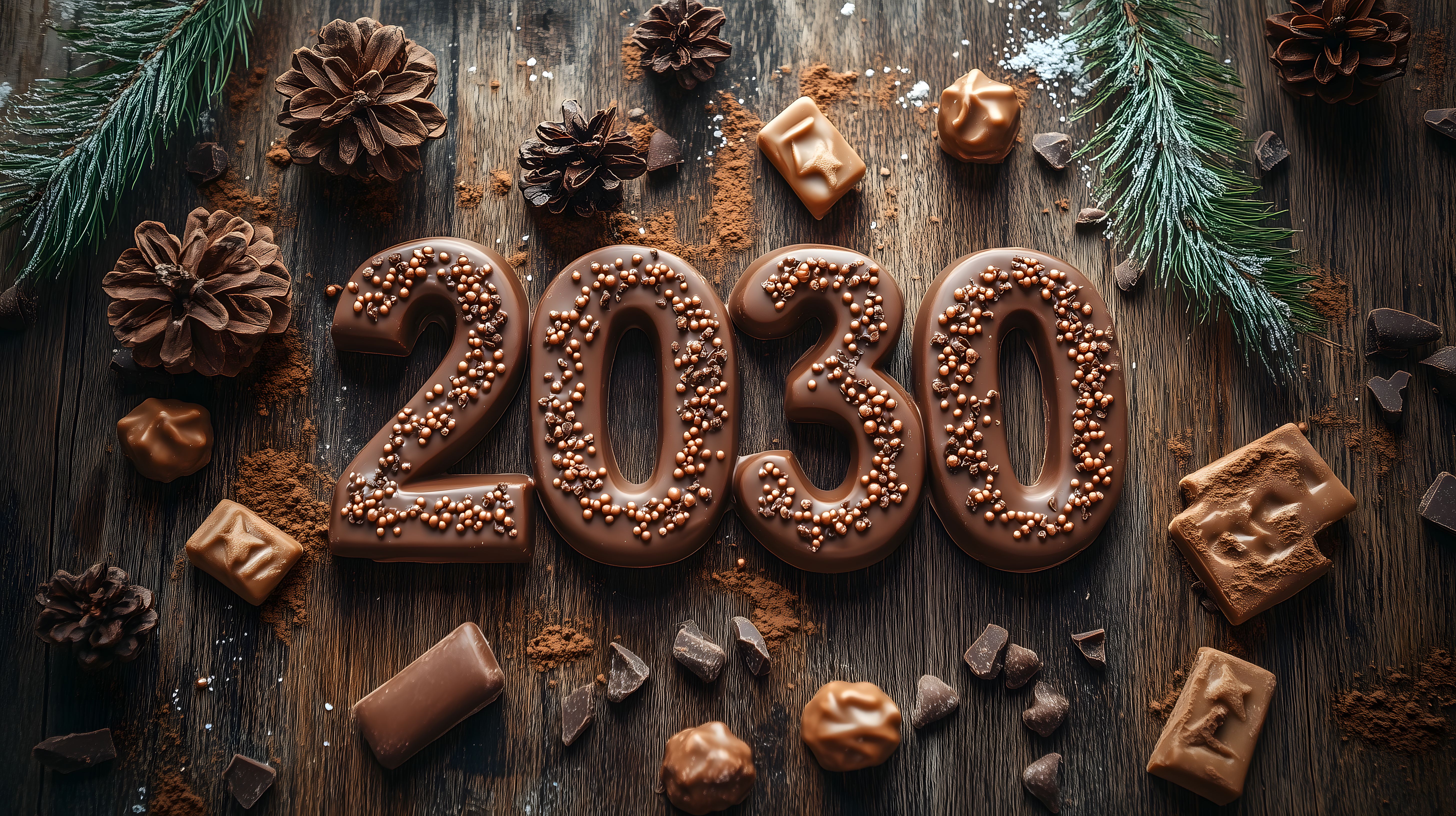 Dieses detailreiche Bild zeigt die Ziffern '2030' in dekorativer Schokoladenausführung, umgeben von festlichen Tannenzweigen, Zapfen und anderen weihnachtlichen Elementen auf einer rustikalen Holzunterlage. Die warmen, dunklen Brauntöne der Schokolade kontrastieren stimmungsvoll mit den grünen Tannenzweigen und den rötlich-goldenen Tannenzapfen. Diese Komposition erzeugt eine feierliche, winterliche Atmosphäre und lässt sich ideal für Neujahrs-, Silvester- oder Weihnachtsgrüße in Blogs, Newslettern und sozialen Medien einsetzen. Als kostenloses Stockfoto in hoher Auflösung und unter der Creative-Commons-Lizenz ist dieses Motiv vielseitig einsetzbar.