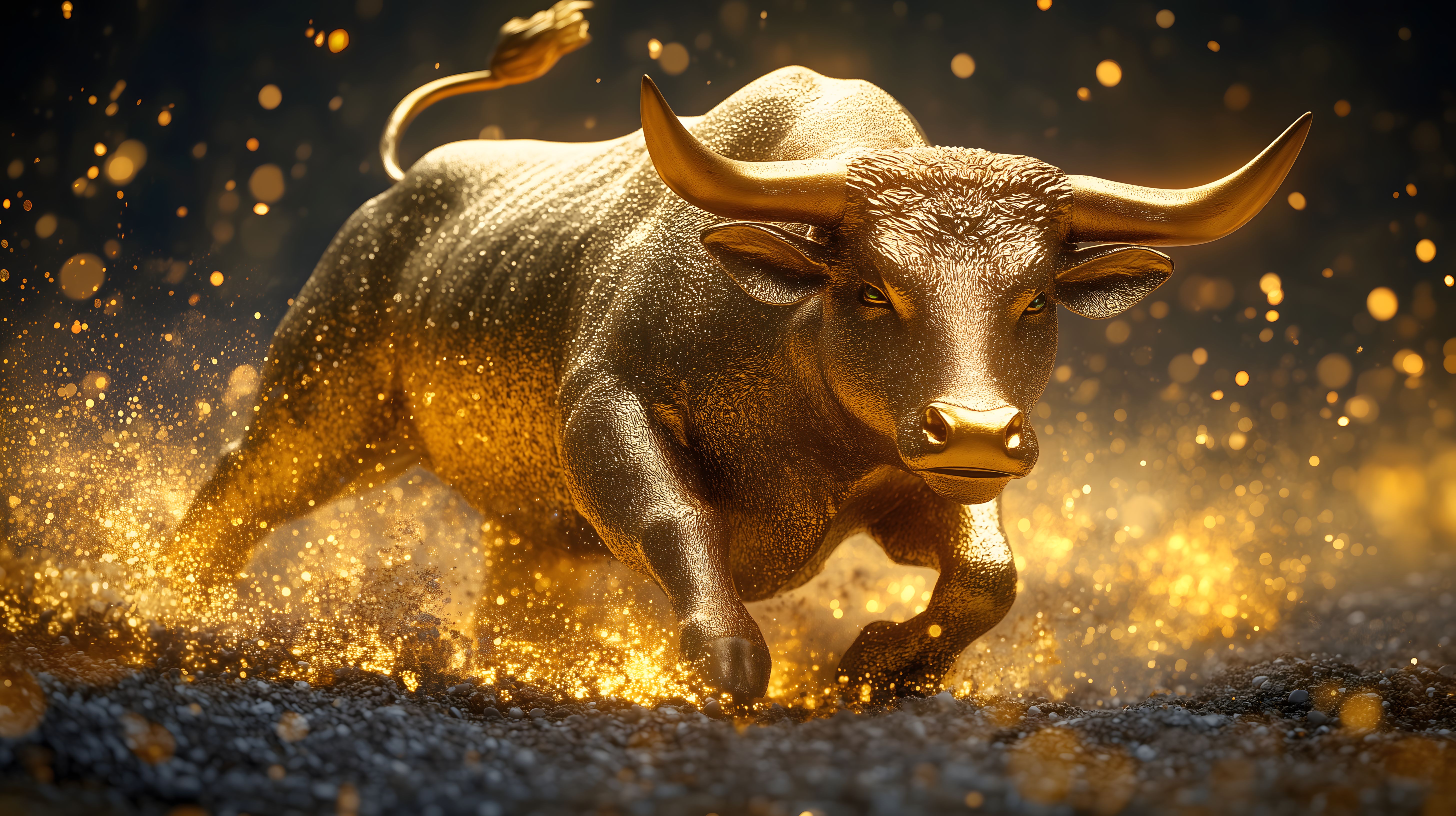 Dieses Foto zeigt einen mächtigen, goldenen Stier, der in einer dynamischen Bewegung durch einen Glitzerregen schreitet. Der Stier, als Symbol für Kraft, Stärke und Erfolg an den Finanzmärkten, ist vollständig in goldenes Metall gehüllt und strahlt eine beeindruckende Präsenz aus. Das Bild vermittelt die Idee eines Bullenmarktes, in dem die Wirtschaft und Investitionen florieren. Dieses hochauflösende Stockfoto in kostbarer Optik eignet sich ideal für Blogbeiträge, Newsletter oder Social-Media-Posts rund um Themen wie Finanzen, Börse und Unternehmenserfolg. Die Fotomontage ist unter einer Creative-Commons-Lizenz frei nutzbar.
