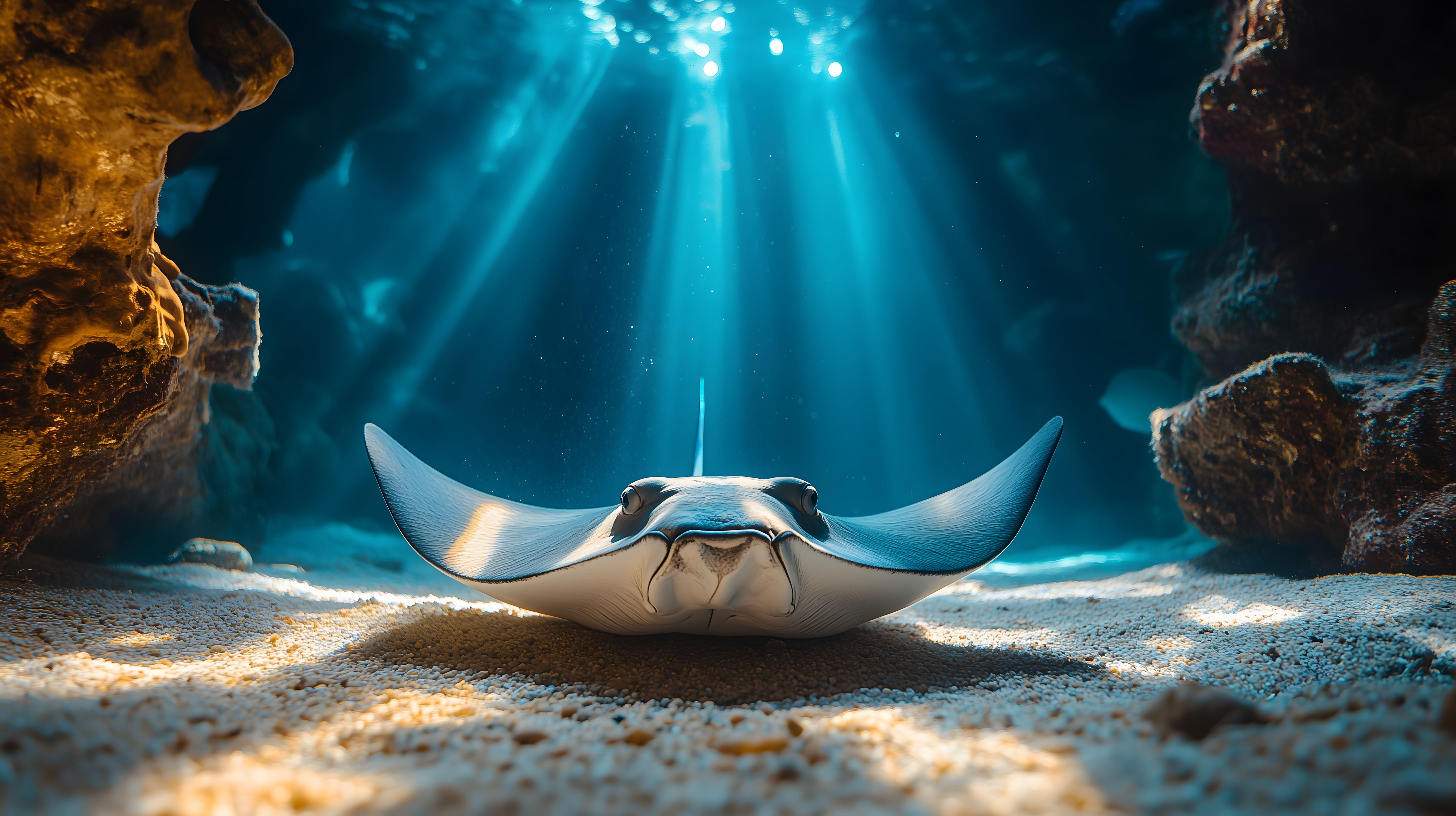 Das Bild zeigt einen friedlichen Rochen, der auf dem Meeresboden in einer faszinierenden Unterwasserwelt ruht. Die Szene ist von warmen, goldenen Farbtönen und kühlen, blauen Lichteffekten geprägt, die eine mystische und geheimnisvolle Atmosphäre schaffen. Der Rochen mit seiner markanten Form und Flossenkonstruktion erscheint in perfekter Harmonie mit seiner Umgebung aus Felsen und Riffs. Dieses Stockfoto in hoher Auflösung eignet sich hervorragend für Verwendungen in Blogs, Newslettern, Social-Media-Kanälen oder auch als Hintergrund für Werbematerialien. Es steht unter einer Creative-Commons-Lizenz zur freien Nutzung zur Verfügung.