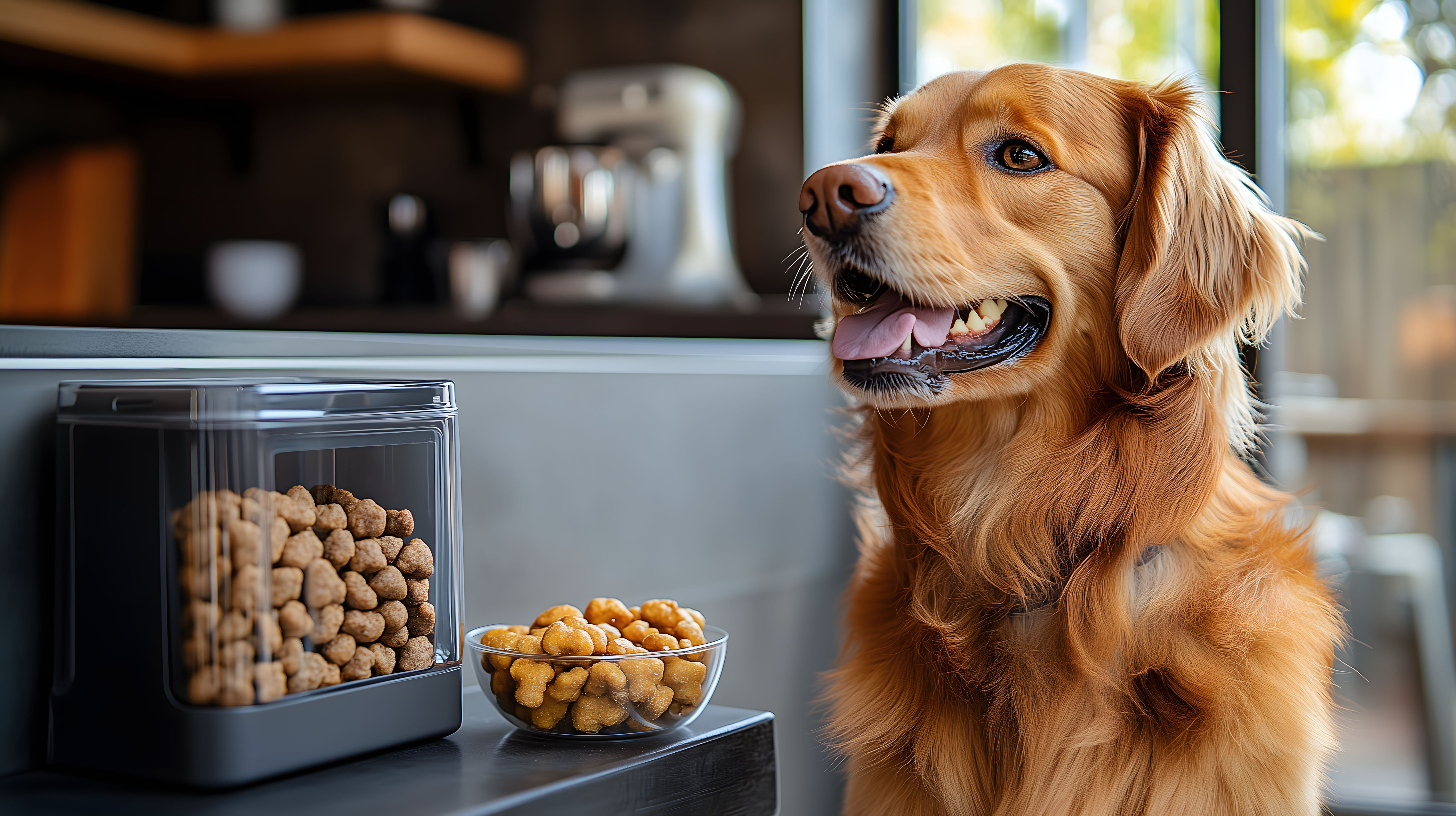 Das Bild zeigt einen Golden Retriever, der in einer modernen Küche vor einem Behälter mit Hundenäpfen sitzt. Der Hund blickt direkt in die Kamera und hat ein freundliches, zufriedenes Gesichtsausdruck. Die Küche ist hell und geräumig, mit großen Fenstern, die Tageslicht hereinlassen. Im Hintergrund sind weitere Küchenelementen aus Holz und Edelstahl zu sehen. Dieses stimmungsvolle Foto eignet sich hervorragend für die Verwendung in Artikeln, Blogbeiträgen oder Werbematerial rund um Haustiere, Ernährung und ein modernes, hundefreundliches Zuhause. Als hochauflösendes, kostenloses Stockfoto unter Creative-Commons-Lizenz kann es vielfältig eingesetzt werden.