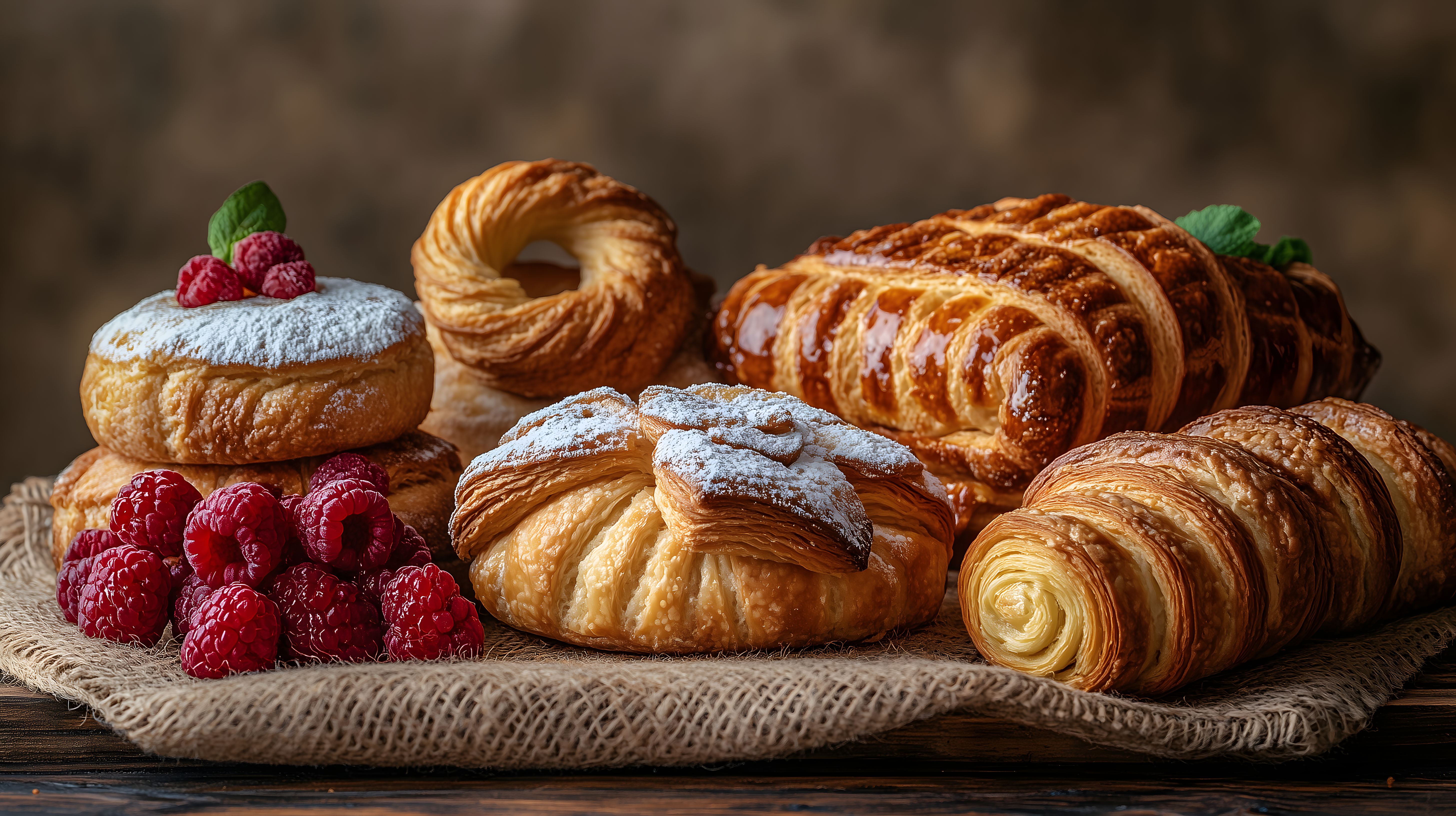 Dieses Foto zeigt eine schöne Auswahl an französischen Backwaren, angerichtet auf einem rustikalen Holzbrett und einem strukturierten Tuch. Im Mittelpunkt stehen einige knusprige Croissants, umgeben von Rosenkringeln, gefüllten Hörnchen und einem puderzuckerbetupften Gebäck. Frische, saftige Himbeeren ergänzen das appetitliche Arrangement. Die Farben sind warm und einladend, die Anordnung stilvoll und harmonisch. Dieses Stockfoto eignet sich perfekt als hochwertiges Bild für Blogs, Newsletter, Social-Media-Beiträge oder Werbemittel rund um Bäckereien, Cafés, Frühstücksangebote oder den Genuss französischer Backkunst. Es ist in hoher Auflösung und unter einer Creative-Commons-Lizenz verfügbar.