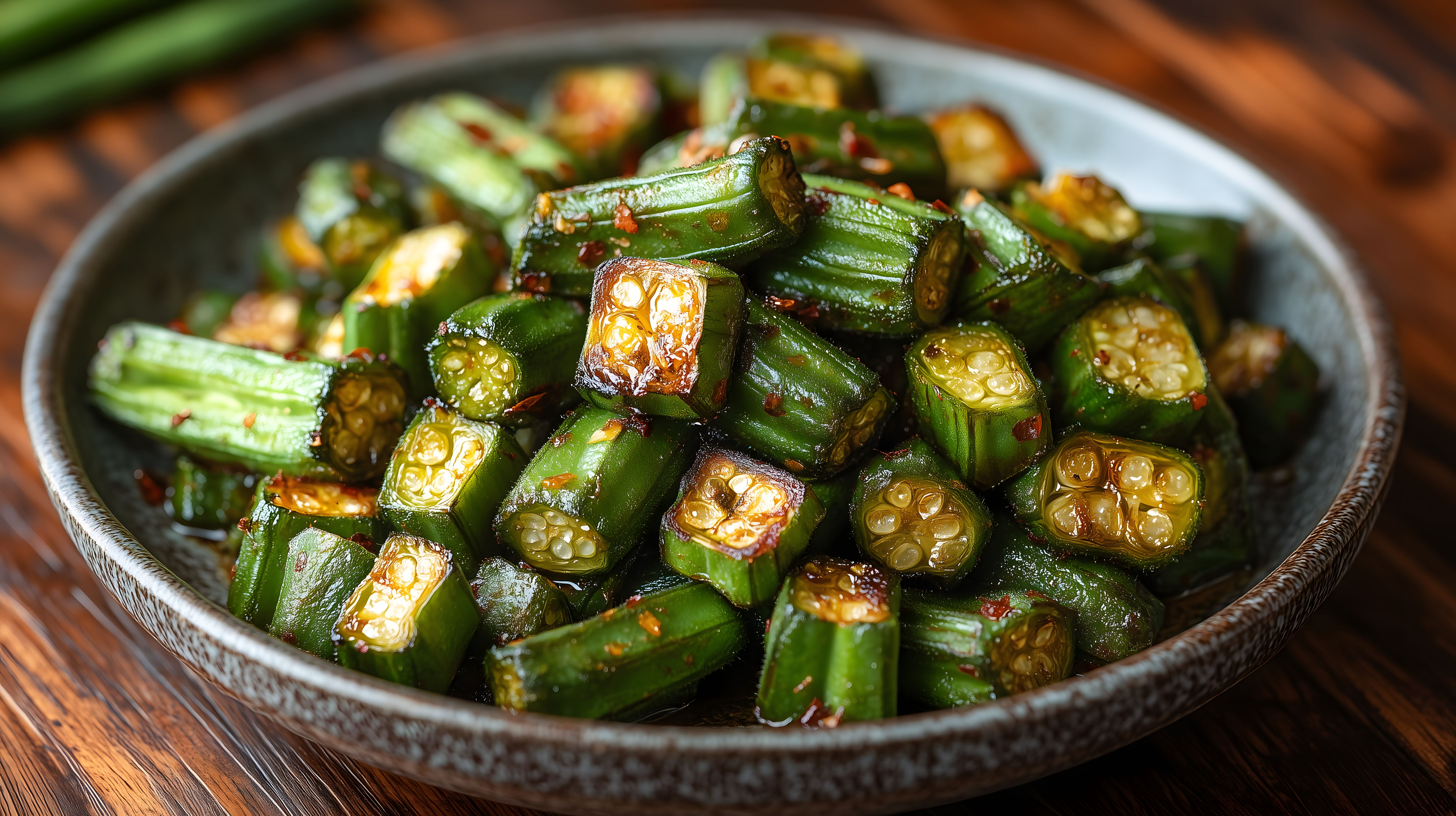 Dieses Foto zeigt einen köstlichen Okra-Salat in einer rustikalen Schale. Die grünen Okra-Stücke sind mit würzigen Gewürzen zubereitet und schön angerichtet. Der Salat besticht durch seine frische, natürliche Optik und wäre ideal für eine gesunde Mahlzeit oder die Verwendung in Rezepten, Blogbeiträgen oder Werbematerialien. Als kostenloses Stockfoto in hoher Auflösung unter Creative-Commons-Lizenz eignet es sich hervorragend für vielfältige digitale Anwendungen.
