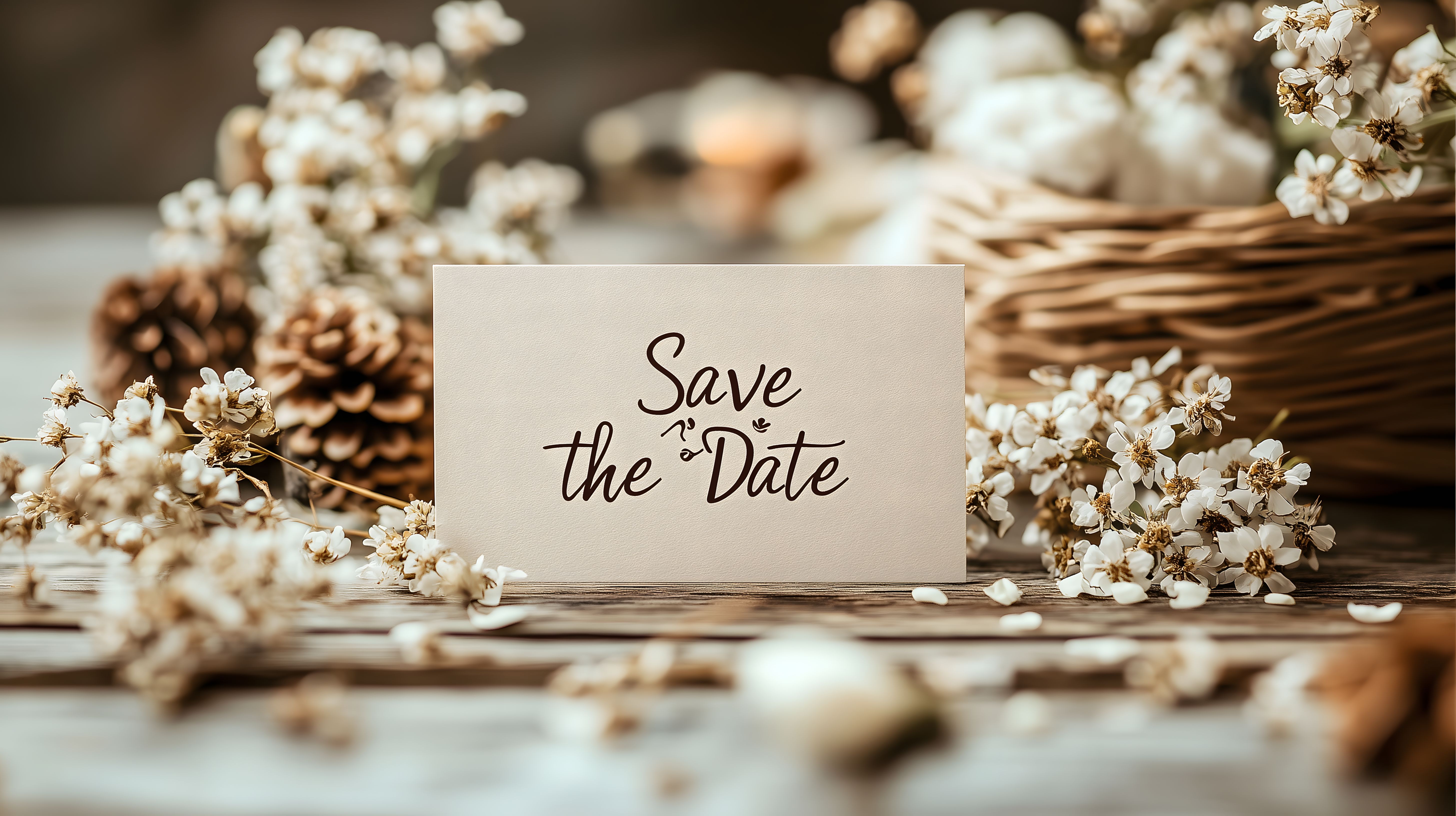 Dieses romantische Foto zeigt eine wunderschöne Einladungskarte mit der Aufschrift 'Save the Date' auf einem rustikalen Holztisch. Umgeben ist die Karte von Blumen, Blüten und Tannenzapfen, die eine natürliche, warme Atmosphäre schaffen. Die Komposition vermittelt Eleganz und Nostalgie, ideal für Hochzeitseinladungen, Jubiläumsankündigungen oder andere feierliche Anlässe. Als hochauflösendes Stockfoto unter Creative-Commons-Lizenz eignet es sich hervorragend für den Einsatz in Blogs, Newslettern oder Social-Media-Kanälen.