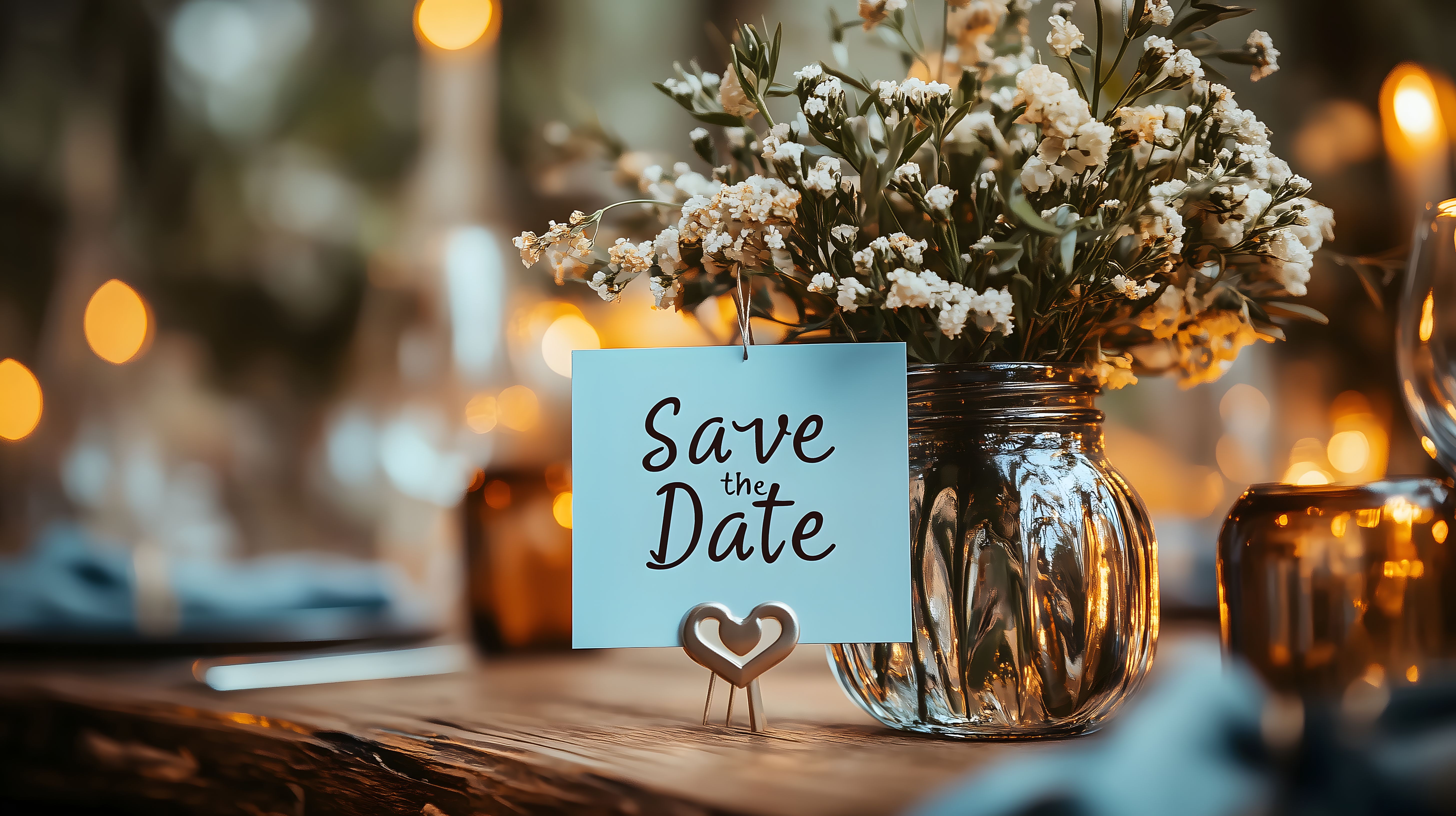 Das Bild zeigt eine feierliche Save-the-Date-Karte, die in einer Glasvase mit einem üppigen Blumenarrangement und Kerzenschein platziert ist. Der rustikale Holztisch sowie die weichen Lichteffekte schaffen eine romantische und einladende Atmosphäre. Dieses hochauflösende Stockfoto eignet sich perfekt für Einladungen, Hochzeitsblogbeiträge, Social-Media-Posts und andere Werbematerialien rund um Feiern und Veranstaltungen. Es steht unter einer Creative-Commons-Lizenz und kann kostenlos genutzt werden.