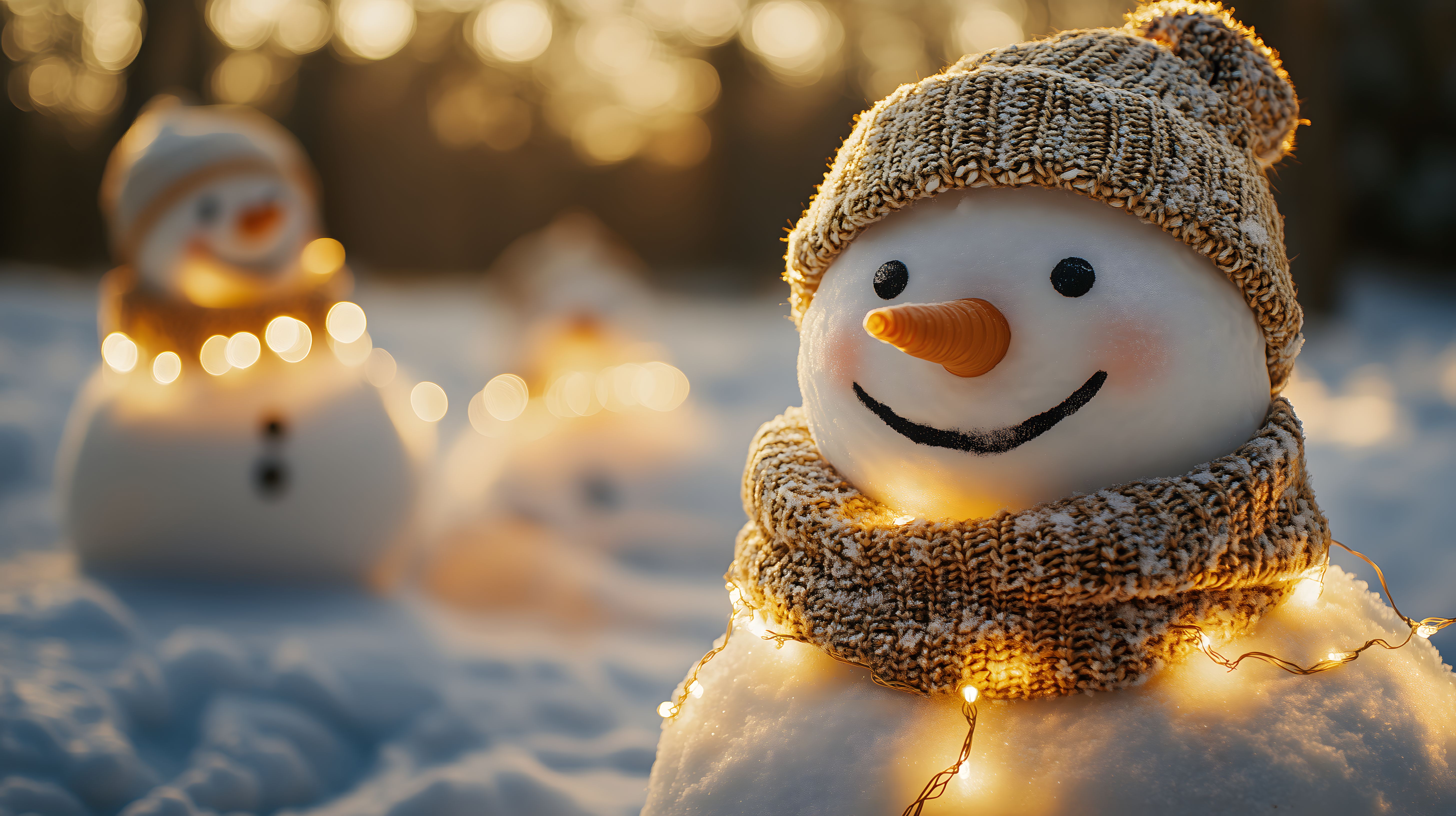 Das Bild zeigt zwei fröhlich lächelnde Schneemänner, die mit Lichterketten geschmückt sind, inmitten einer verschneiten Winterlandschaft. Der warme Lichtschein der Lichterketten zaubert eine gemütliche und einladende Atmosphäre. Die Schneemänner stehen auf einer Schneedecke, umgeben von verschneiten Bäumen, was eine idyllische, fast märchenhafte Winterstimmung erzeugt. Dieses kostenlose Stockfoto in hoher Auflösung eignet sich hervorragend für Weihnachts- und Winterthemen in Blogs, Newslettern, Social-Media-Kanälen oder Werbematerialien. Die Veröffentlichung erfolgt unter einer Creative-Commons-Lizenz.