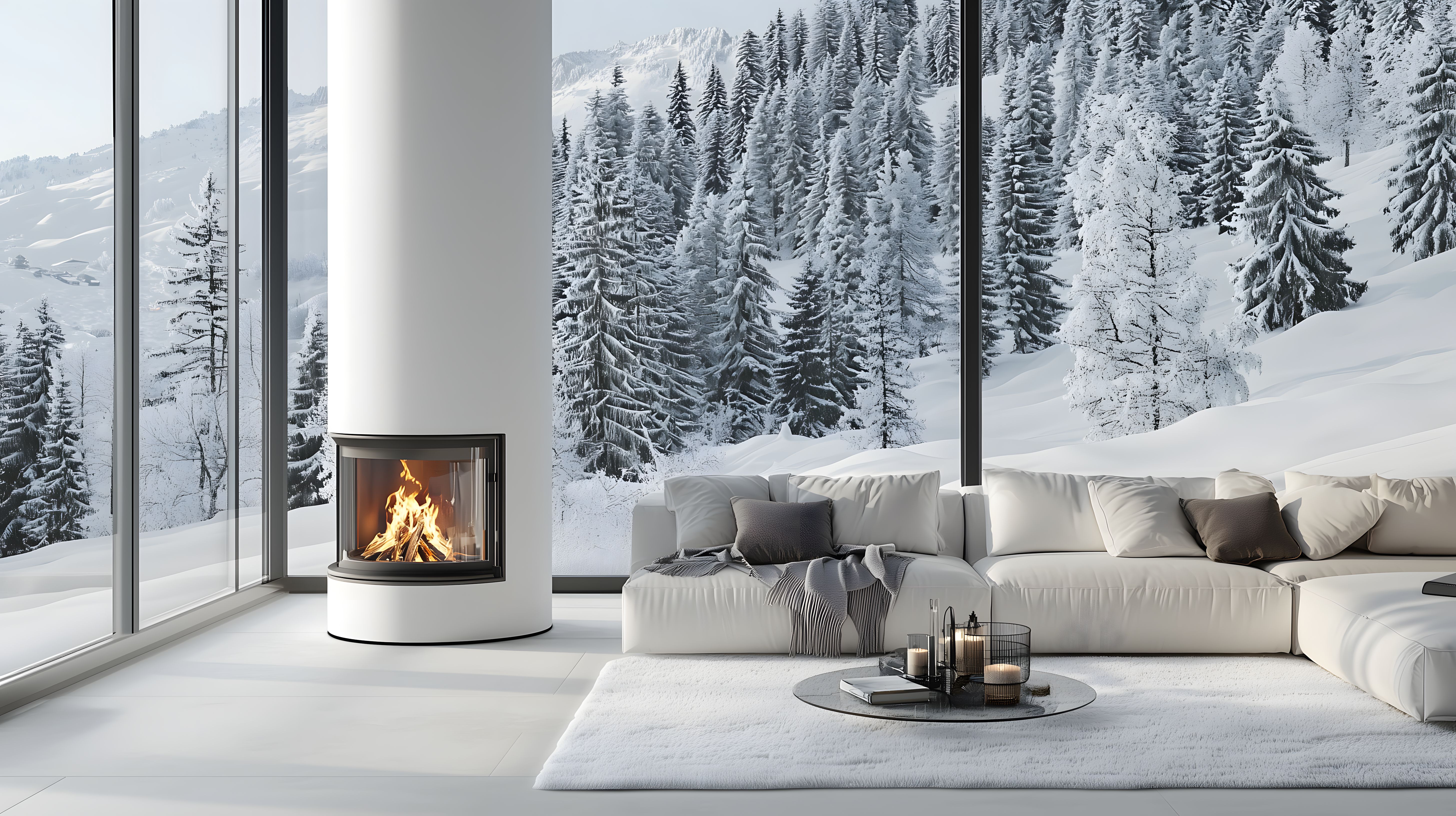 Dieses Foto zeigt ein elegantes, minimalistisches Wohnzimmer mit einem großen Panoramafenster, das einen atemberaubenden Blick auf eine verschneite Winterlandschaft bietet. Im Zentrum des Raums befindet sich ein moderner Kamin, der für eine gemütliche Atmosphäre sorgt. Das weißledernen Sofa und der Couchtisch mit schlichten Accessoires schaffen ein ruhiges, harmonisches Ambiente. Dieses Stockfoto eignet sich hervorragend für verschiedene Einsatzbereiche wie Blogs, Newsletter, Social-Media-Posts oder Werbematerialien zum Thema Inneneinrichtung, Architektur und Winterurlaub. Das hochauflösende Bild steht unter einer kostenlosen Creative-Commons-Lizenz zur Verfügung.