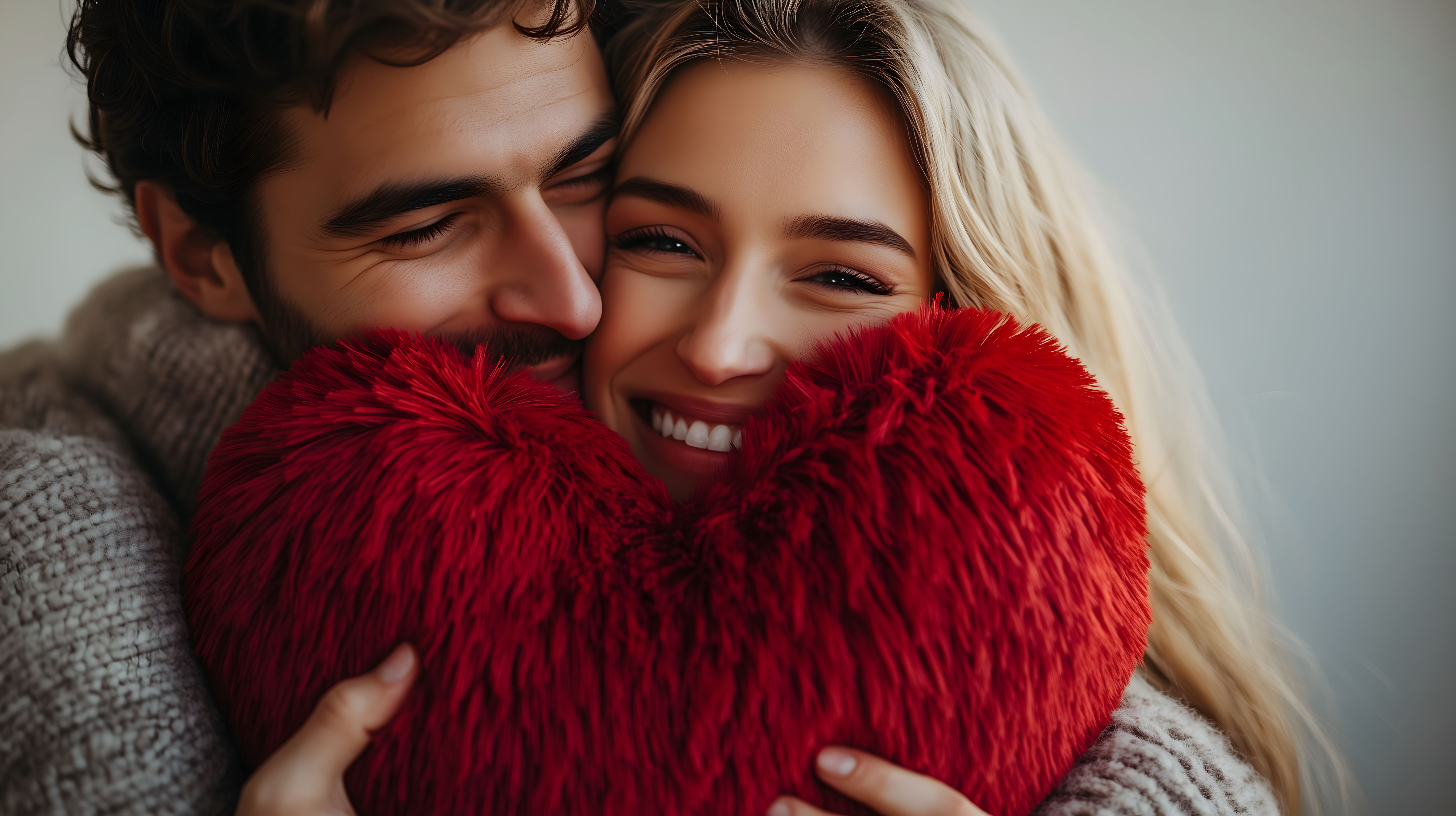 Dieses liebevolle Foto zeigt ein Paar, das sich innig umarmt und mit einem roten, flauschigen Herzkissen kuschelt. Die Szene strahlt Wärme, Zärtlichkeit und Vertrautheit aus. Die Blicke der beiden sind verliebt und glücklich, was eine romantische und sinnliche Stimmung vermittelt. Das Foto eignet sich perfekt für Blogs, Social-Media-Posts, Werbematerial und Grußkarten rund um Themen wie Liebe, Beziehungen, Valentinstag oder Hochzeiten. Mit seiner hohen Auflösung und Creative-Commons-Lizenz ist es ein kostenloses, vielseitig einsetzbares Stockfoto.