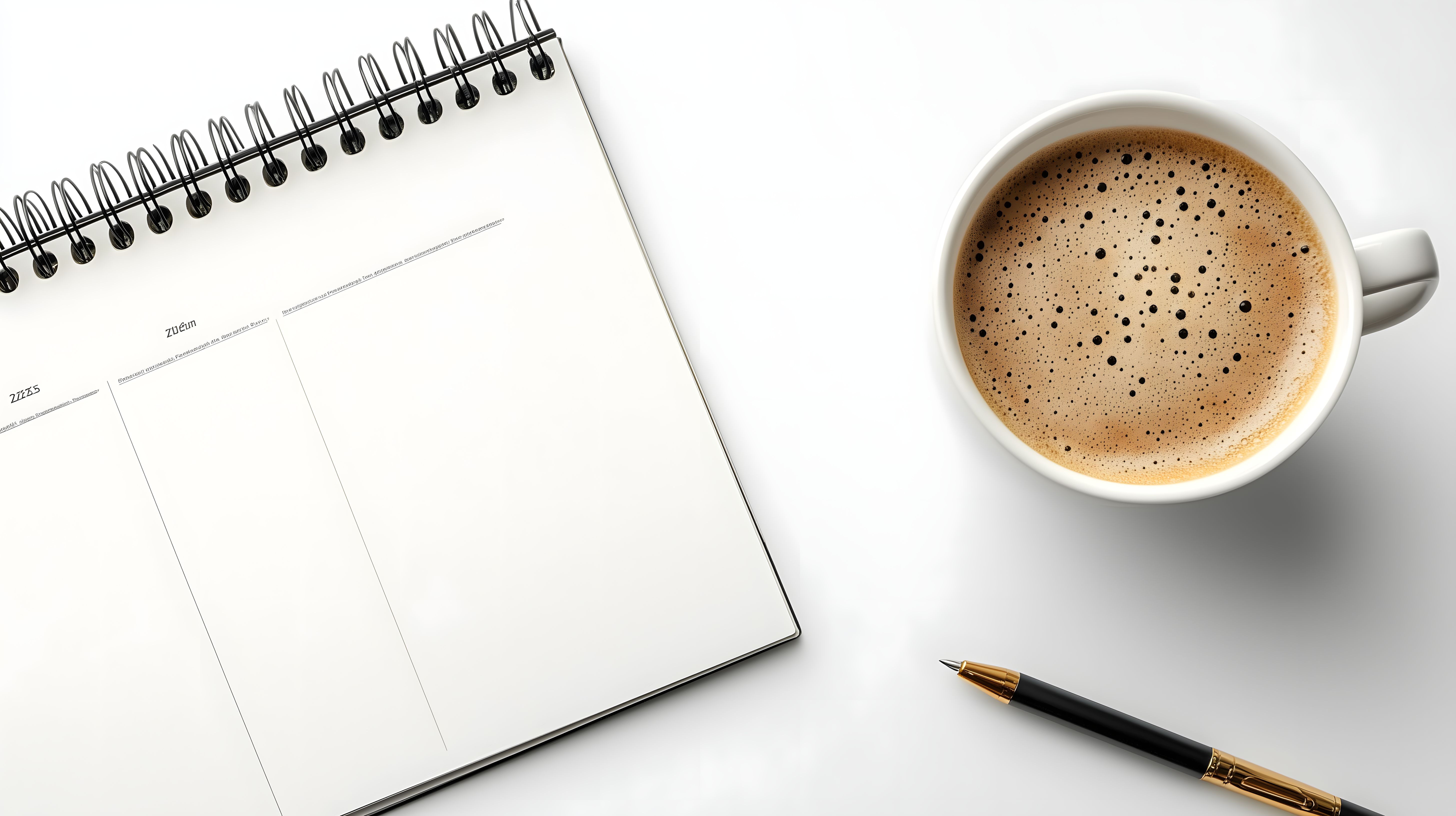 Dieses Bild zeigt einen aufgeräumten Arbeitsplatz mit einer Kaffeetasse, einem Kalender und einem Stift auf einer weißen Oberfläche. Die Draufsicht-Perspektive und das minimalistische Design schaffen einen aufgeräumten und produktiven Eindruck. Dieses hochauflösende Foto eignet sich perfekt als Stock-Foto für Blogs, Newsletter, soziale Medien oder Werbematerial zum Thema Büroorganisation, Produktivität und Arbeitsplatzgestaltung. Das Bild steht unter einer Creative-Commons-Lizenz zur kostenlosen Verwendung zur Verfügung.