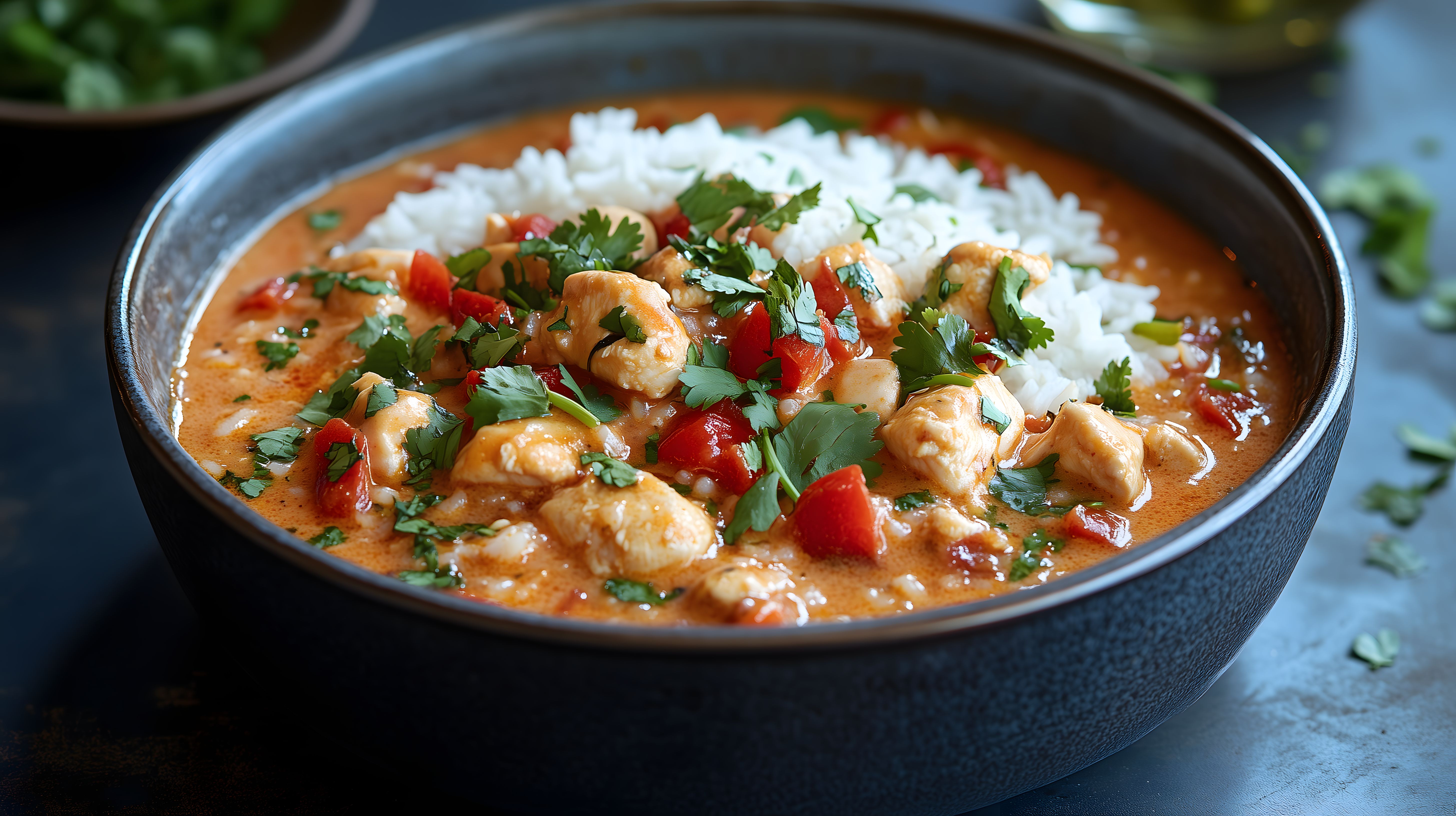 Dieses Foto zeigt einen köstlichen geschmorten Hähnchen-Tomatentopf, der auf Reis angerichtet ist. Das Gericht präsentiert sich in einer rustikalen schwarzen Schüssel und ist mit frischen Kräutern wie Petersilie dekoriert. Die Farben sind kräftig und einladend - das sahnige Orange der Tomatensauce, das zarte Weiß des Reises und das Grün der Kräuter ergeben ein appetitliches Bild. Dieses hochwertige Stockfoto eignet sich hervorragend für Kochrezepte, Foodblogs, Restaurantwebsites oder Werbekampagnen für gesunde, hausgemachte Mahlzeiten. Als kostenloses Stockfoto in hoher Auflösung und unter Creative-Commons-Lizenz können Sie es frei für Ihre Projekte nutzen.