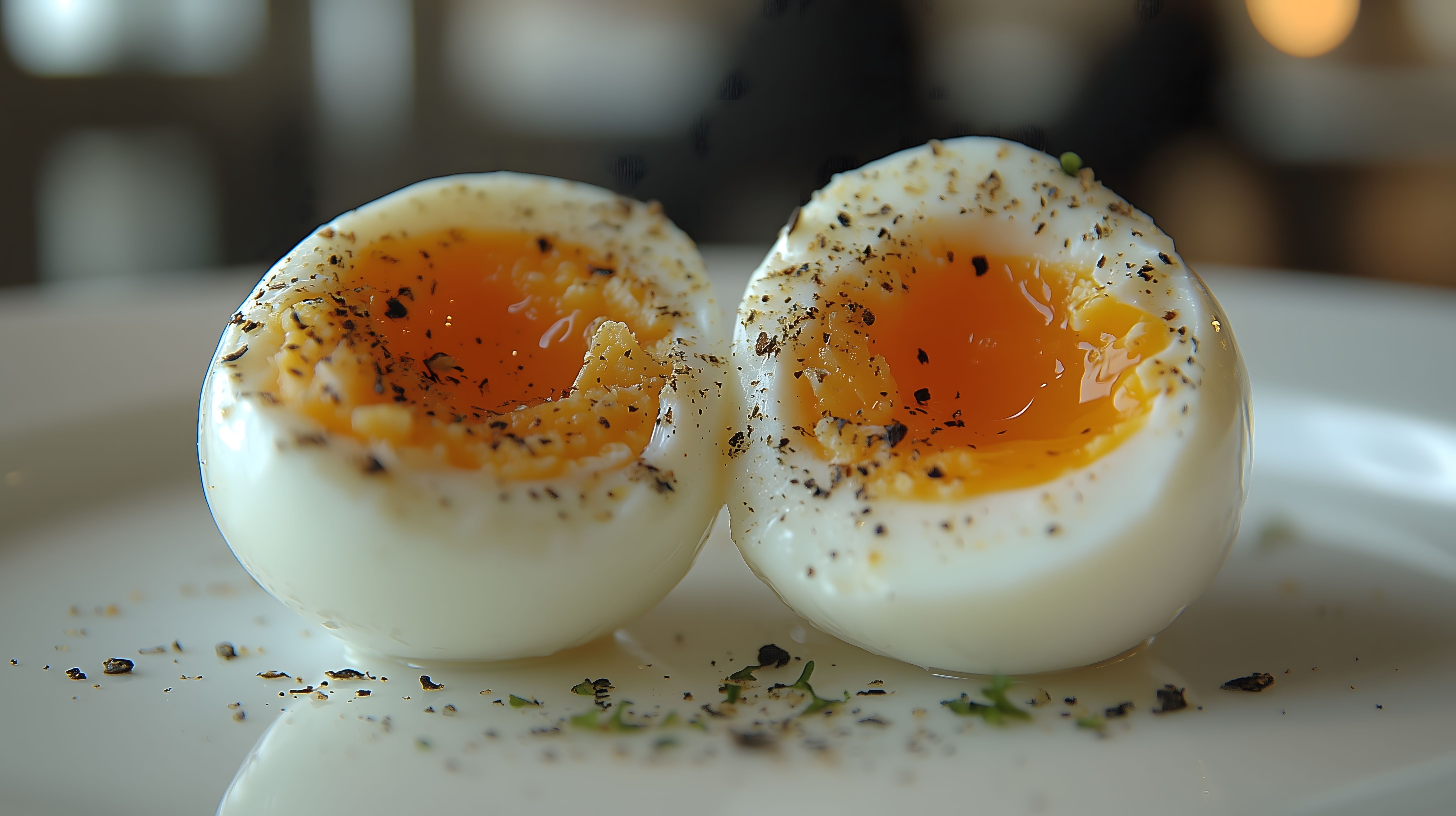 Dieses Foto zeigt zwei perfekt gekochte, weiche Eier auf einem weißen Teller. Die Oberfläche der Eier ist leicht gewölbt und von verschiedenen Gewürzen wie Pfeffer und Salz bestreut, was dem Gericht eine appetitliche Optik verleiht. Der Hintergrund ist leicht unscharf, was den Fokus auf die Hauptmotive lenkt. Diese Aufnahme wäre ideal für die Verwendung in Rezepten, Kochbüchern, Ernährungsblogs oder anderen Kontexten rund um das Thema Frühstück und gesunde Küche. Als hochauflösendes, kostenloses Stockfoto unter Creative-Commons-Lizenz eignet es sich hervorragend für vielfältige Anwendungen.