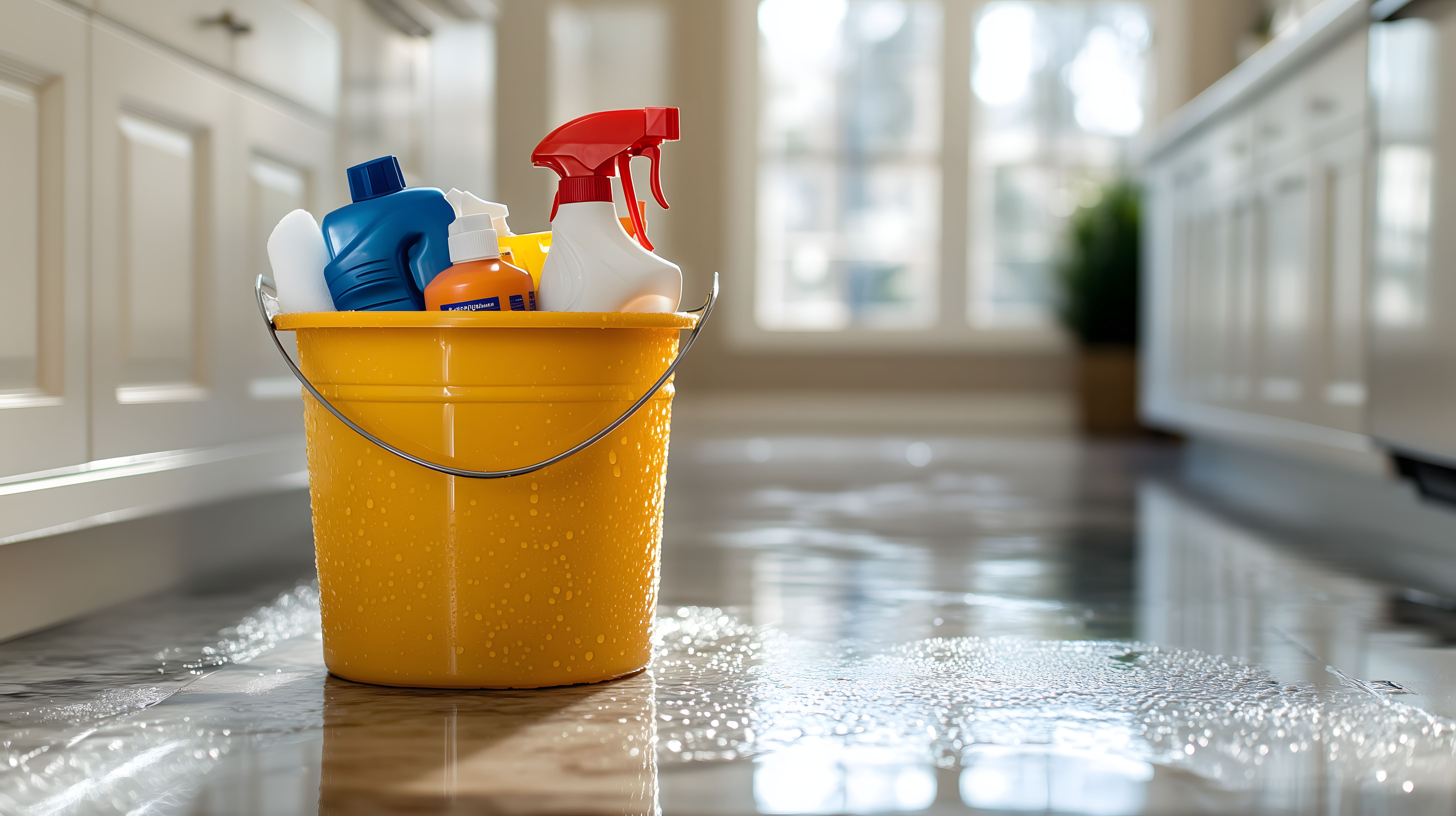 Das Bild zeigt einen gelben Putzeimer mit verschiedenen Reinigungsmitteln und Reinigungsutensilien in einer hellen, modernen Küche. Der Eimer steht auf einem Boden, der leicht feucht und glänzend erscheint, was den Eindruck von Sauberkeit und Ordnung vermittelt. Die Kombination aus den kräftigen Farben der Putzmittel und der transparenten, reflektierenden Oberfläche des Bodens schafft eine aufgeräumte und einladende Atmosphäre. Dieses Stockfoto eignet sich hervorragend für den Einsatz in Blogbeiträgen, Newslettern, Social-Media-Kanälen oder Werbematerialien rund um das Thema Hausarbeit, Reinigung und Ordnung. Das hochauflösende Bild ist unter einer Creative-Commons-Lizenz frei verfügbar.