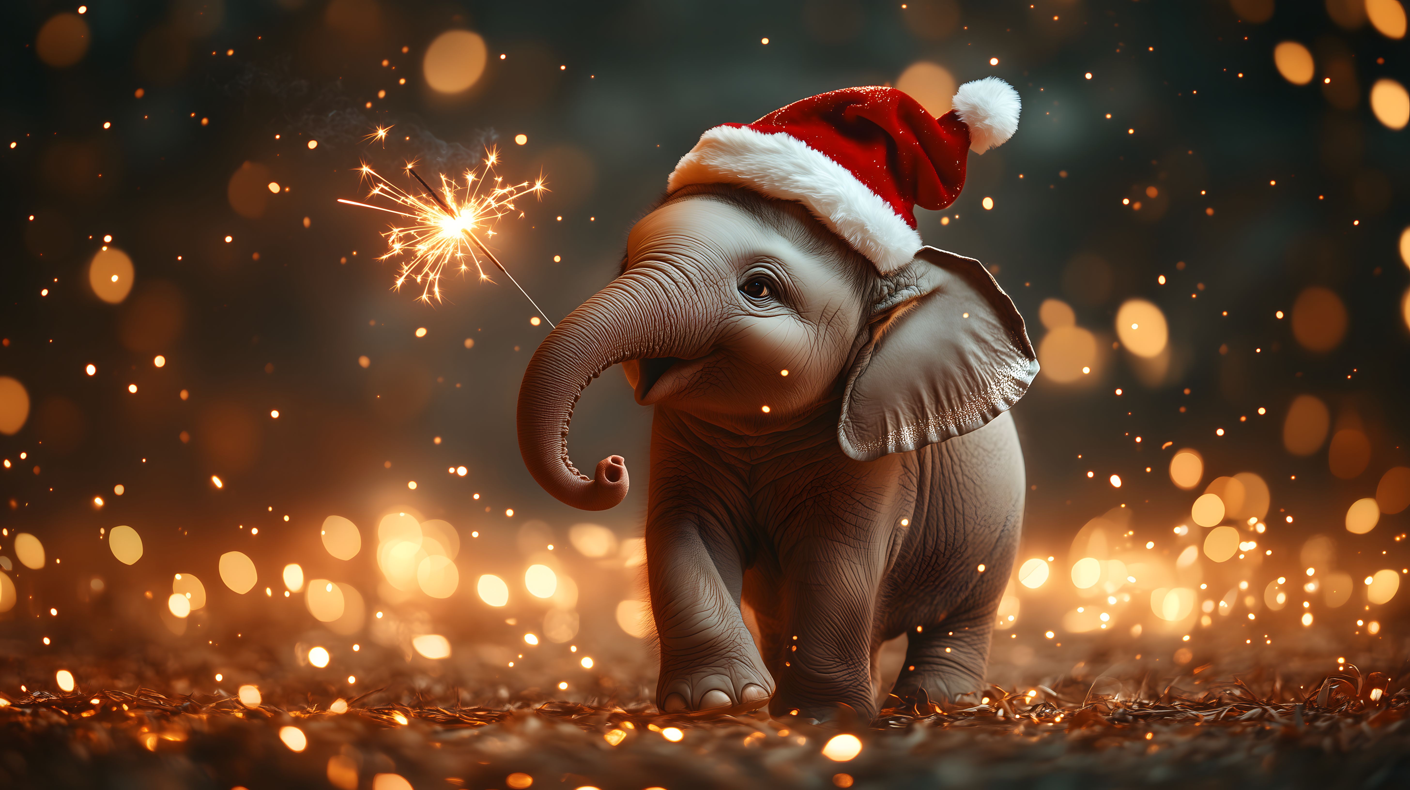 Dieses bezaubernde Foto zeigt einen Elefanten, der eine Weihnachtsmütze trägt und eine funkelnde Wunderkerze hält. Die warmen, goldenen Lichtreflexe und der glitzernde Hintergrund verleihen dem Bild eine festliche und fröhliche Atmosphäre. Dieses kostenlose Stockfoto in hoher Auflösung unter Creative-Commons-Lizenz eignet sich hervorragend für Weihnachtsdekorationen, Grußkarten, Blogbeiträge und vieles mehr. Der Elefant strahlt pure Freude und Lebensfreude aus und verleiht jedem Projekt einen besonderen Zauber.