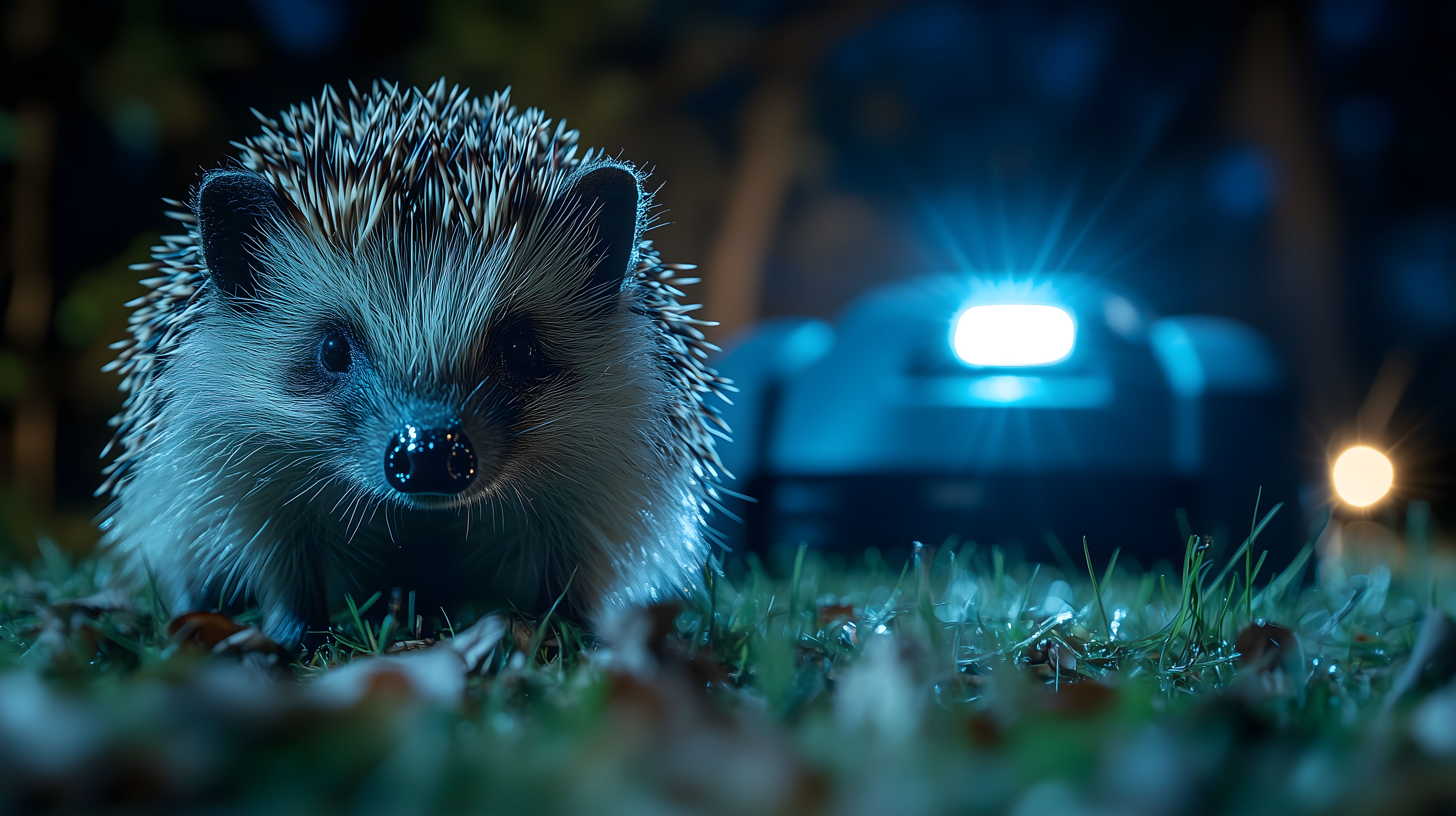 Das Foto zeigt einen Igel, der in einer stimmungsvollen Nachtlandschaft auf einer Wiese liegt. Im Hintergrund ist ein Rasenmäher zu sehen, der eine potenzielle Gefahr für das Tier darstellt. Die Szene ist in ein blaues, mystisches Licht getaucht, das der Atmosphäre eine besondere Spannung verleiht. Das Bild eignet sich hervorragend als kostenloses Stockfoto für Blog-Beiträge, Newsletter oder soziale Medien, die eine natürliche und zugleich dramatische Stimmung vermitteln wollen. Die hohe Auflösung und die Creative-Commons-Lizenz machen es zu einem flexibel einsetzbaren Bildmotiv.