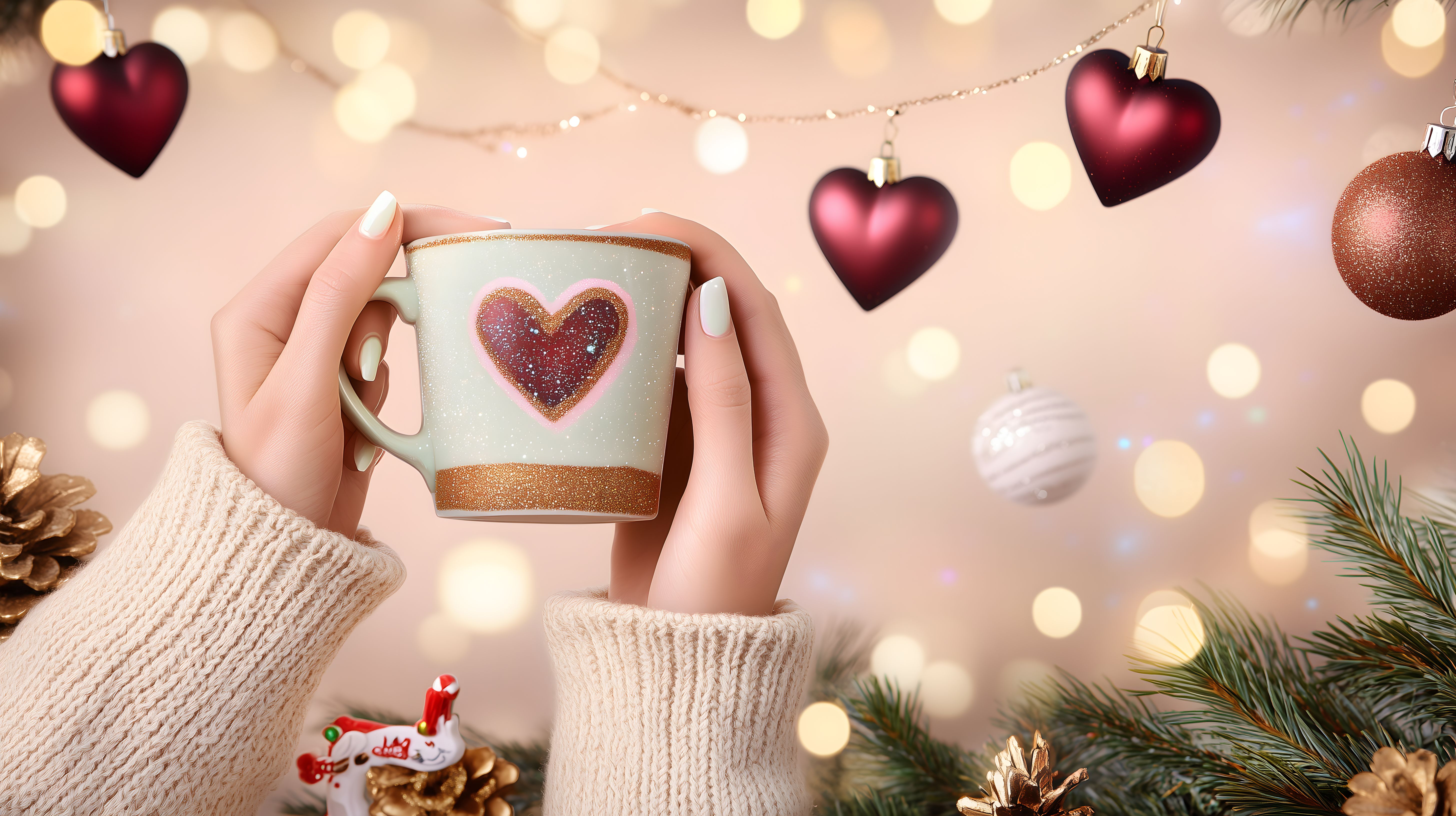 Dieses winterliche Weihnachtsfoto zeigt eine Detailaufnahme von Händen, die eine Kaffeetasse mit einem funkelnden Herz-Motiv halten. Im Hintergrund sind Lichterketten, Tannenzweige und rote Weihnachtskugeln zu sehen, die eine gemütliche, festliche Stimmung schaffen. Das Bild versprüht eine warme, gemütliche Atmosphäre und eignet sich perfekt als Hintergrundbild für Weihnachtsblogs, Newsletter oder Social-Media-Posts. Das hochauflösende Stockfoto ist unter einer Creative-Commons-Lizenz verfügbar und kann daher kostenfrei verwendet werden.