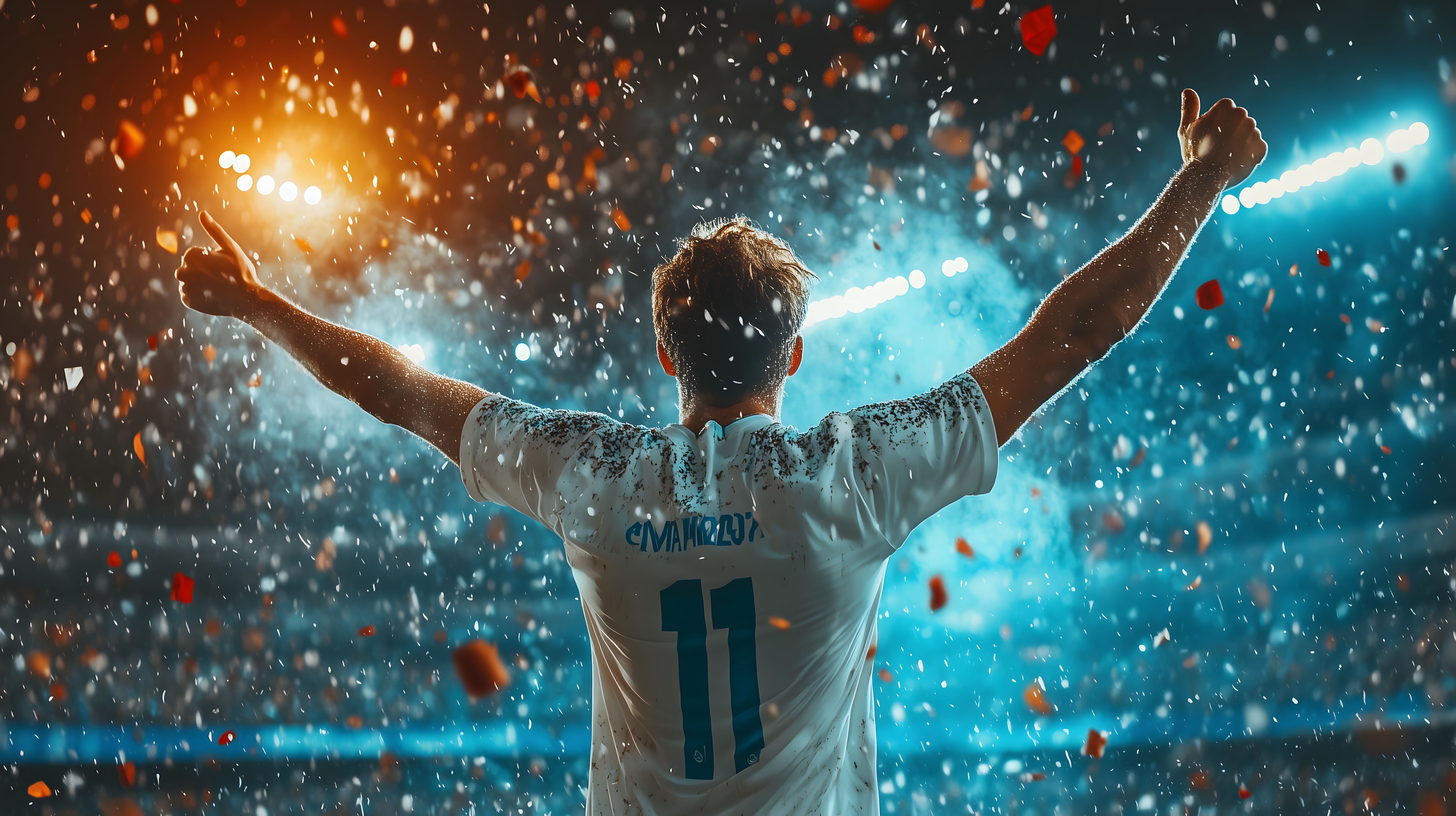 Dieses eindrucksvolle Foto zeigt einen Fußballspieler, der nach einem Sieg auf dem Spielfeld mit ausgebreiteten Armen in einem Konfetti-Regen jubelt. Die Szene ist voller Dynamik und Freude, die durch die warmen Farbtöne und den verschwommenen Hintergrund noch verstärkt wird. Das Bild wäre ideal für die Verwendung in Sportberichten, Werbematerialien oder auch auf Social-Media-Kanälen, um Erfolg, Begeisterung und Feierlaune zu vermitteln. Als kostenloses Stockfoto in hoher Auflösung und unter einer Creative-Commons-Lizenz ist es flexibel einsetzbar.
