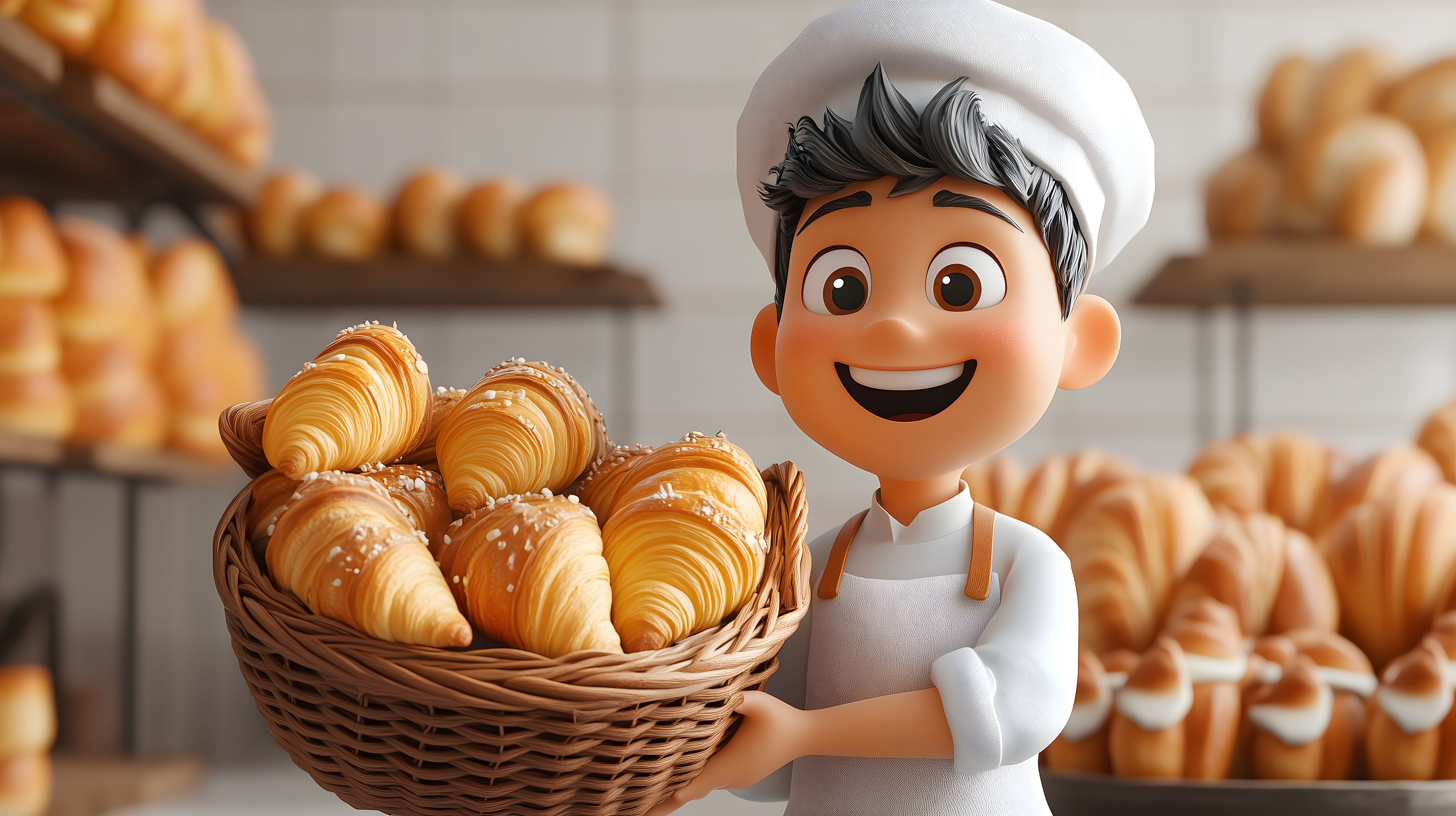 Das Bild zeigt einen fröhlichen, 3D-animierten Bäcker, der einen Korb voller frisch gebackener Croissants in seinen Händen hält. Er trägt eine weiße Kochmütze und ein Lächeln auf seinem Gesicht, was die Freude an seiner Arbeit widerspiegelt. Im Hintergrund sind weitere Regale mit Backwaren zu sehen, die eine authentische Bäckereikulisse schaffen. Dieses Stockfoto eignet sich hervorragend für den Einsatz in Blogs, Newslettern, Social-Media-Kanälen oder Werbematerialien rund um das Thema Backwaren, Frühstück oder französische Küche. Das Bild ist in hoher Auflösung und unter einer Creative-Commons-Lizenz frei verwendbar.